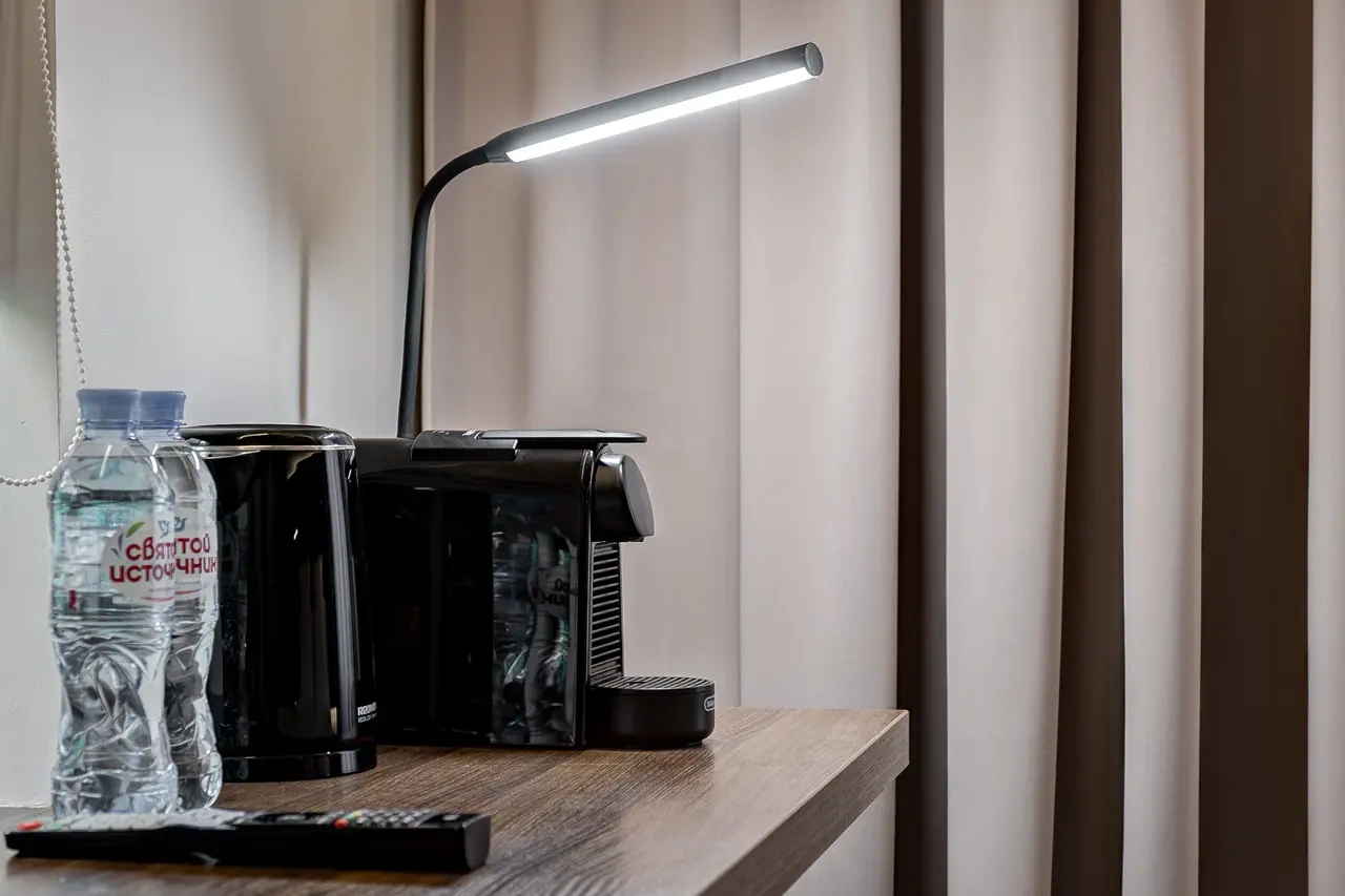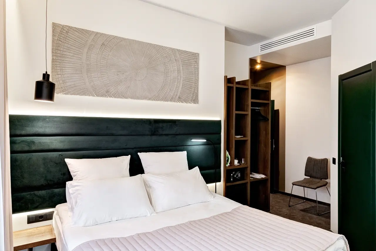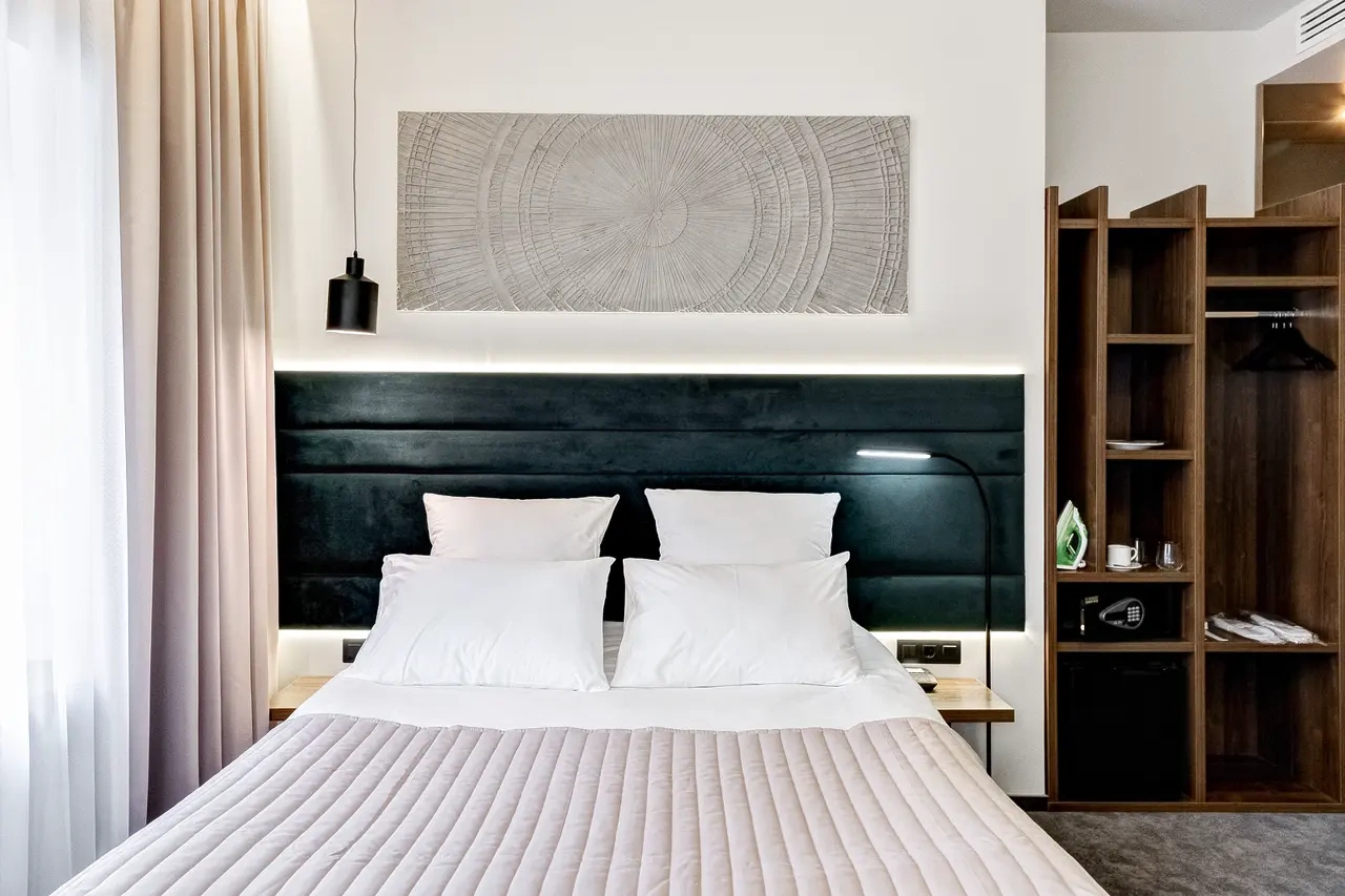 Номера категории "Стандарт" предлагают гостям все необходимое для плодотворной работы и полноценного отдыха. В номере "Стандарт" вы найдете все необходимое для приятного отдыха. Он оборудован удобной кроватью 140см с мягким матрасом и свежим постельным бельем, где вы сможете отдохнуть после насыщенного дня. В номере также имеется рабочее место с письменным столом и стулом, где вы можете выполнять свои деловые задачи или просто организовать свою работу. Для вашего удобства в номере "Стандарт" есть телевизор с широким выбором каналов, чтобы вы могли насладиться своими любимыми программами или фильмами. Также в номере есть бесплатный Wi-Fi, чтобы вы могли оставаться на связи и пользоваться интернетом без ограничений, чайная станция,кофемашина, мини холодильник и индивидуальный сейф для ценных вещей и документов. В собственной ванной комнате с душем вы найдете все необходимые туалетно-косметические принадлежности, включая полотенца, халат, шампунь, гель для душа, мыло и фен. Номера категории "Стандарт" предлагают пространство, где вы сможете отдохнуть и расслабиться после долгого дня. Они идеально подходят для индивидуальных путешественников или деловых поездок.