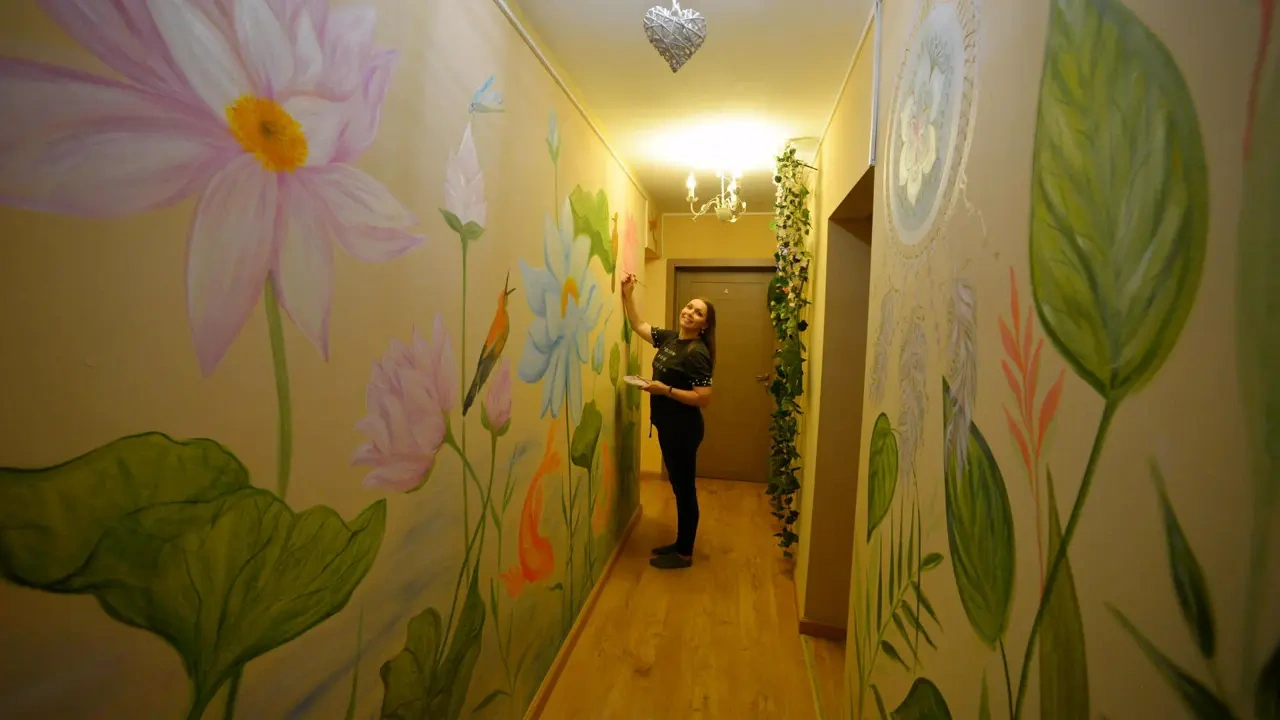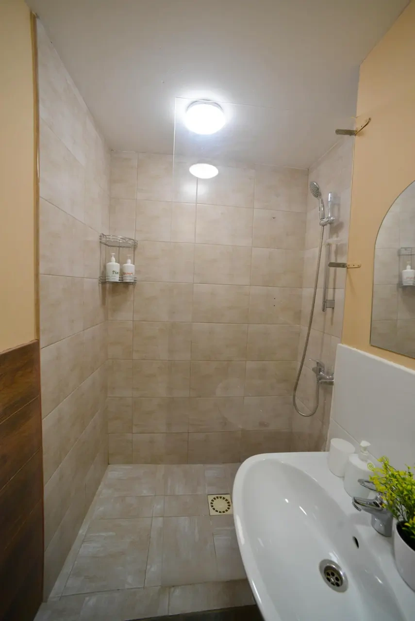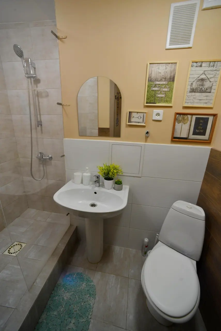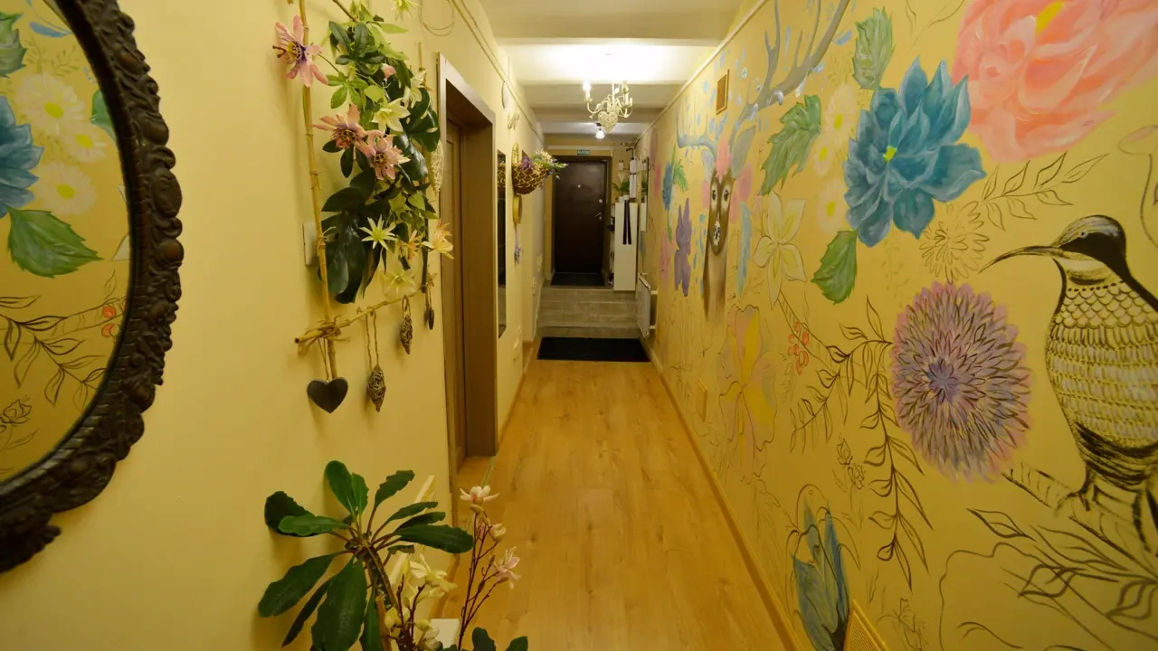 Каждый номер нашего отеля имеет индивидуальный дизайн, стены превращены в огромные картины с позитивными жизнеутверждающими мотивами. В этом просторном семейном номере могут разместиться до 4-х человек. В номере 1 двуспальная кровать и широкий раскладывающийся диван. Номер оснащен всем необходимым: постельное белье, полотенца, телевизор с плоским экраном, бесплатный Wi-Fi, электрический чайник с чайными принадлежностями, фен, туалетно-косметические принадлежности, тапочки. В общем доступе гостей имеется холодильник, микроволновая печь, стиральная машина (за отдельную плату). Номер имеет общую ванную комнату и туалет (3 ванных комнаты и туалета на 6 номеров).