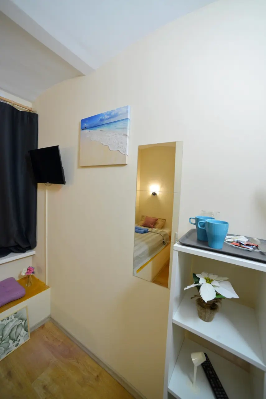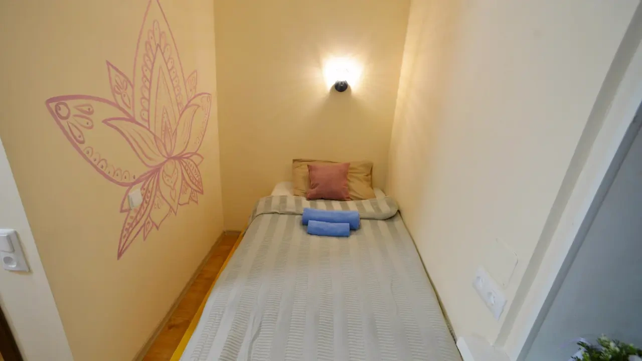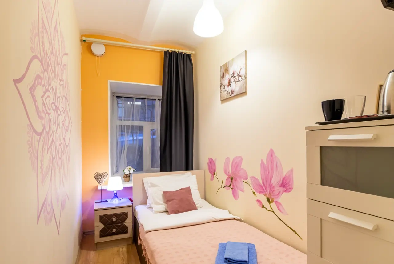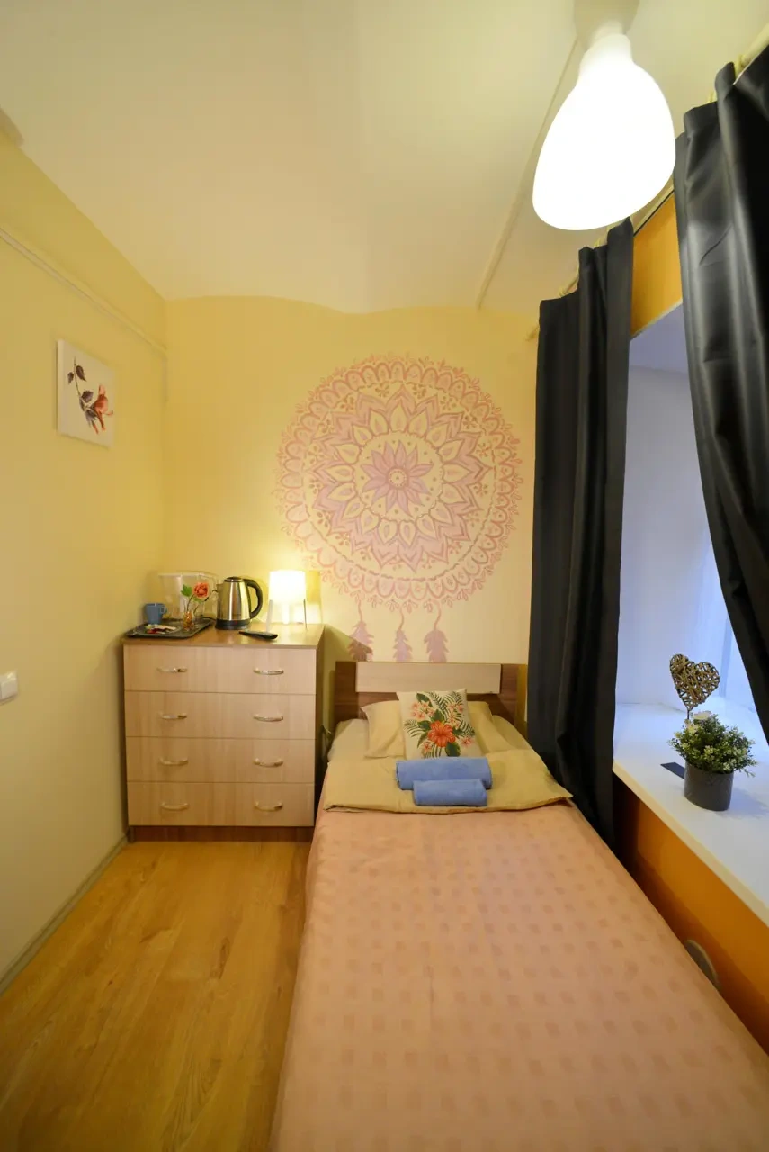 Каждый номер нашего отеля имеет индивидуальный дизайн, стены превращены в огромные картины с позитивными жизнеутверждающими мотивами. В этом небольшом уютном номере может разместиться 1 человек. В номере 1 односпальная кровать. Номер оснащен всем необходимым: постельное белье, полотенца, телевизор с плоским экраном, бесплатный Wi-Fi, электрический чайник с чайными принадлежностями, фен, туалетно-косметические принадлежности, тапочки. В общем доступе гостей имеется холодильник, микроволновая печь, стиральная машина (за отдельную плату). Номер имеет общую ванную комнату и туалет (3 ванных комнаты и туалета на 6 номеров).
