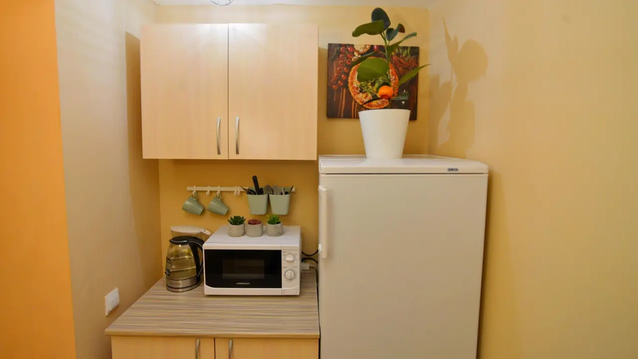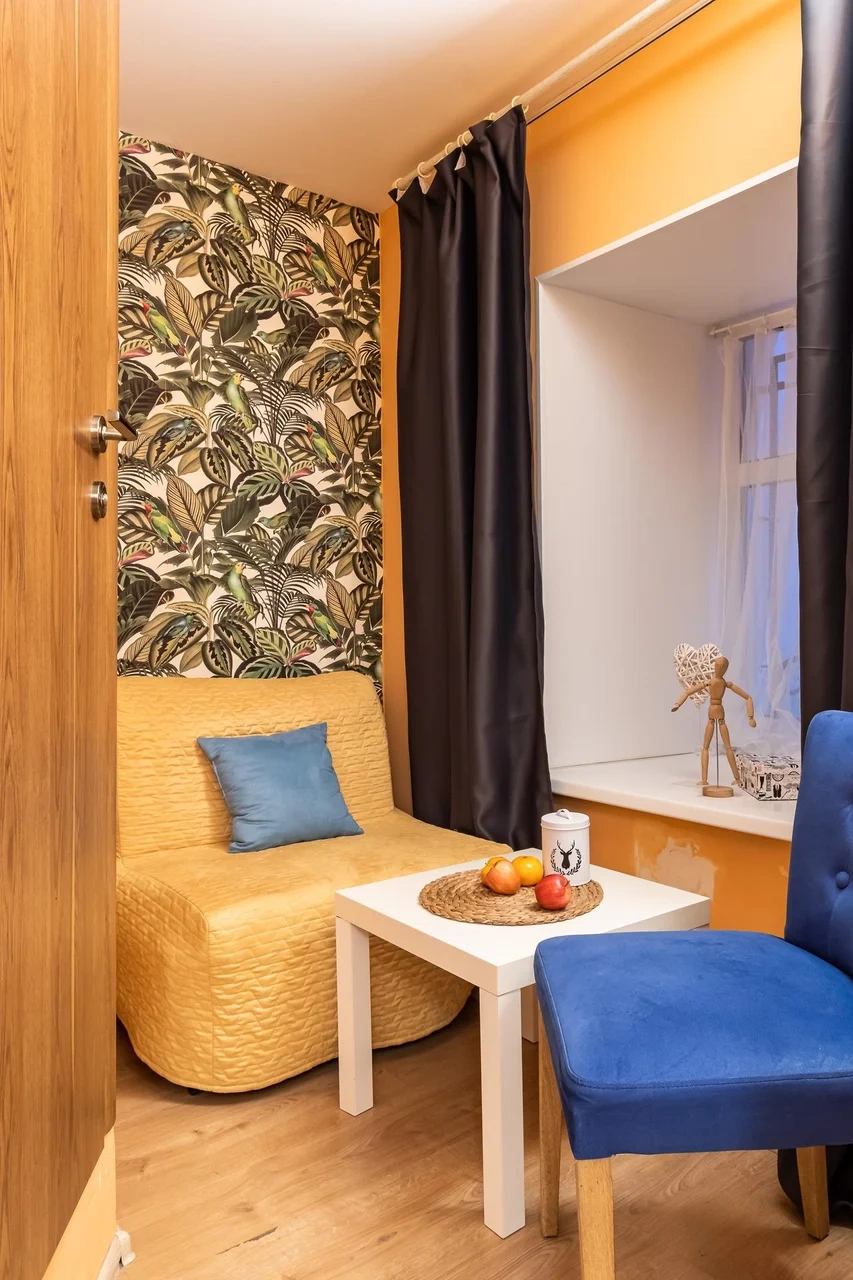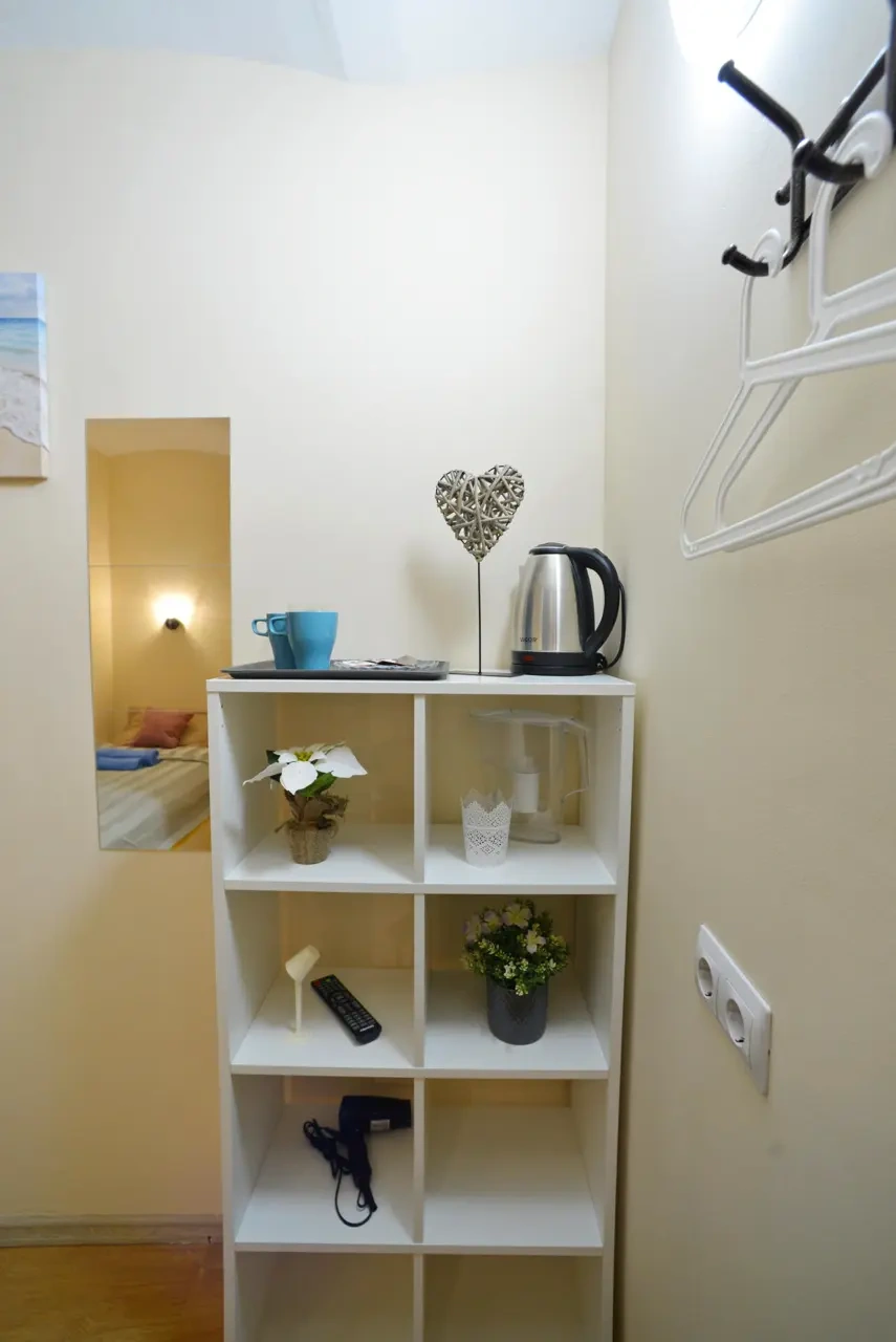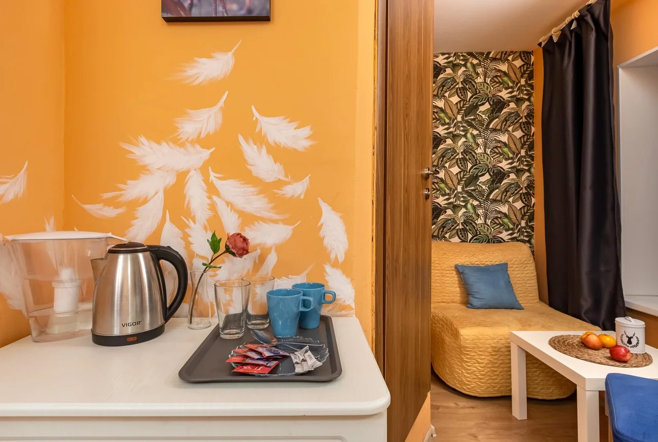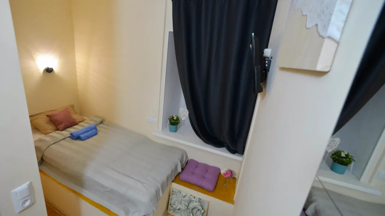 Каждый номер нашего отеля имеет индивидуальный дизайн, стены превращены в огромные картины с позитивными жизнеутверждающими мотивами. В этом небольшом уютном номере может разместиться 1 человек. В номере 1 односпальная кровать. Номер оснащен всем необходимым: постельное белье, полотенца, телевизор с плоским экраном, бесплатный Wi-Fi, электрический чайник с чайными принадлежностями, фен, туалетно-косметические принадлежности, тапочки. В общем доступе гостей имеется холодильник, микроволновая печь, стиральная машина (за отдельную плату). Номер имеет общую ванную комнату и туалет (3 ванных комнаты и туалета на 6 номеров).