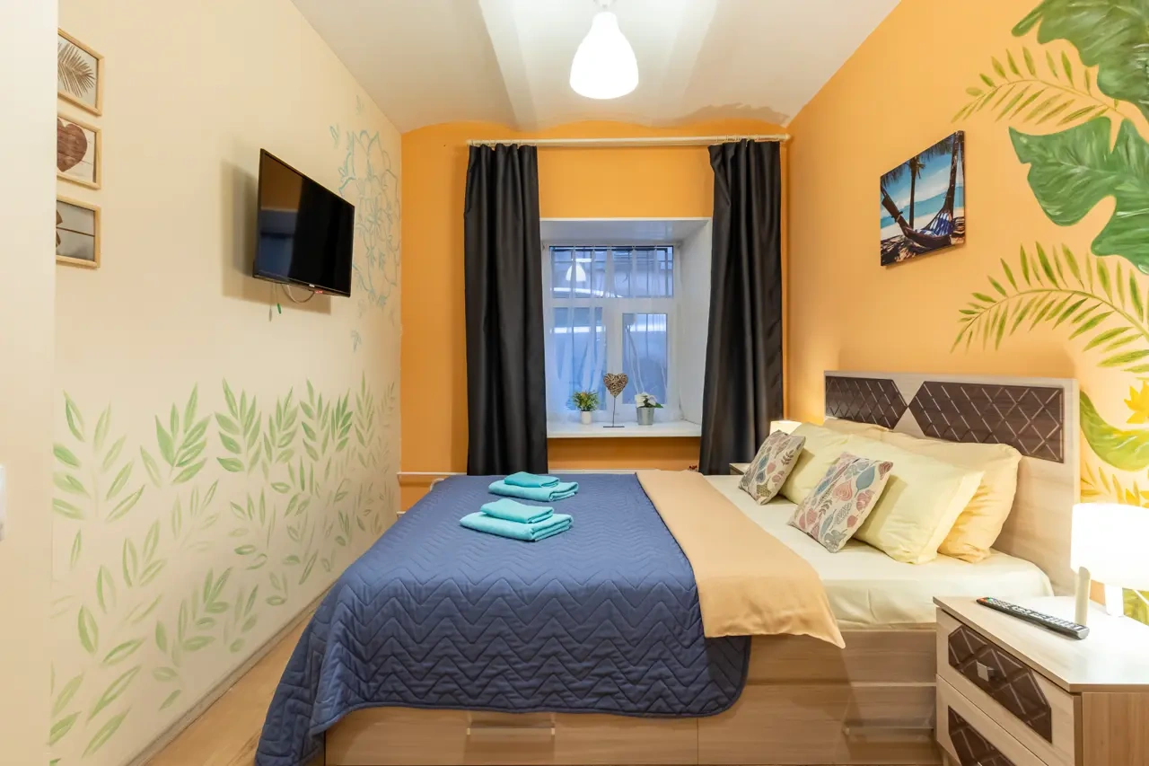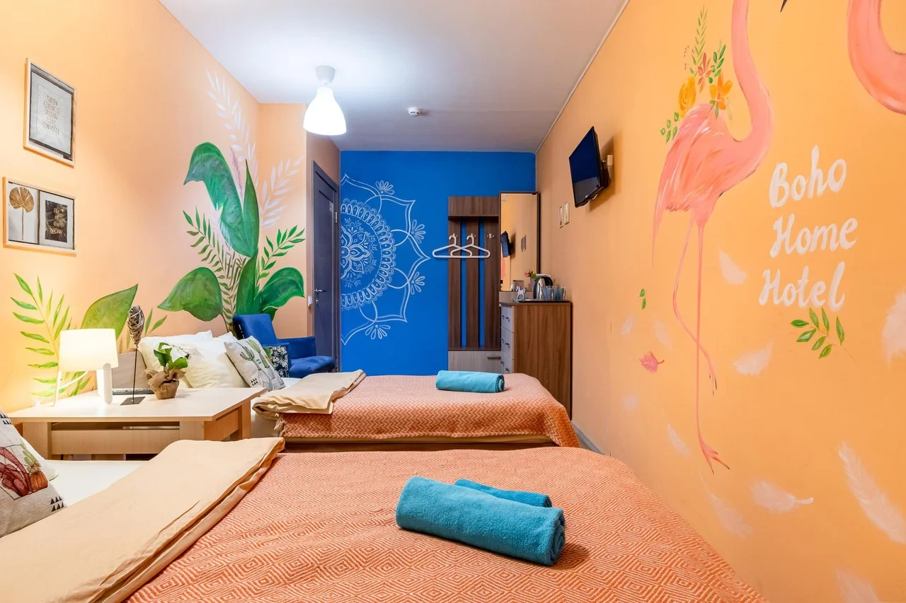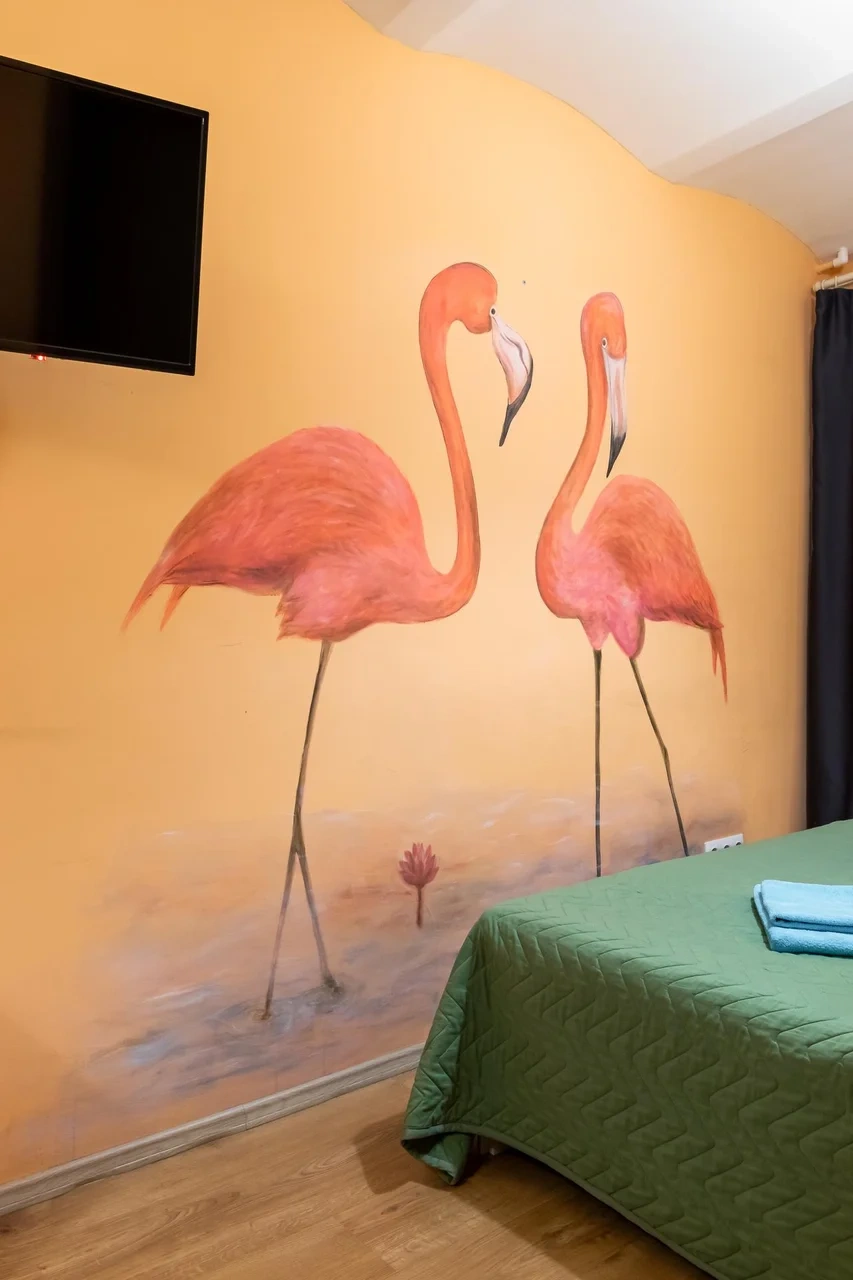 Каждый номер нашего отеля имеет индивидуальный дизайн, стены превращены в огромные картины с позитивными жизнеутверждающими мотивами. В этом двухместном номере могут разместиться до 3-х человек. В номере 1 двуспальная кровать и удобное раскладывающееся кресло. Номер оснащен всем необходимым: постельное белье, полотенца, телевизор с плоским экраном, бесплатный Wi-Fi, электрический чайник с чайными принадлежностями, фен, туалетно-косметические принадлежности, тапочки. В общем доступе гостей имеется холодильник, микроволновая печь, стиральная машина (за отдельную плату). Номер имеет собственную ванную комнату/туалет.