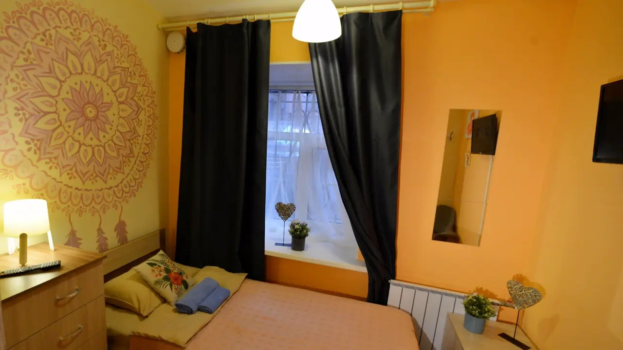 Каждый номер нашего отеля имеет индивидуальный дизайн, стены превращены в огромные картины с позитивными жизнеутверждающими мотивами. В этом номере могут разместиться до 2-х человек. В номере 1 двуспальная кровать. Номер оснащен всем необходимым: постельное белье, полотенца, телевизор с плоским экраном, бесплатный Wi-Fi, электрический чайник с чайными принадлежностями, фен, туалетно-косметические принадлежности, тапочки. В общем доступе гостей имеется холодильник, микроволновая печь, стиральная машина (за отдельную плату). Номер имеет общую ванную комнату и туалет (3 ванных комнаты и туалета на 6 номеров).