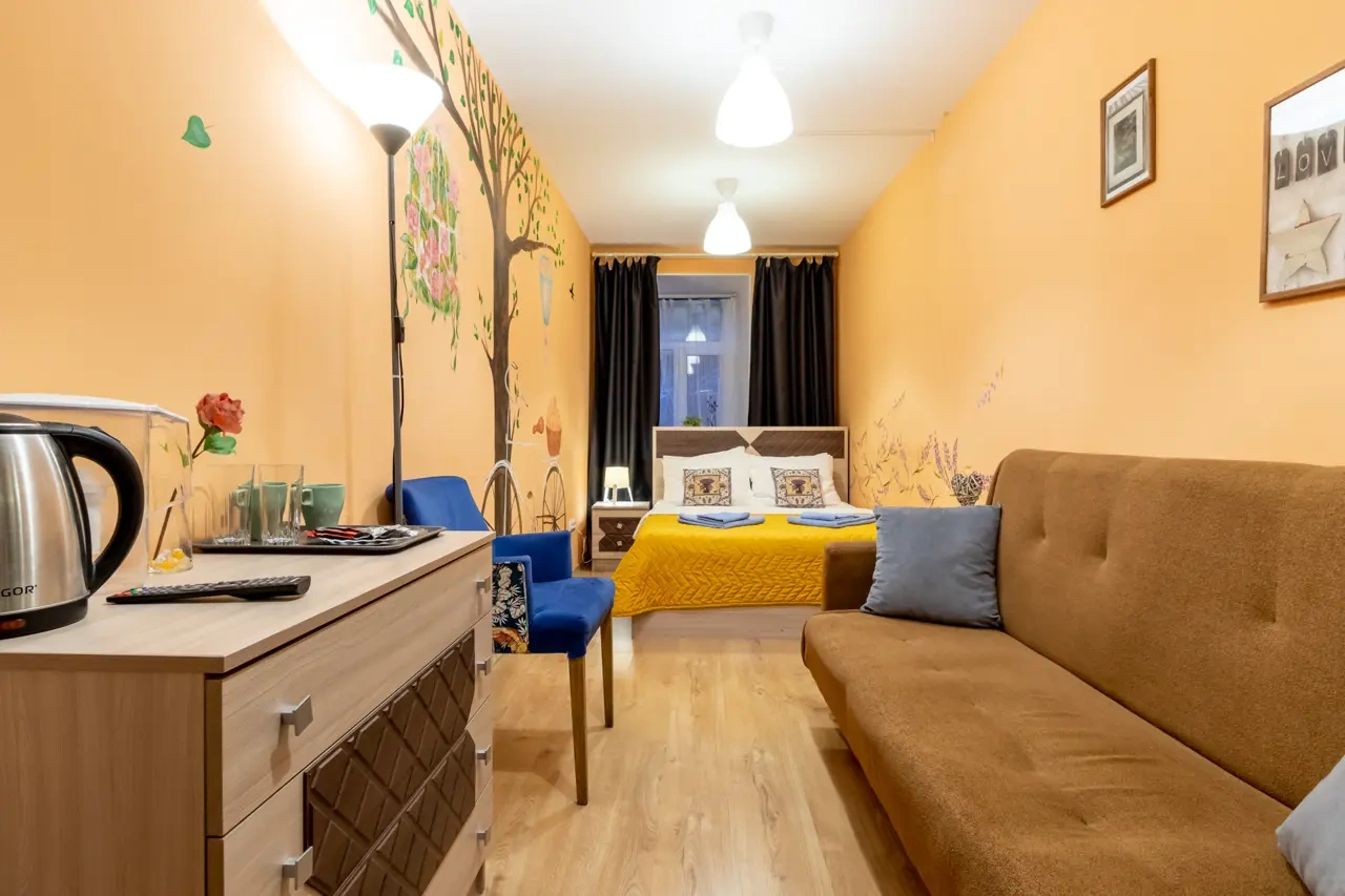Каждый номер нашего отеля имеет индивидуальный дизайн, стены превращены в огромные картины с позитивными жизнеутверждающими мотивами. В этом номере могут разместиться до 3-х человек. В номере 1 двуспальная кровать и раскладывающийся диван. Номер оснащен всем необходимым: постельное белье, полотенца, телевизор с плоским экраном, бесплатный Wi-Fi, электрический чайник с чайными принадлежностями, фен, туалетно-косметические принадлежности, тапочки. В общем доступе гостей имеется холодильник, микроволновая печь, стиральная машина (за отдельную плату). Номер имеет общую ванную комнату и туалет (3 ванных комнаты и туалета на 6 номеров).