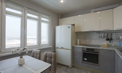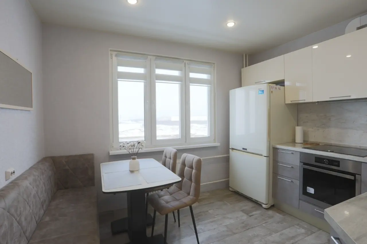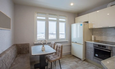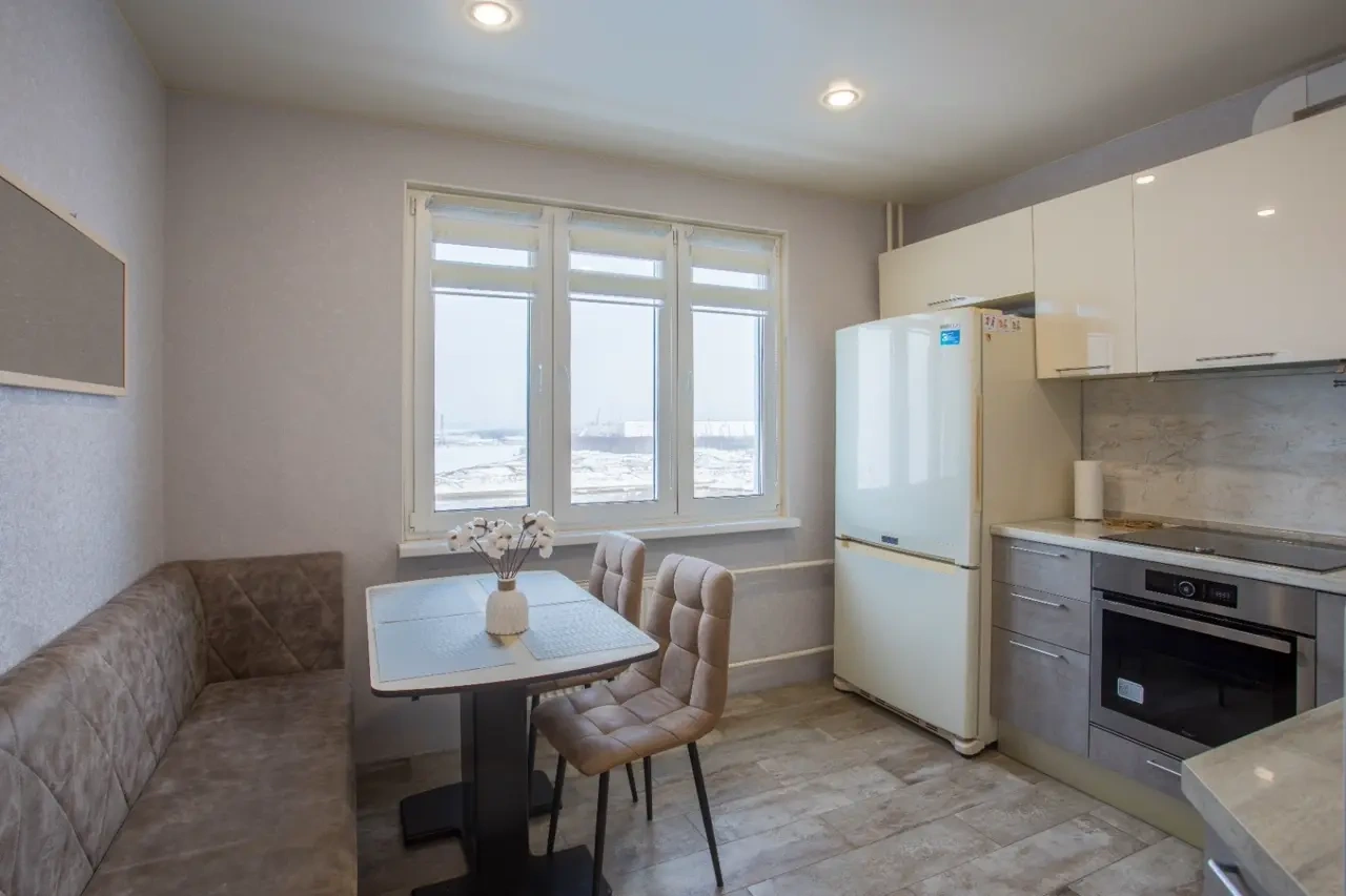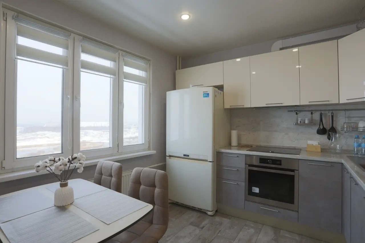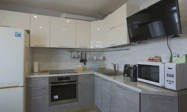 — Кухонный гарнитур, плита, свч, холодильник, полный комплект посуды, обеденный стол и стулья