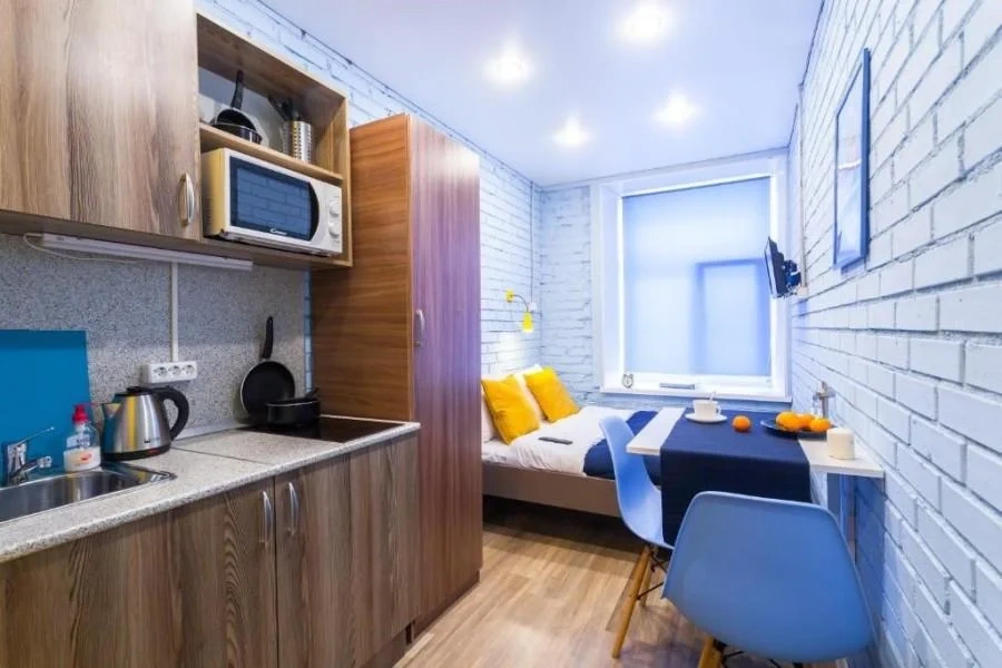 еще к плюсам можно отнести чайник, микроволновку, плиту, посуду.