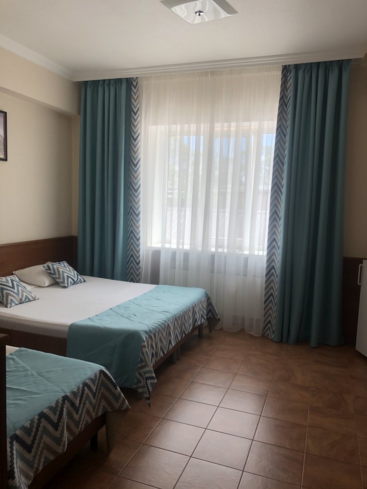 Отличное расположение, как и планировалось до моря близко, магазины, аптеки, столовая отличная в двух шагах, все понравилось. Рекомендую. В номере темные шторы, можно выспаться.