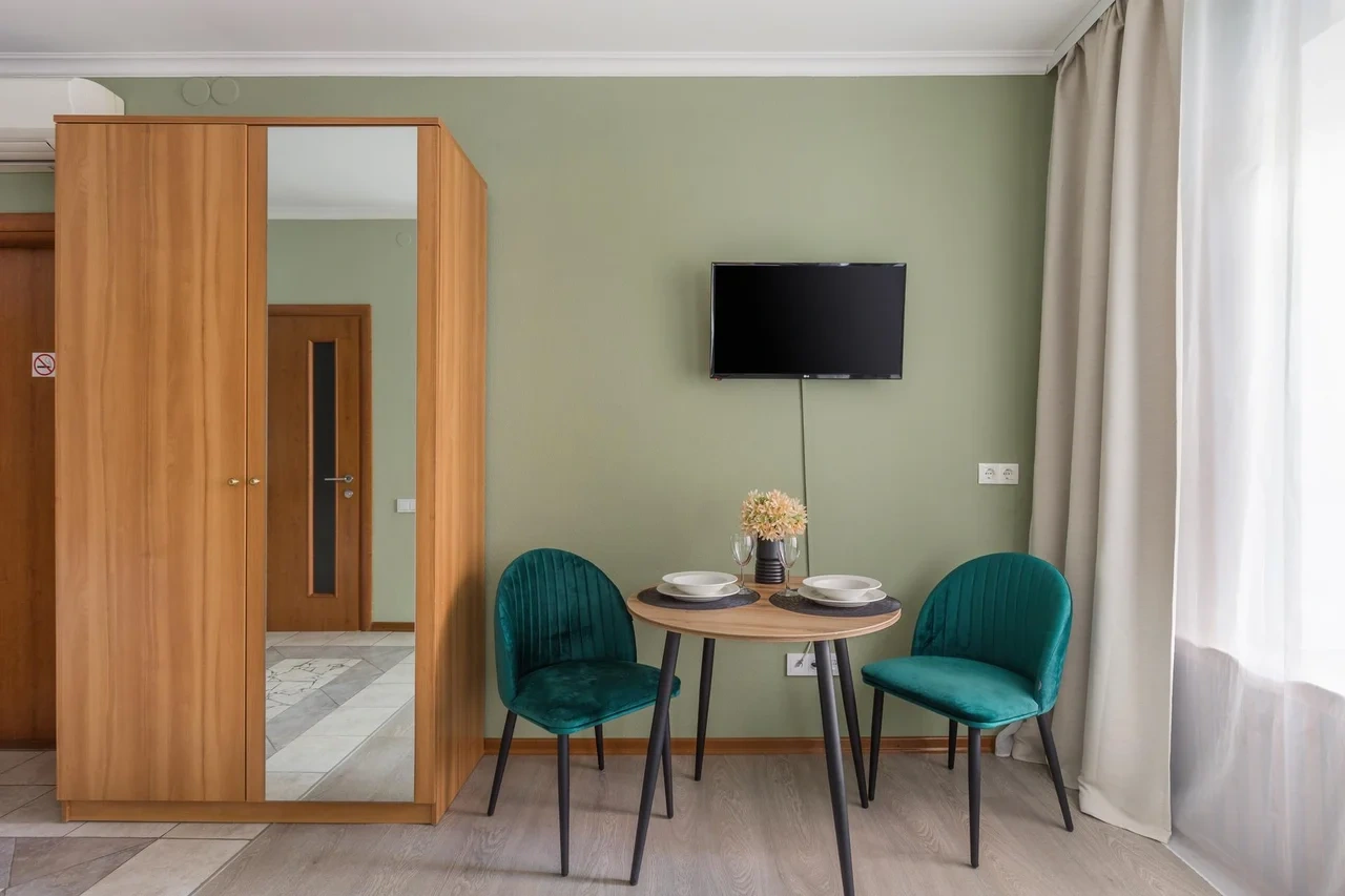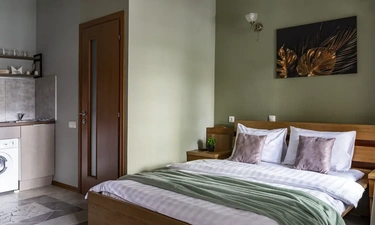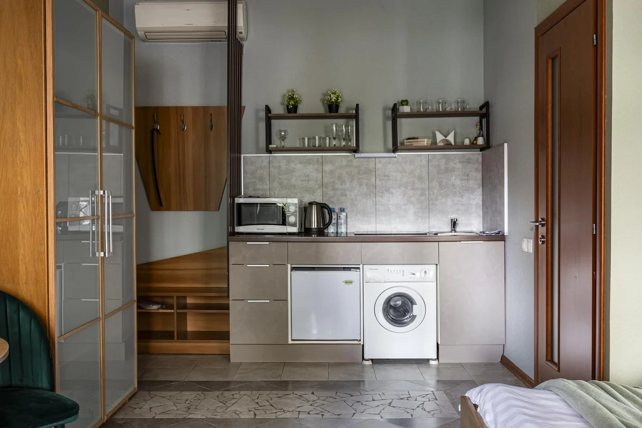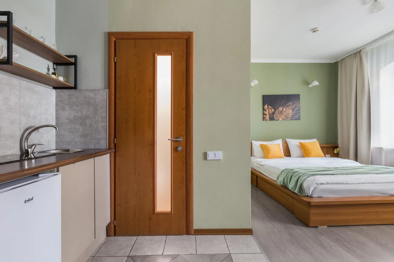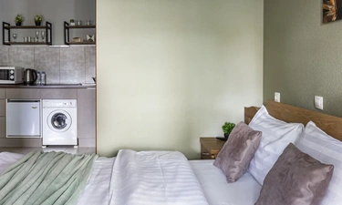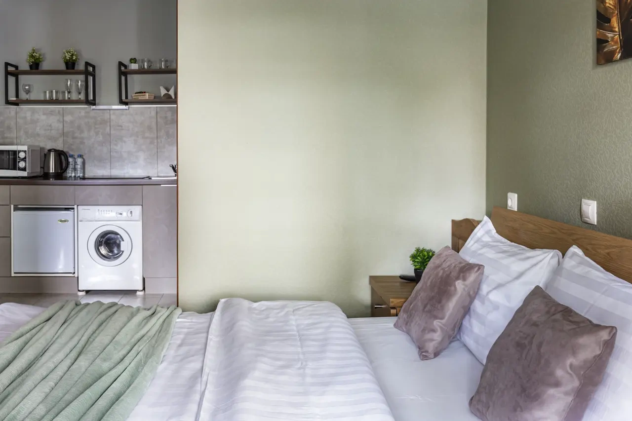 Каждый апартамент оснащен кондиционером, кухонной зоной со всем необходимым, мини холодильником, собственной ванной комнатой, банными и косметическими принадлежностями. В комплексе предусмотрено бесконтактное заселение для Вашего удобства, Вы сможете разместиться в удобное для Вас время. Каждый апарт оборудован электронным замком.