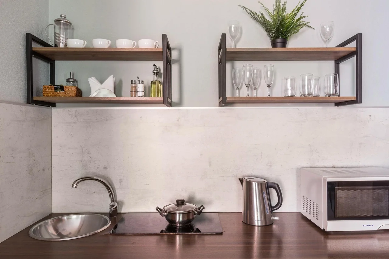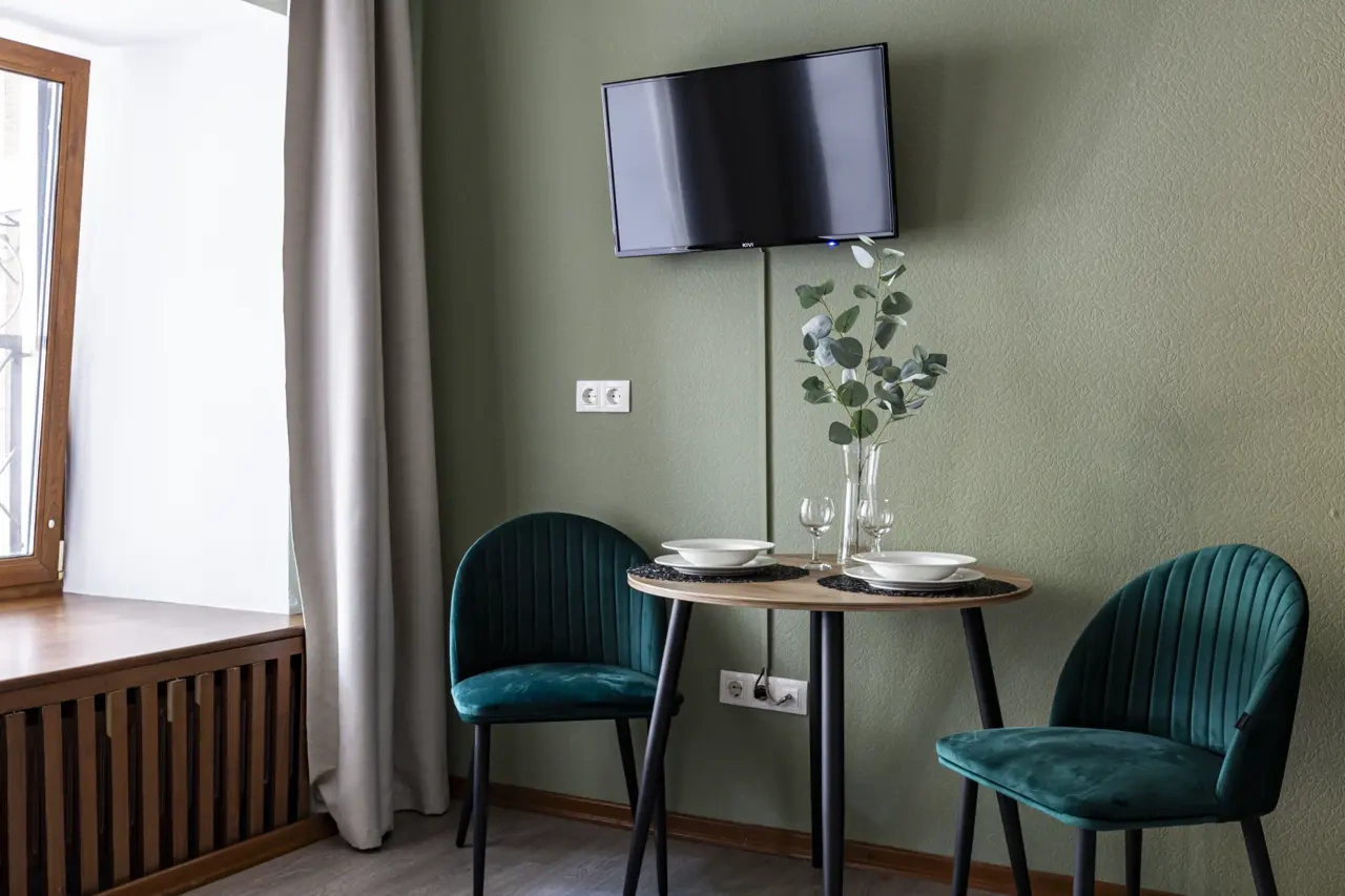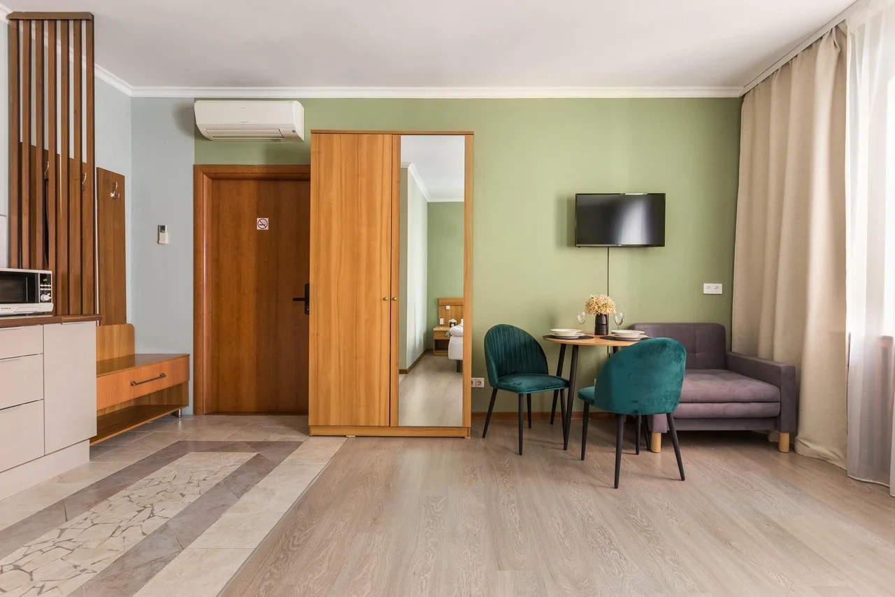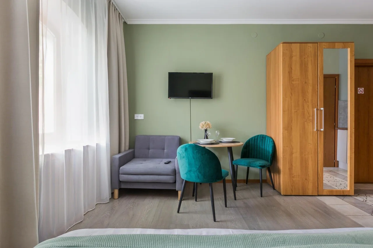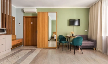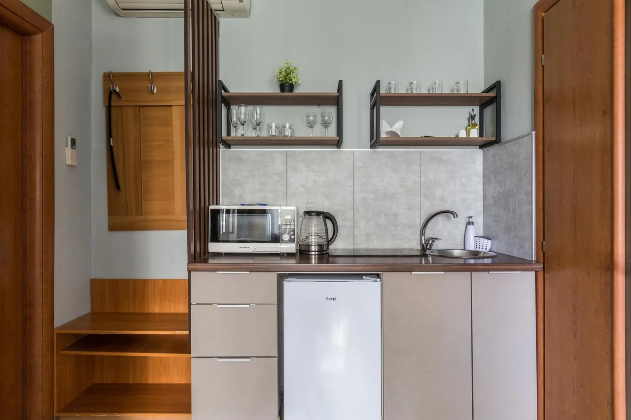 Каждый апартамент оснащен кондиционером, кухонной зоной со всем необходимым, мини холодильником, собственной ванной комнатой, банными и косметическими принадлежностями. В комплексе предусмотрено бесконтактное заселение для Вашего удобства, Вы сможете разместиться в удобное для Вас время. Каждый апарт оборудован электронным замком.