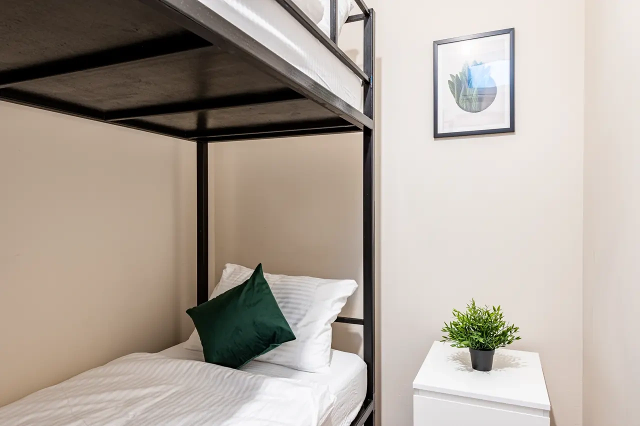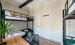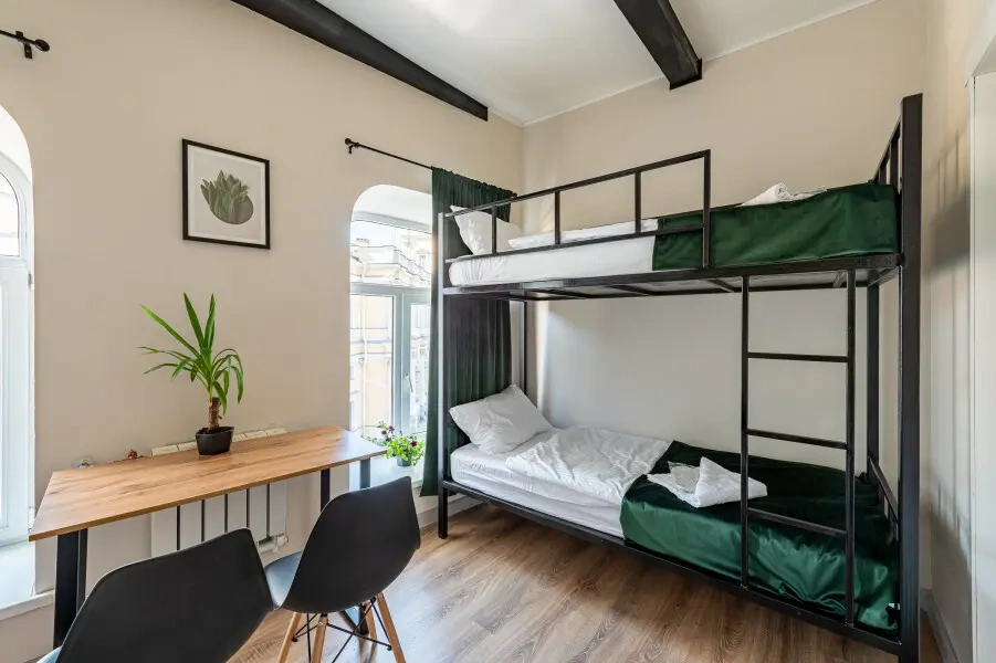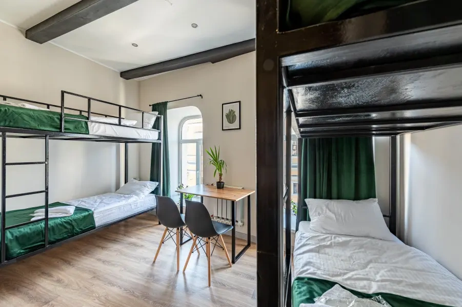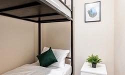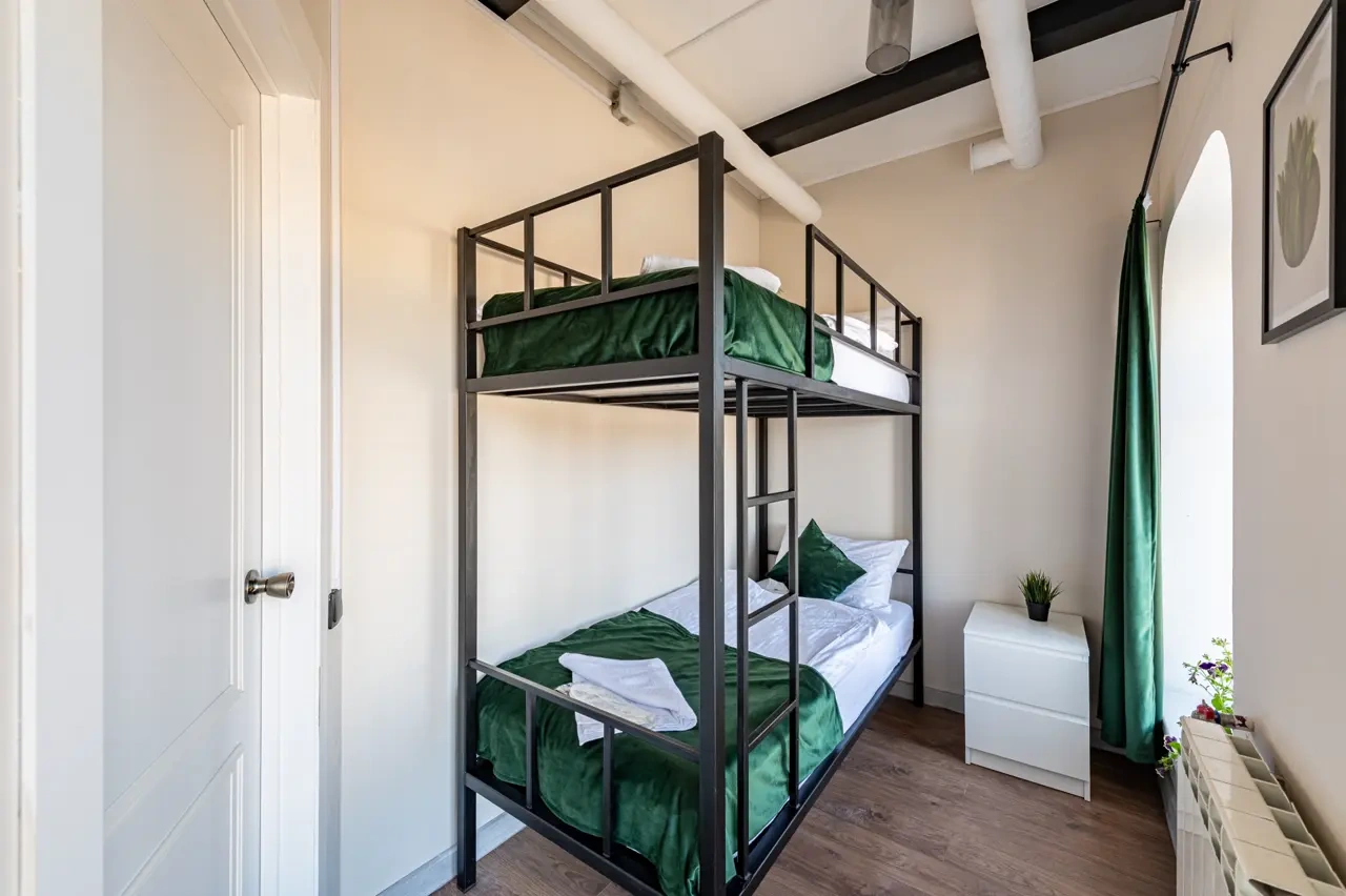 Отдельный уютный двухместный номер с двухъярусной кроватью. В номере есть окно, тумба, крючки для одежды. В общей зоне имеются кухня и санузлы с душевыми кабинами, стиральная машина. Интернет на всей территории отеля.
