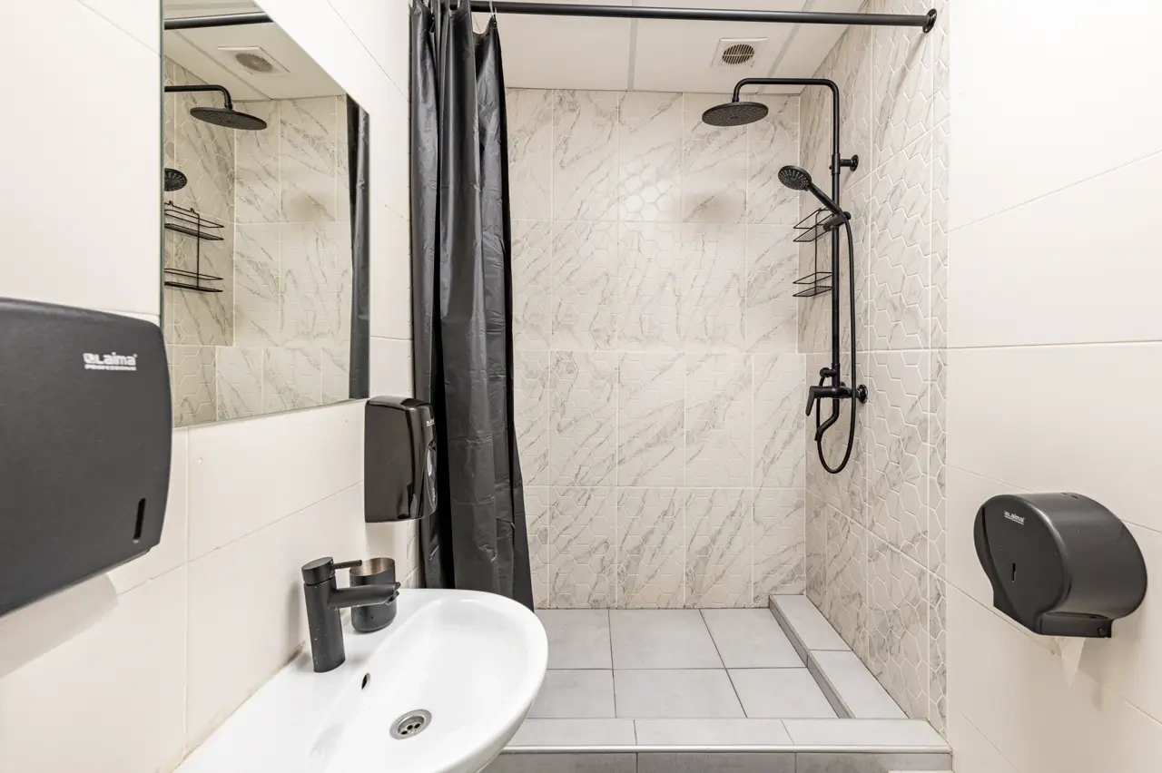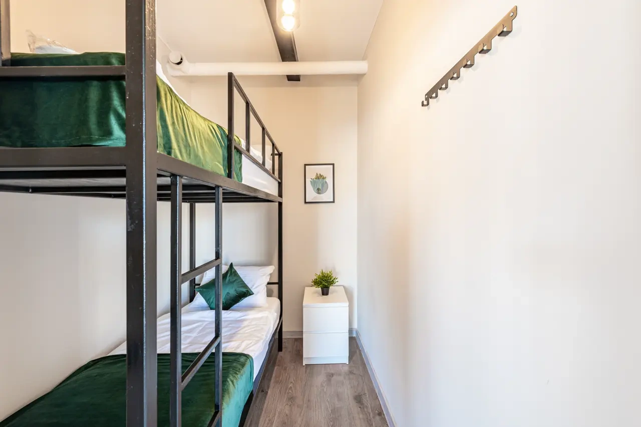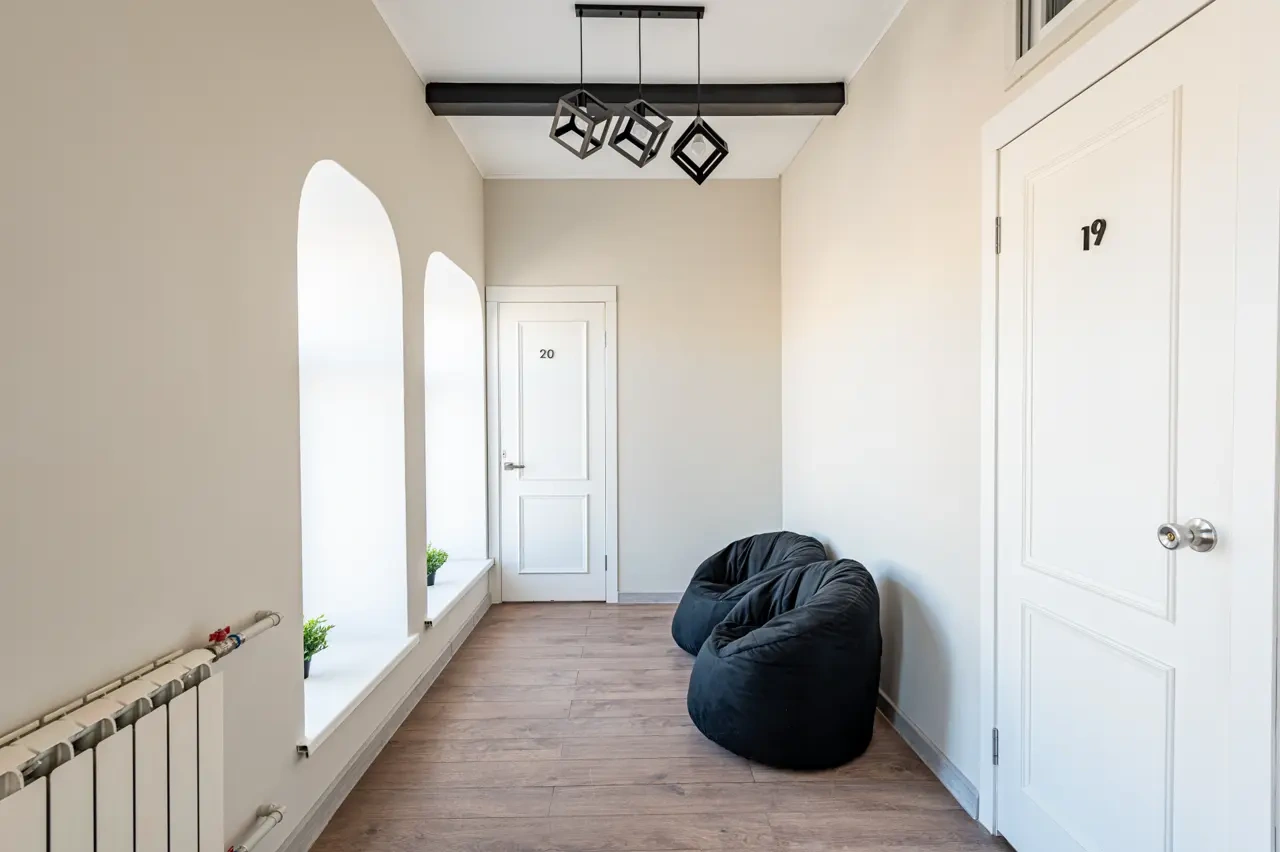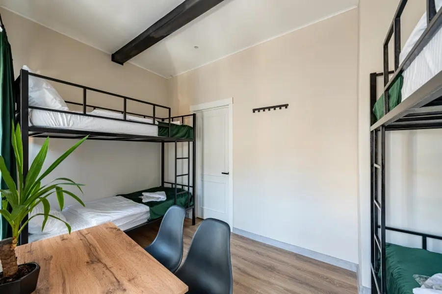 Отдельный уютный двухместный номер с двухъярусной кроватью. В номере есть окно, тумба, крючки для одежды. В общей зоне имеются кухня и санузлы с душевыми кабинами, стиральная машина. Интернет на всей территории отеля.