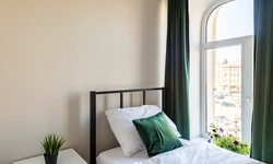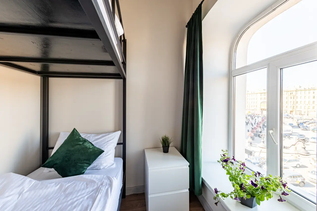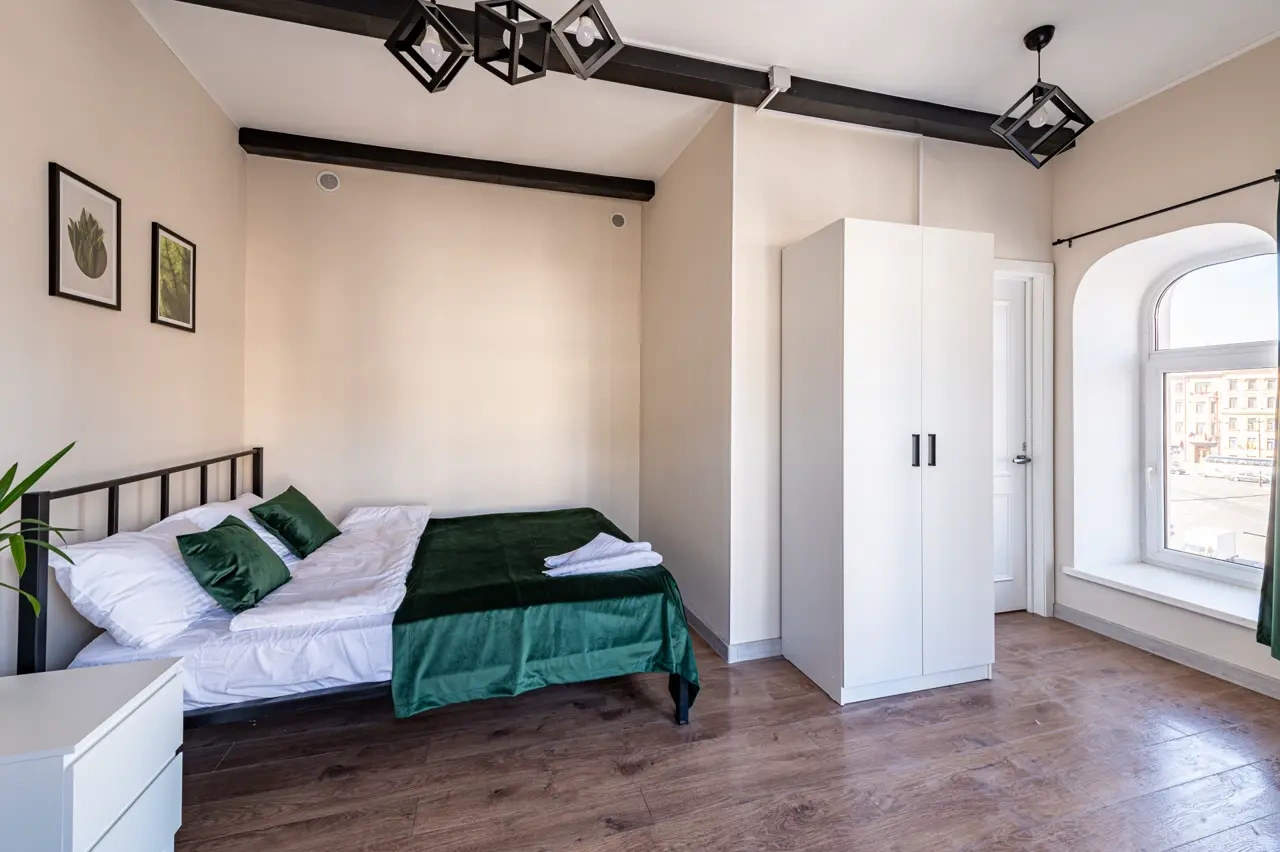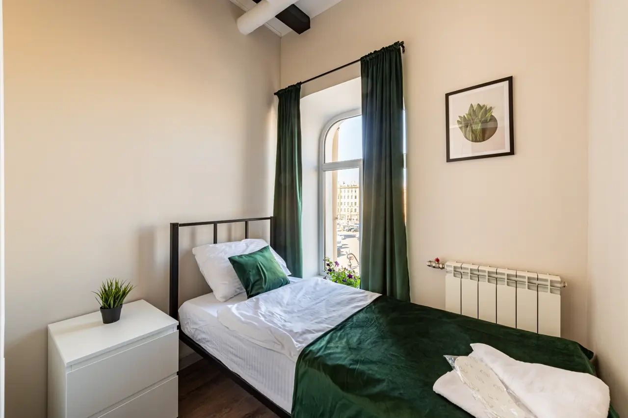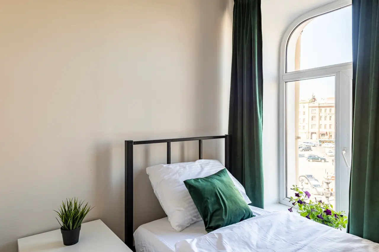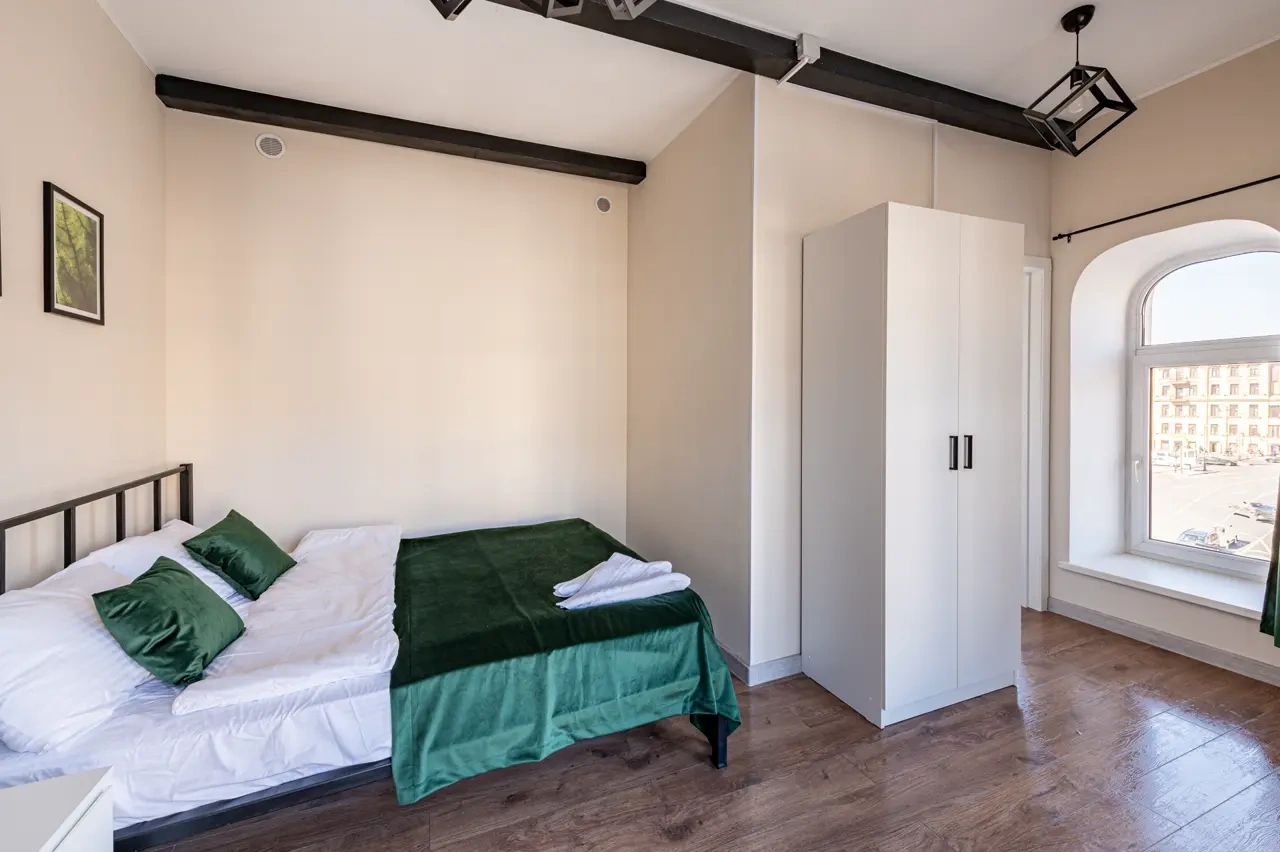 Barch rooms. Отдельный уютный двухместный номер с двуспальной кроватью с окном и видом на площадь Восстания. В номере есть тумба, крючки для одежды.