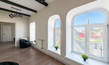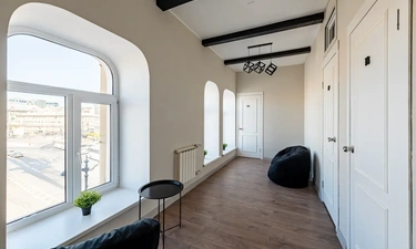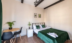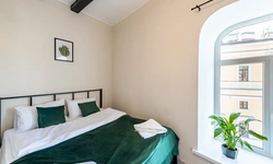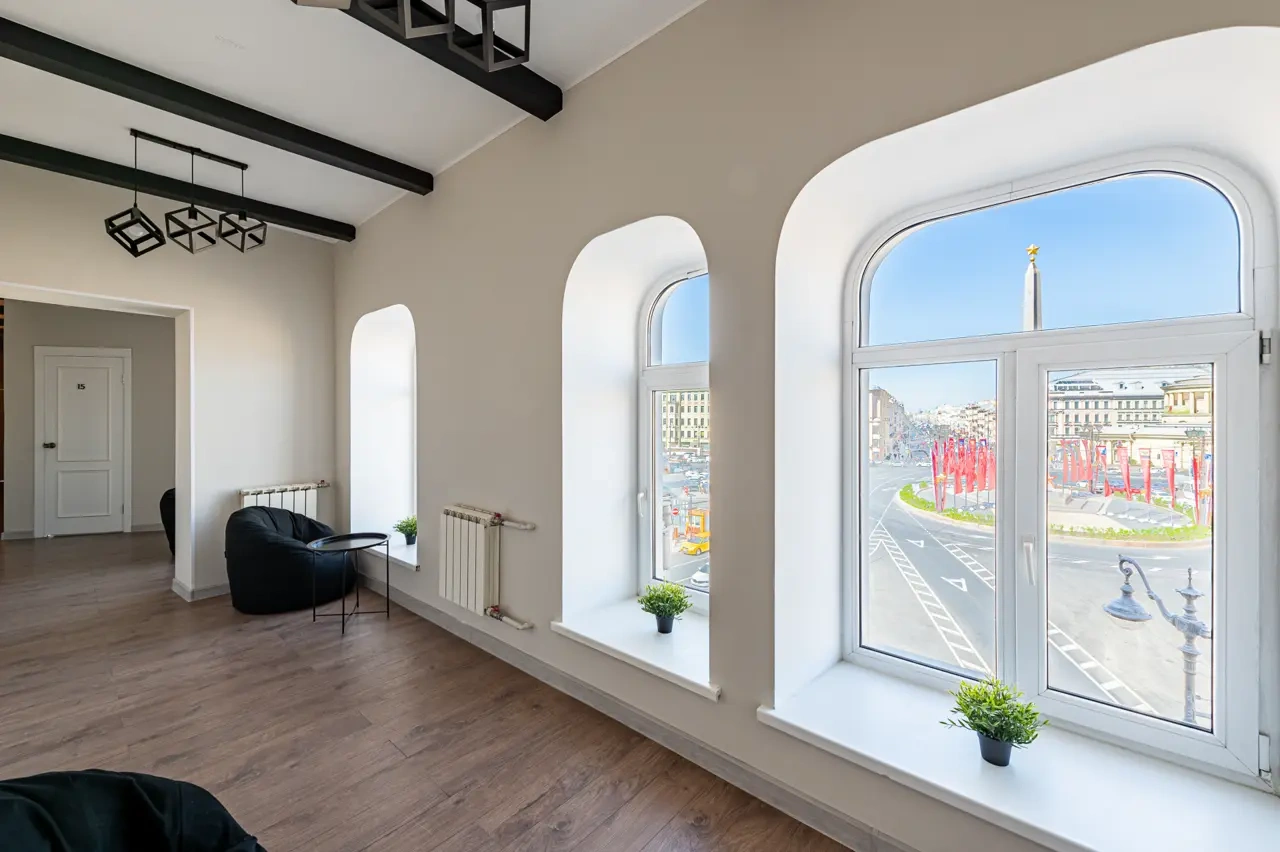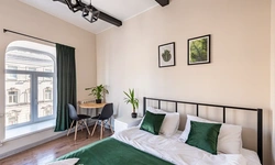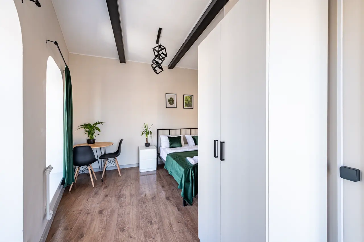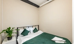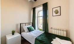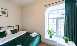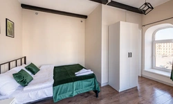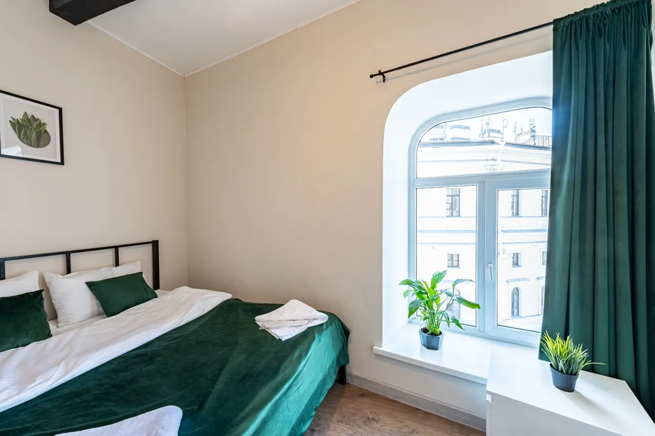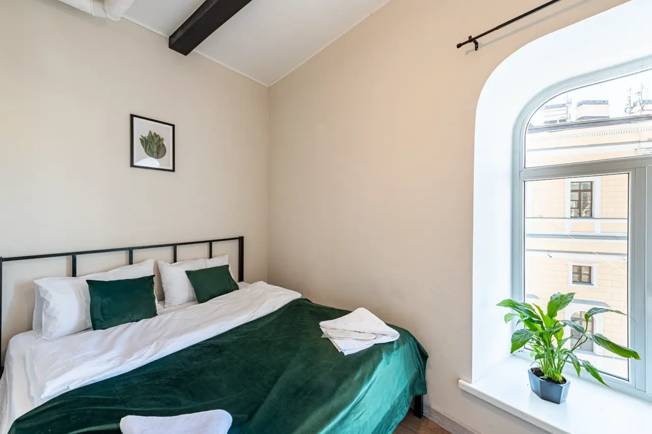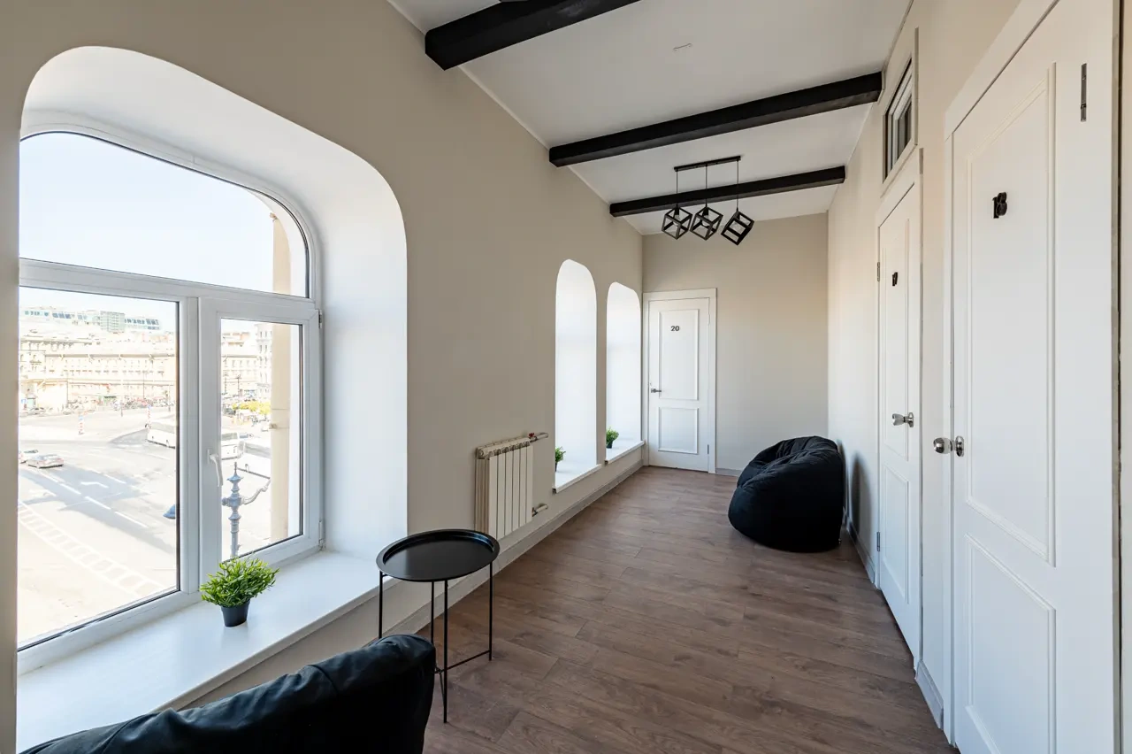Barch rooms. Отдельный уютный двухместный номер с двуспальной кроватью с окном и видом на площадь Восстания. В номере есть тумба, крючки для одежды.