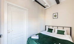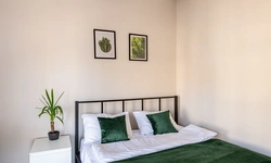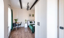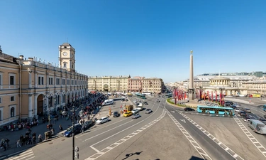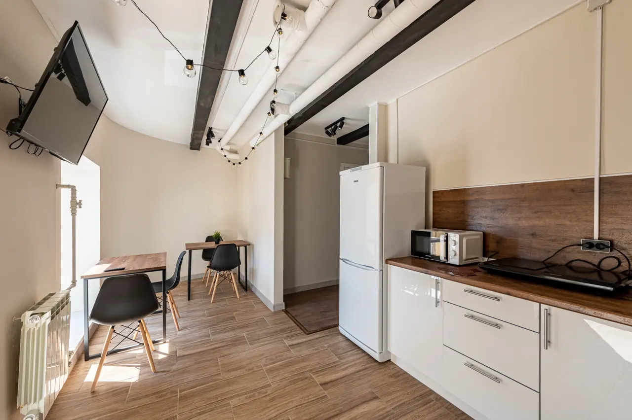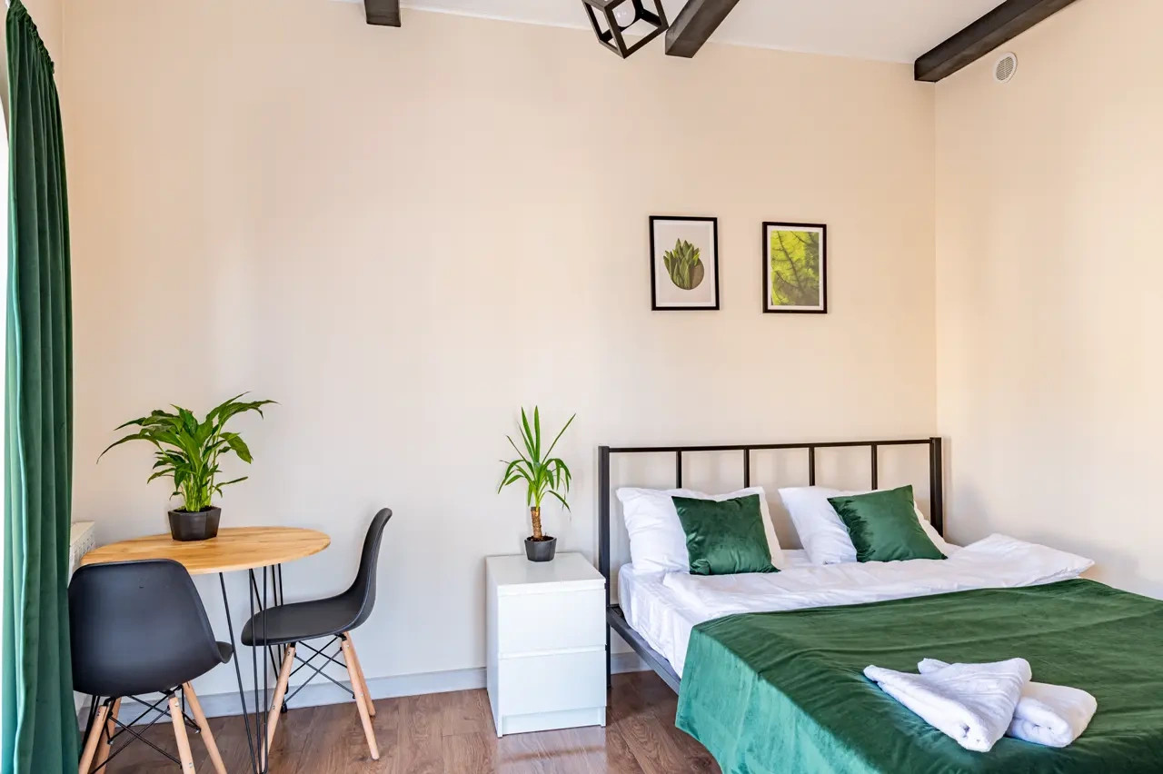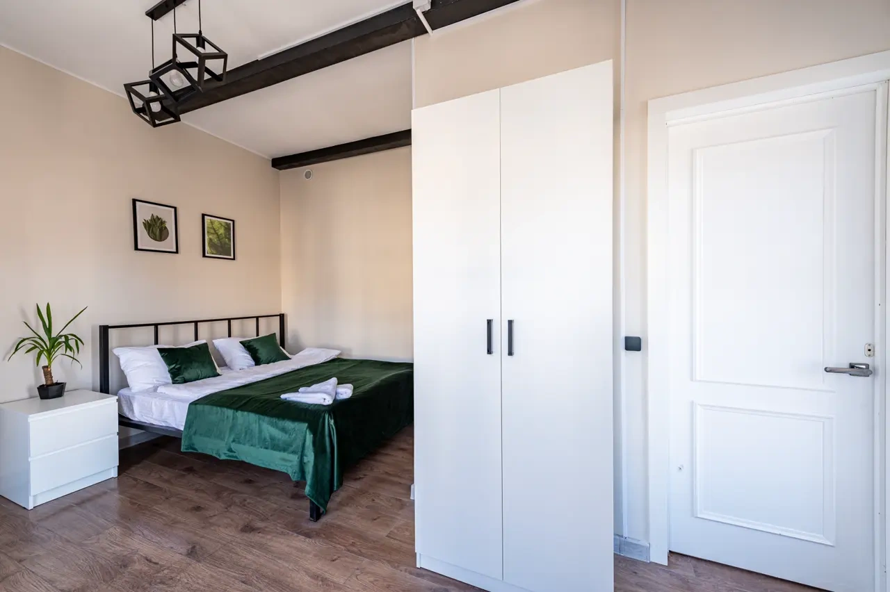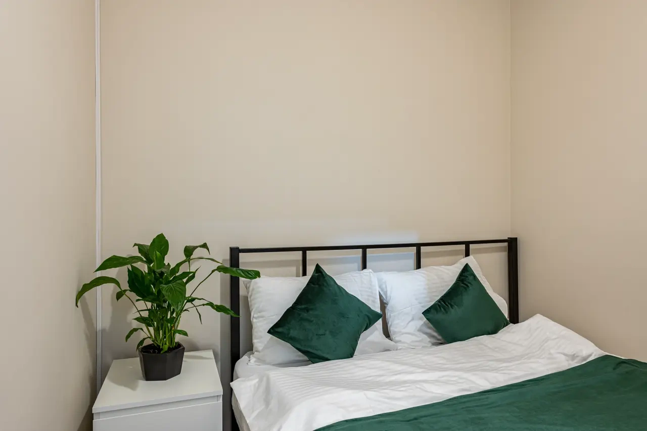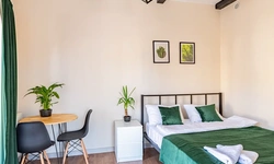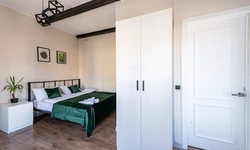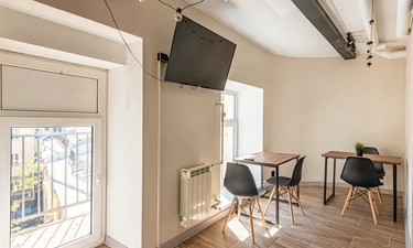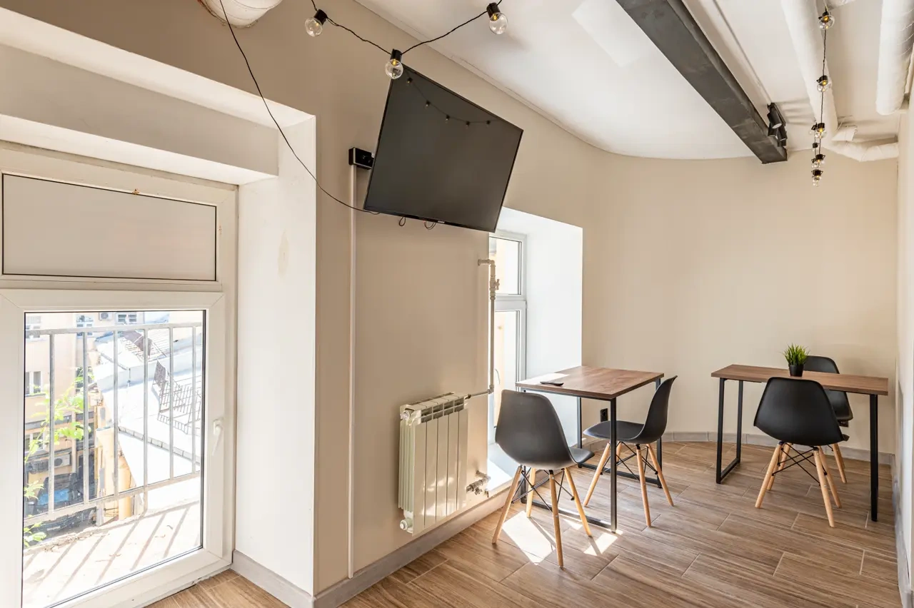Barch rooms. Отдельный уютный двухместный номер с двуспальной кроватью с окном и видом на площадь Восстания. В номере есть тумба, крючки для одежды.