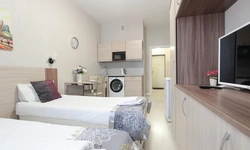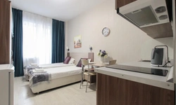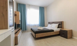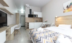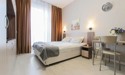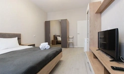 Просторный номер площадью 30 кв.м. с одной двуспальной кроватью. Стильный интерьер и функциональная мини-кухня обеспечивает максимальный комфорт пребывания. Каждый номер оснащен мини-кухней с холодильником, варочной поверхностью и набором посуды, рабочей зоной, беспроводным интернетом и ЖК-телевизором. Ванная комната с душевой кабиной, набором необходимых принадлежностей, включая фен.