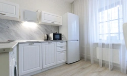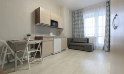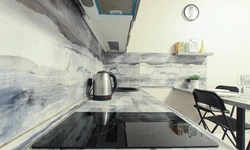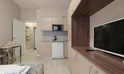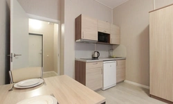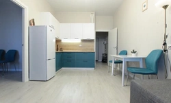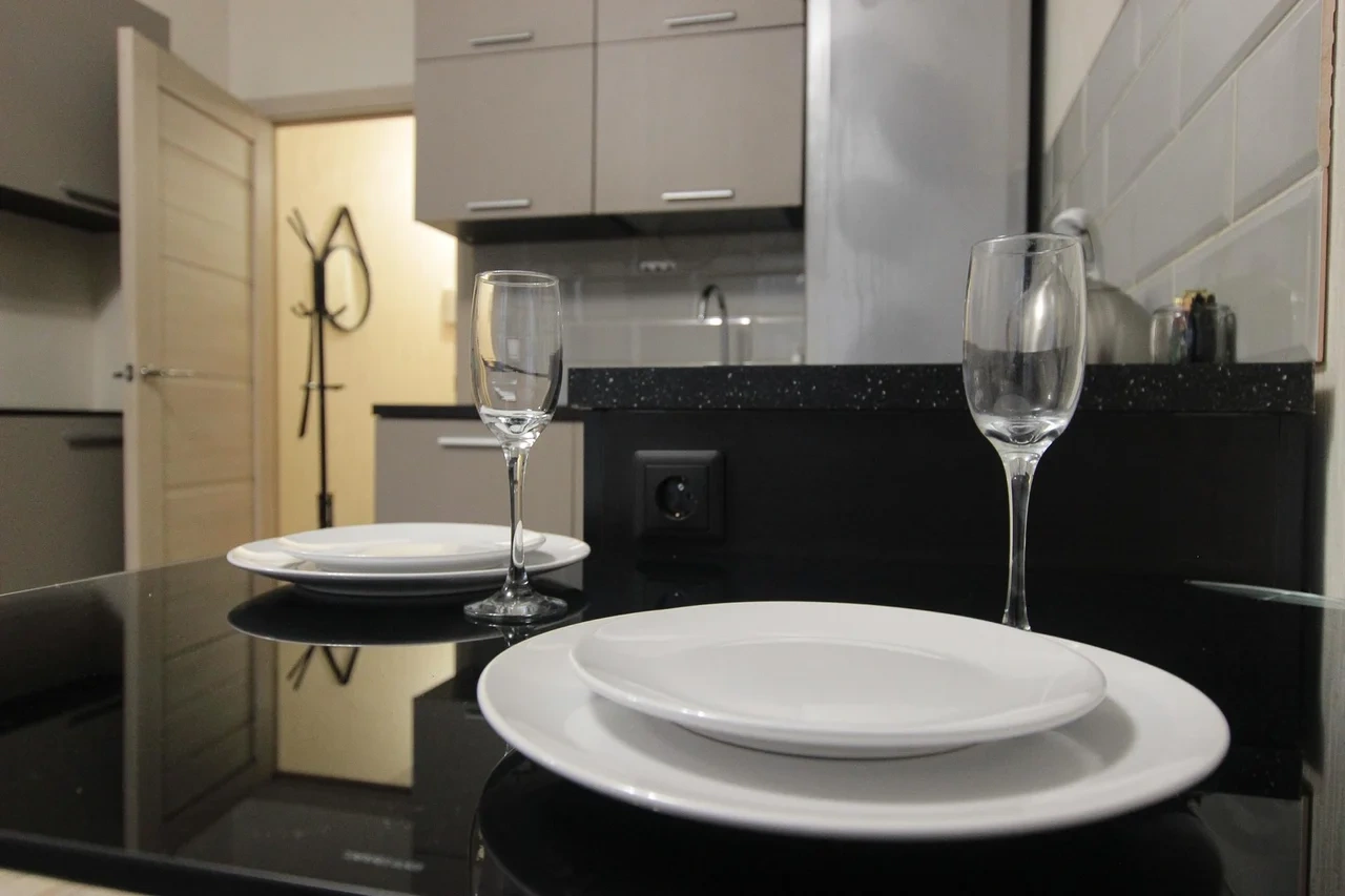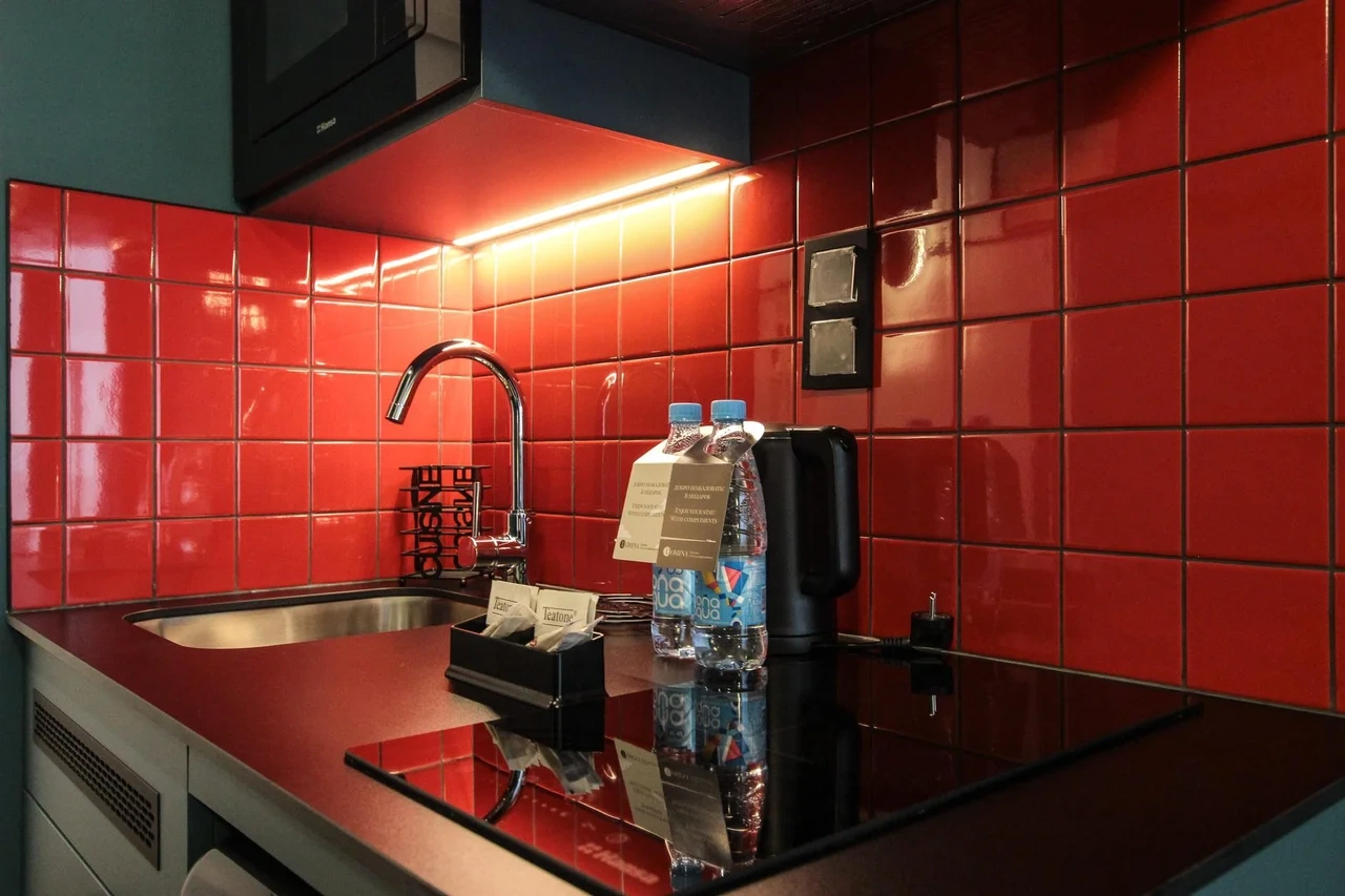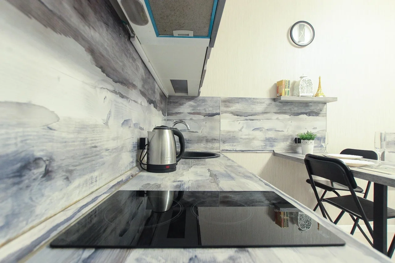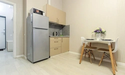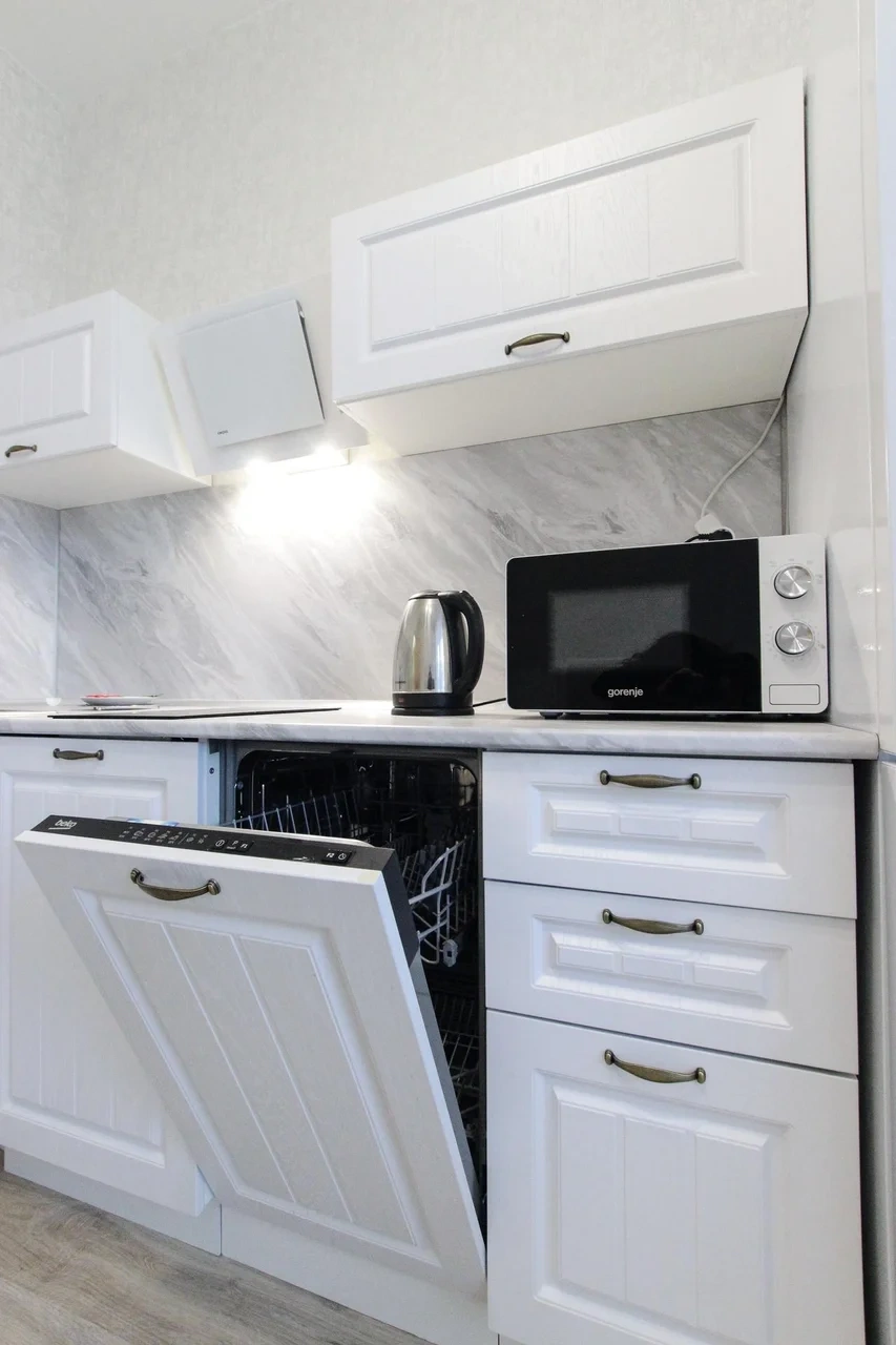 - Кухонный гарнитур с варочной поверхностью, холодильником, микроволновкой, чайником, набором посуды для готовки и сервировки.