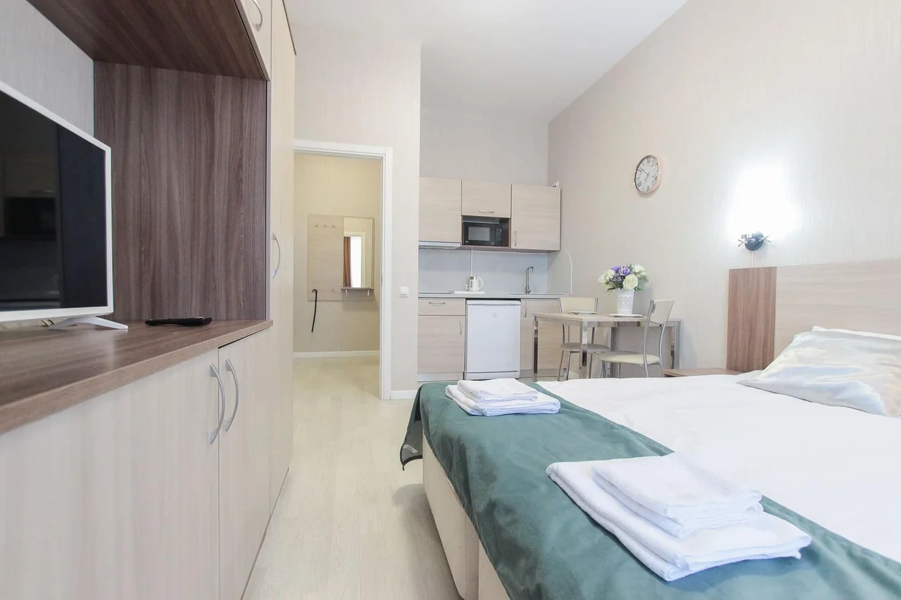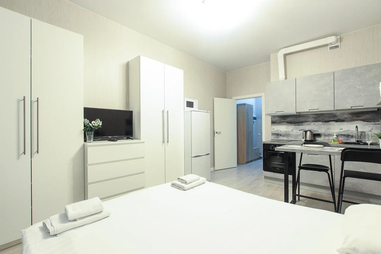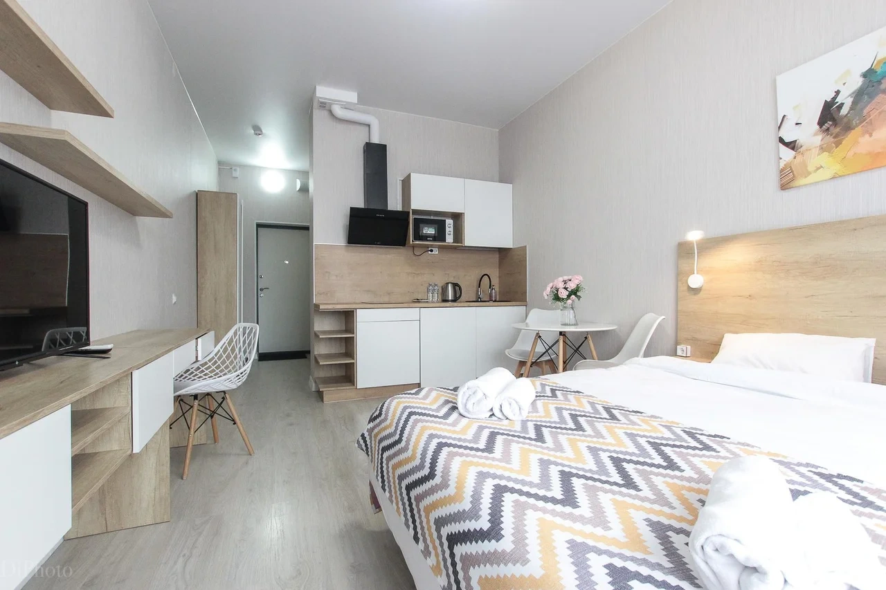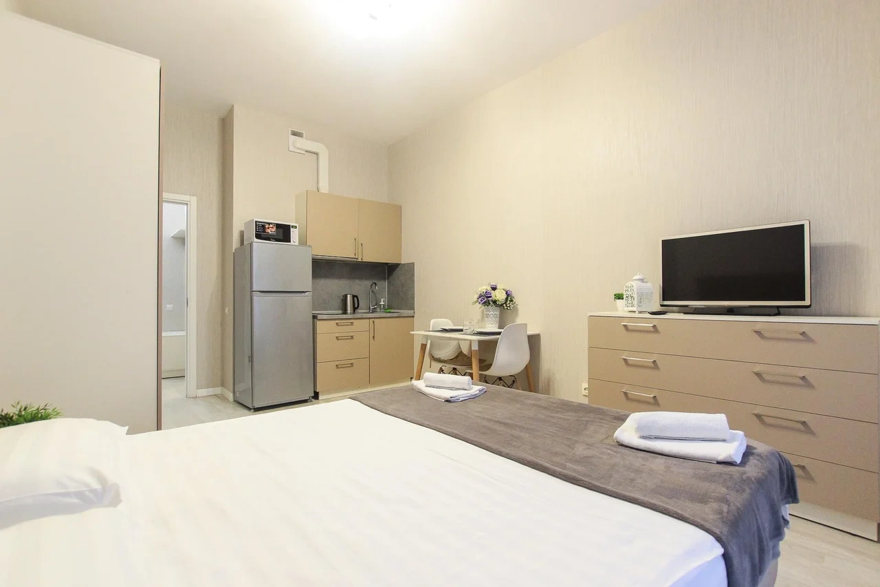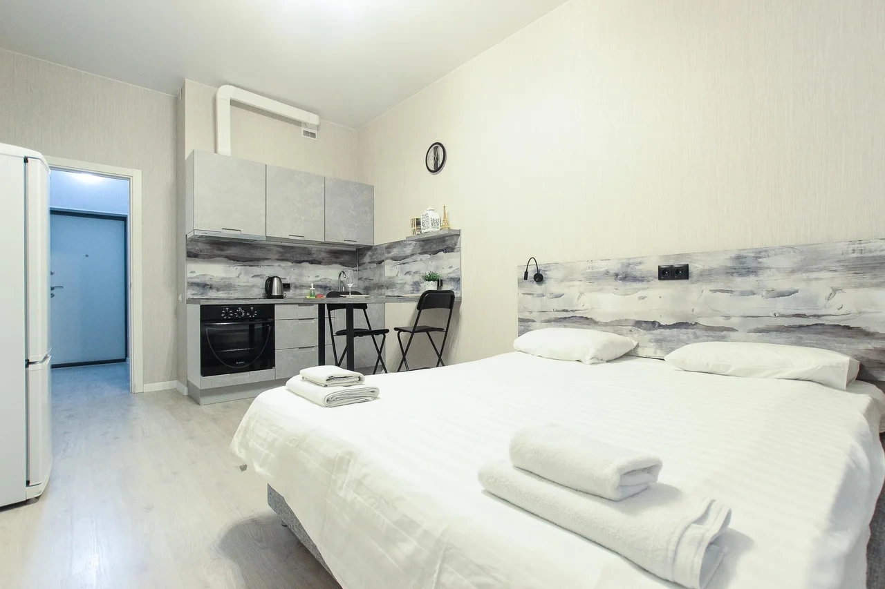 предлагает комфортабельную, современную студию - уютное место для Вашего отдыха . В квартире есть все необходимое для комфортного проживания: — кровать с ортопедическим матрасом; — постельное белье и полотенца; — гигиенические принадлежности, косметические средства и тапочки; — холодильник, электрическая плита, электрочайник, микроволновая печь; — водонагреватель; — телевизор; — кондиционер; — стиральная машина; — утюг с гладильной доской, фен, сушилка для белья; — электроплита; — посуда, моющие средства; — чай, кофе, сахар; — скоростной Wi-Fi. Финишная уборка включена в стоимость (при длительном проживании обязательна еженедельная уборка с заменой белья). Будем ждать вас в гости! Вам понравится.