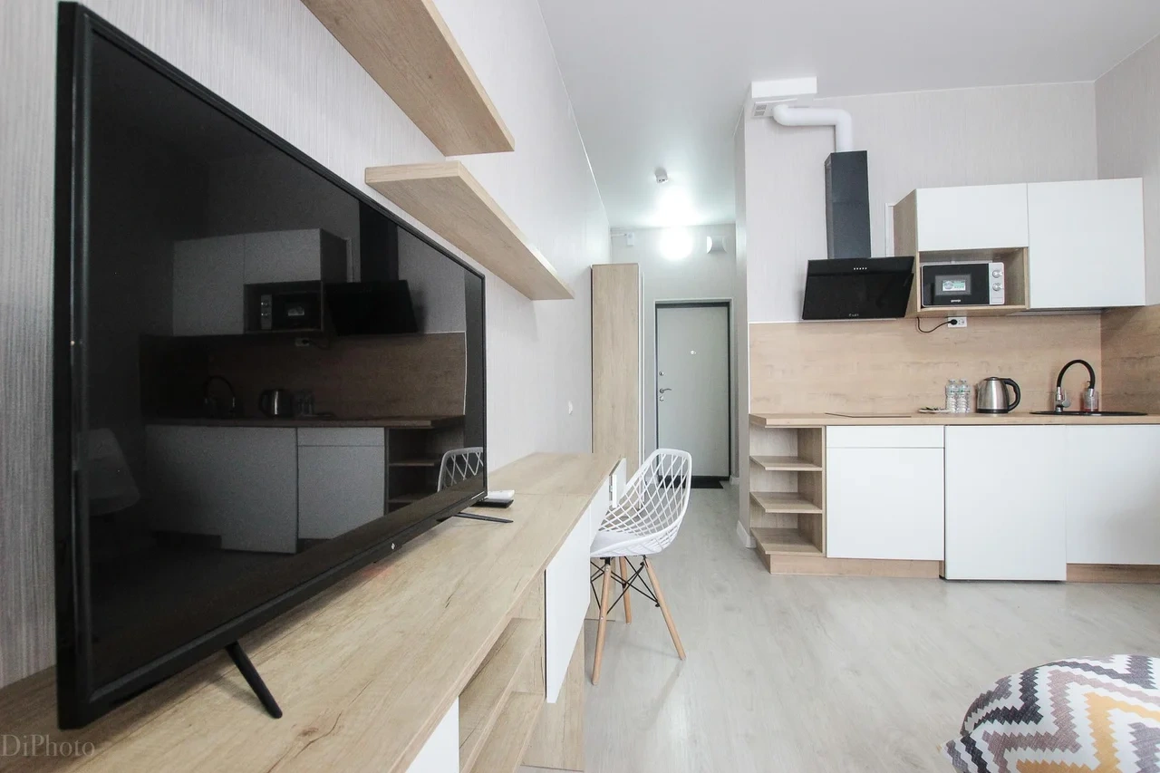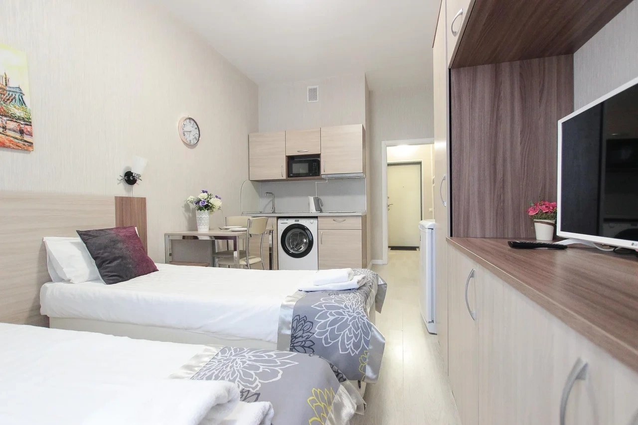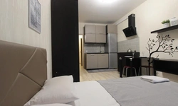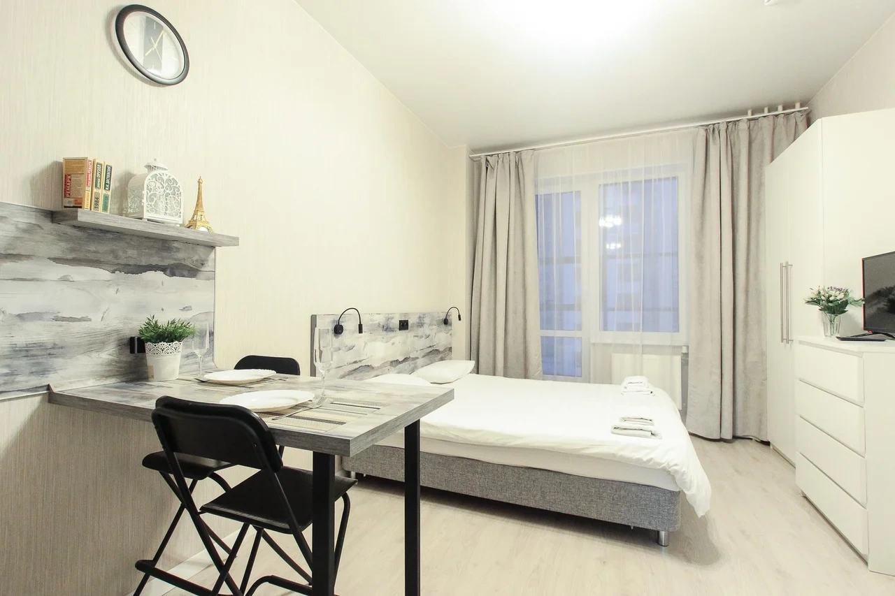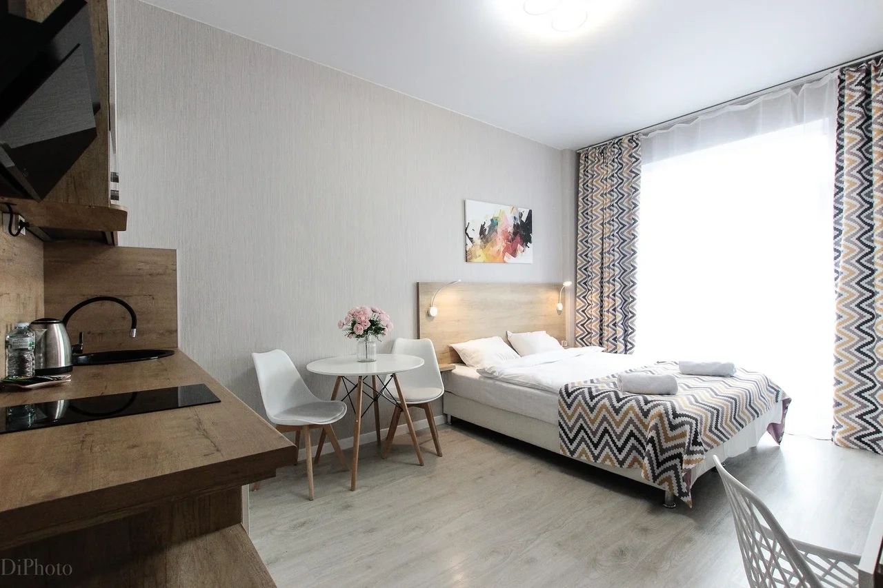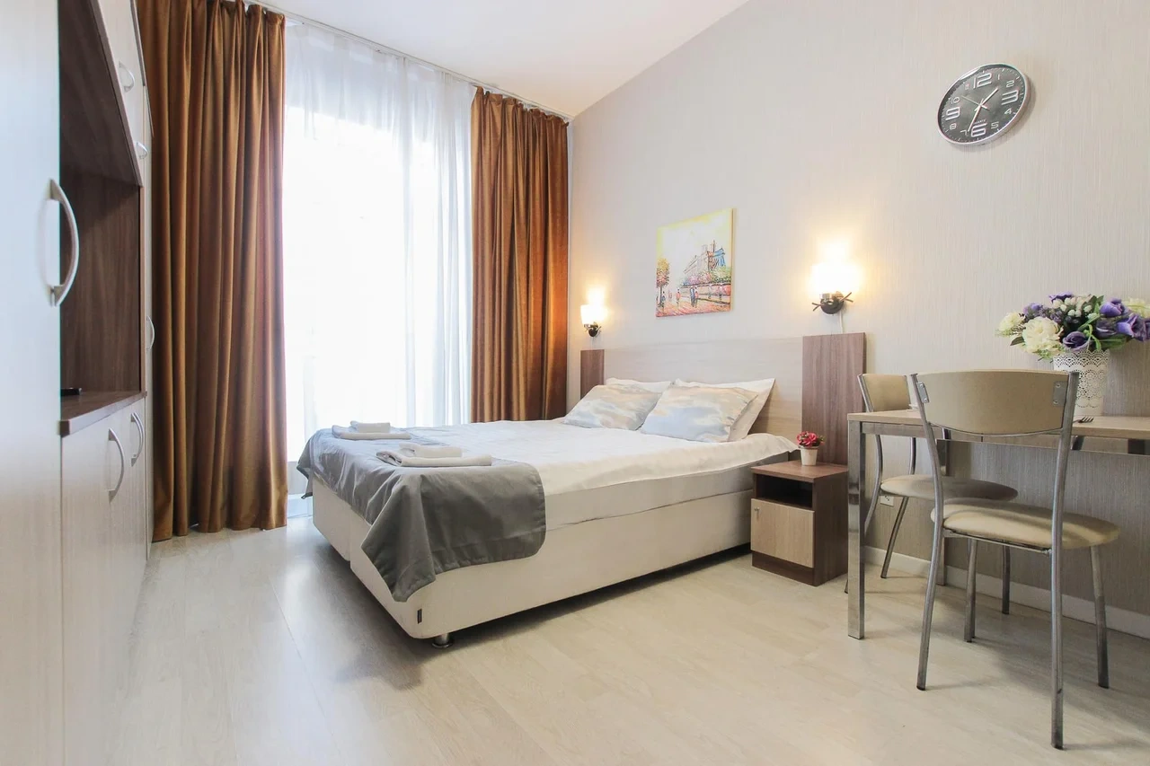 предлагает комфортабельную, современную студию - уютное место для Вашего отдыха . В квартире есть все необходимое для комфортного проживания: — кровать с ортопедическим матрасом; — постельное белье и полотенца; — гигиенические принадлежности, косметические средства и тапочки; — холодильник, электрическая плита, электрочайник, микроволновая печь; — водонагреватель; — телевизор; — кондиционер; — стиральная машина; — утюг с гладильной доской, фен, сушилка для белья; — электроплита; — посуда, моющие средства; — чай, кофе, сахар; — скоростной Wi-Fi. Финишная уборка включена в стоимость (при длительном проживании обязательна еженедельная уборка с заменой белья). Будем ждать вас в гости! Вам понравится.