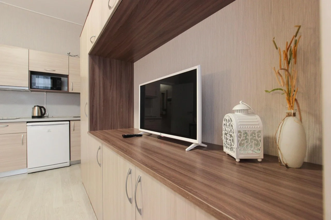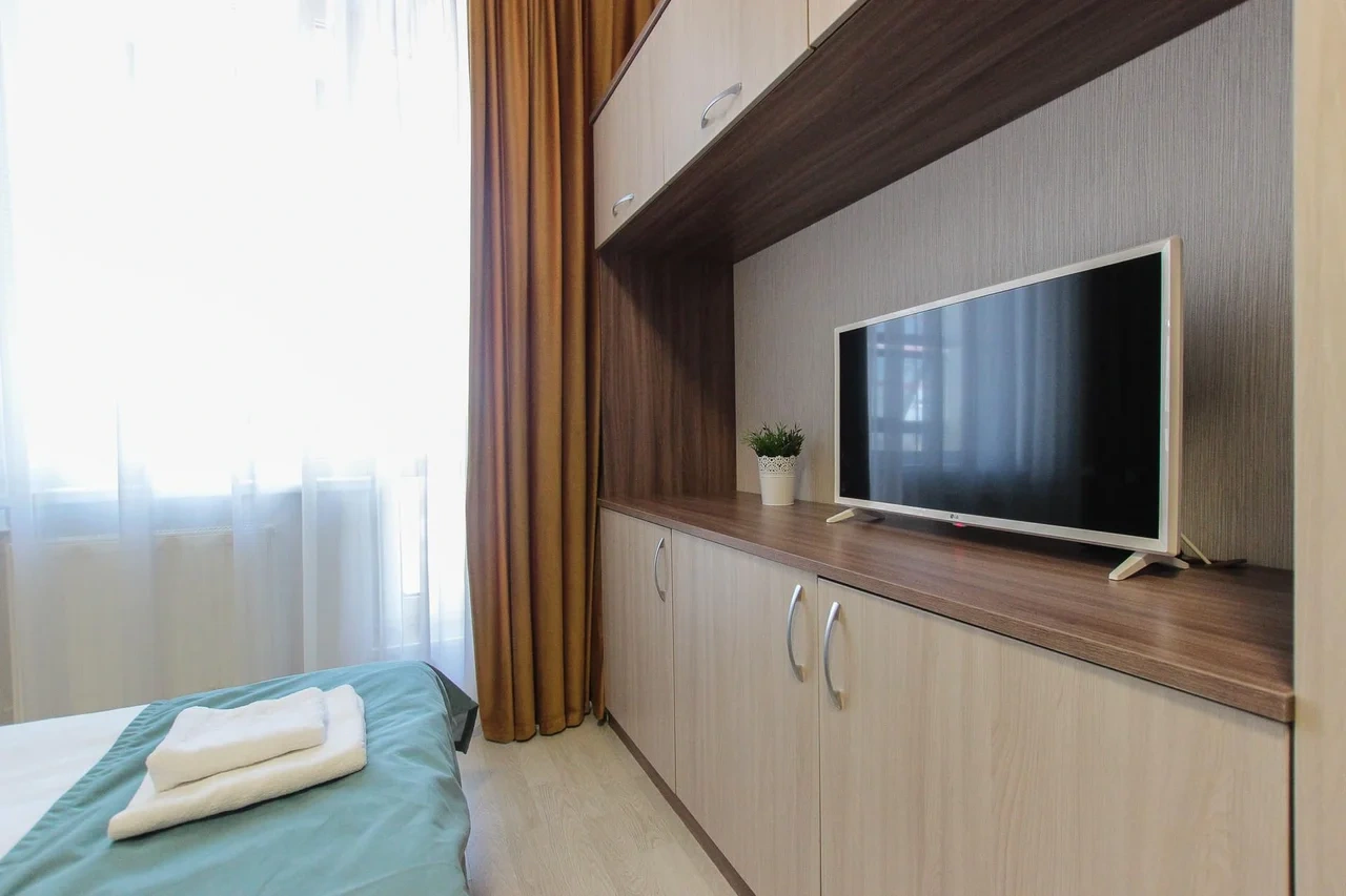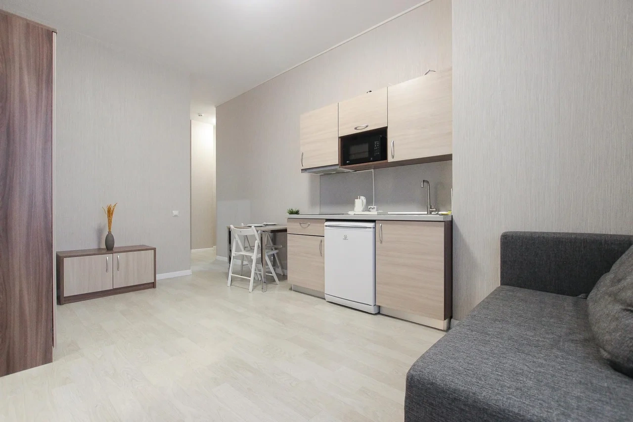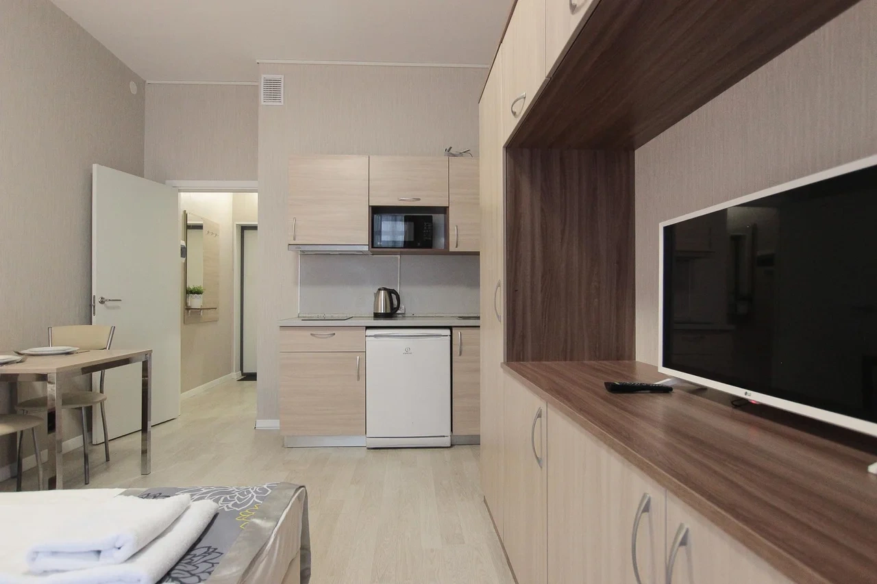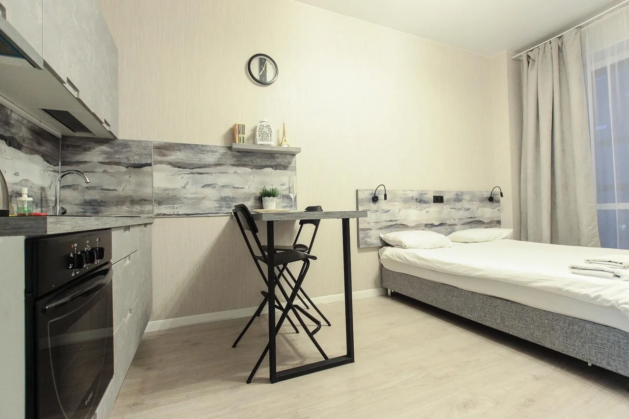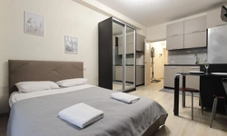 предлагает комфортабельную, современную студию - уютное место для Вашего отдыха . В квартире есть все необходимое для комфортного проживания: — кровать с ортопедическим матрасом; — постельное белье и полотенца; — гигиенические принадлежности, косметические средства и тапочки; — холодильник, электрическая плита, электрочайник, микроволновая печь; — водонагреватель; — телевизор; — кондиционер; — стиральная машина; — утюг с гладильной доской, фен, сушилка для белья; — электроплита; — посуда, моющие средства; — чай, кофе, сахар; — скоростной Wi-Fi. Финишная уборка включена в стоимость (при длительном проживании обязательна еженедельная уборка с заменой белья). Будем ждать вас в гости! Вам понравится.
