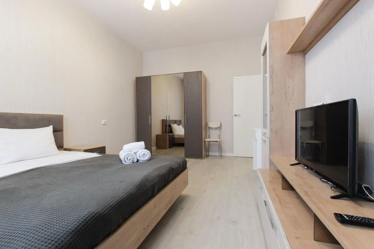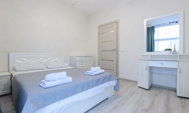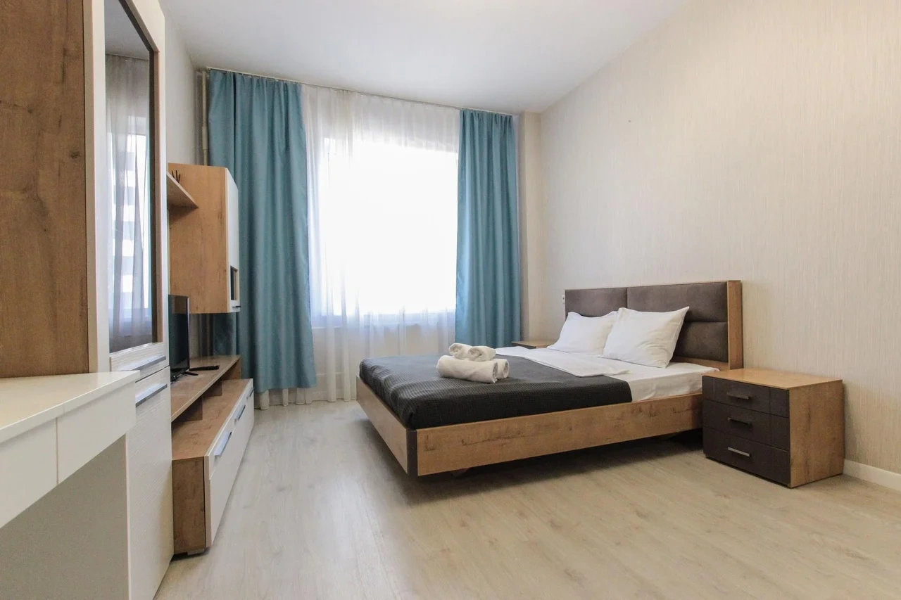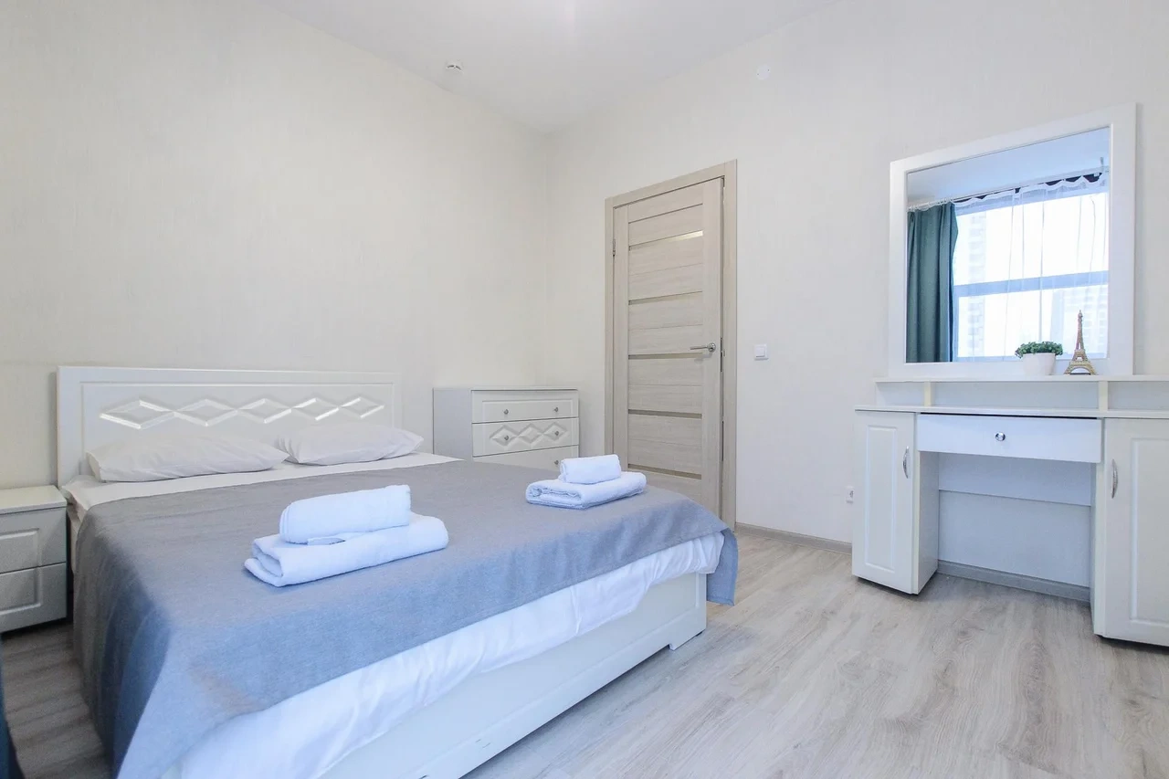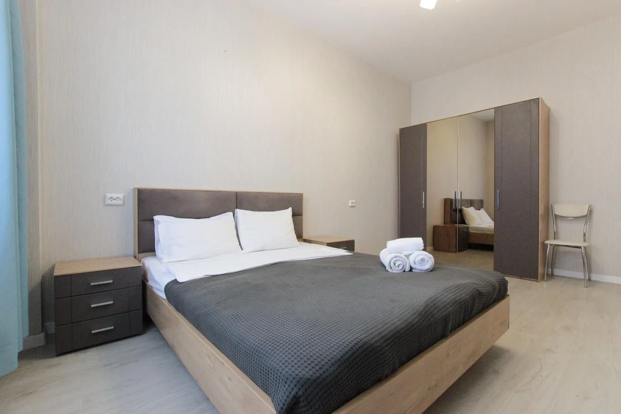 предлагает комфортабельный, современный двухкомнатный номер- уютное место для Вашего отдыха . В квартире есть все необходимое для комфортного проживания: — кровать с ортопедическим матрасом; — разборный диван; — постельное белье и полотенца; — гигиенические принадлежности, косметические средства и тапочки; — холодильник, электрическая плита, электрочайник, микроволновая печь; — водонагреватель; — телевизор; — кондиционер; — стиральная машина; — утюг с гладильной доской, фен, сушилка для белья; — электроплита; — посуда, моющие средства; — чай, кофе, сахар; — скоростной Wi-Fi. Комплекс с развитой и комфортной инфраструктурой: имеется все необходимое для комфортного и безопасного проживания. Круглосуточные магазины, пешеходные зоны для отдыха и прогулок (оборудованные фонарями и скамейками), аптеки, кафе, рестораны и кальянные. Рядом с домом есть места для парковки авто, а при необходимости, на нулевом этаже, расположена охраняемая подземная платная парковка. Финишная уборка включена в стоимость (при длительном проживании обязательна еженедельная уборка с заменой белья). Будем ждать вас в гости! Вам понравится.