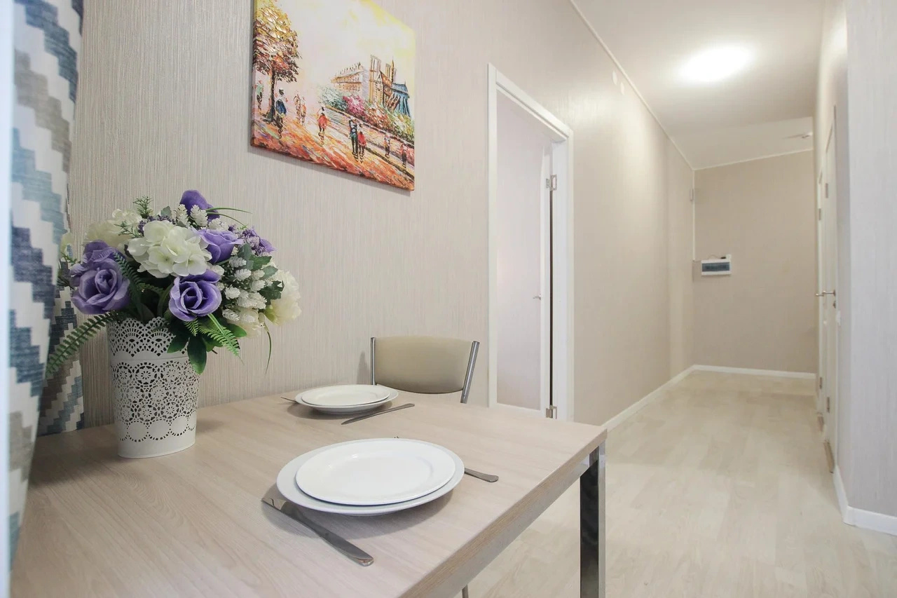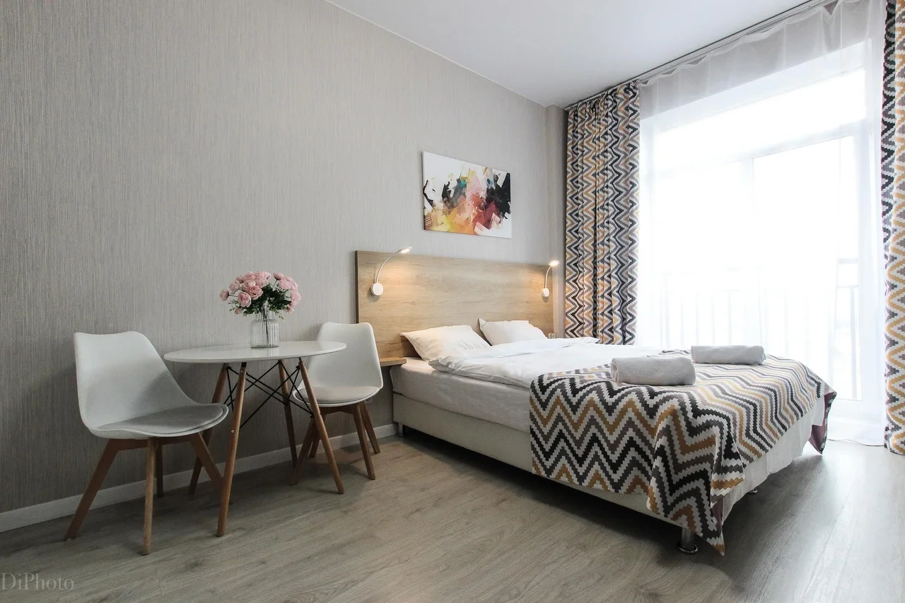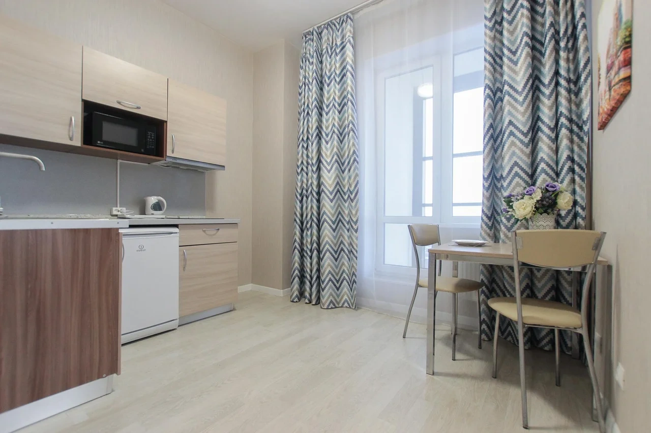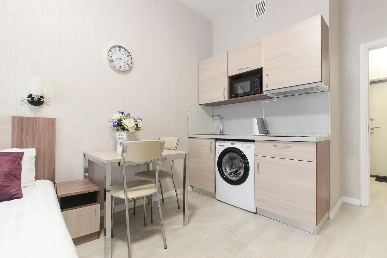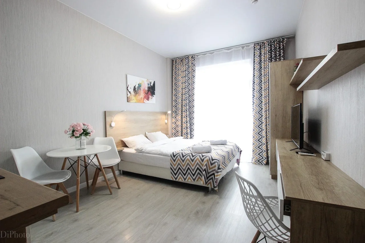 ОБ АПАРТАМЕНТЕ: - Двуспальная кровать 160*200 - Свежее и приятное постельное белье - Шторы blackout для крепкого сна в дневное время и в период белых ночей. - Безлимитный WI-FI. - Телевизор. - Стиральная машинка. - Сушилка. - Утюг с доской. - Фен. - Кухонный гарнитур с варочной поверхностью, холодильником, микроволновкой, чайником, набором посуды для готовки и сервировки. - Удобная обеденная зона. - Чай/кофе, сахар. - Комплект свежих полотенец, одноразовые тапочки, зубные наборы, гигиенические принадлежности.