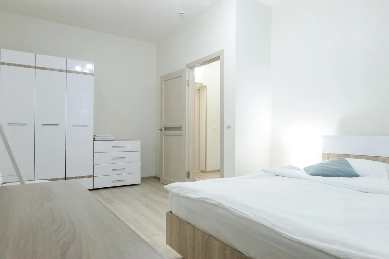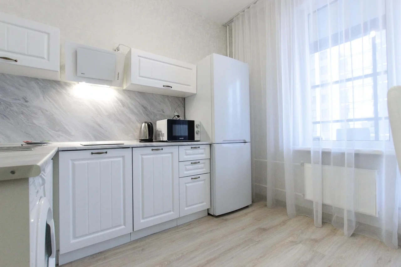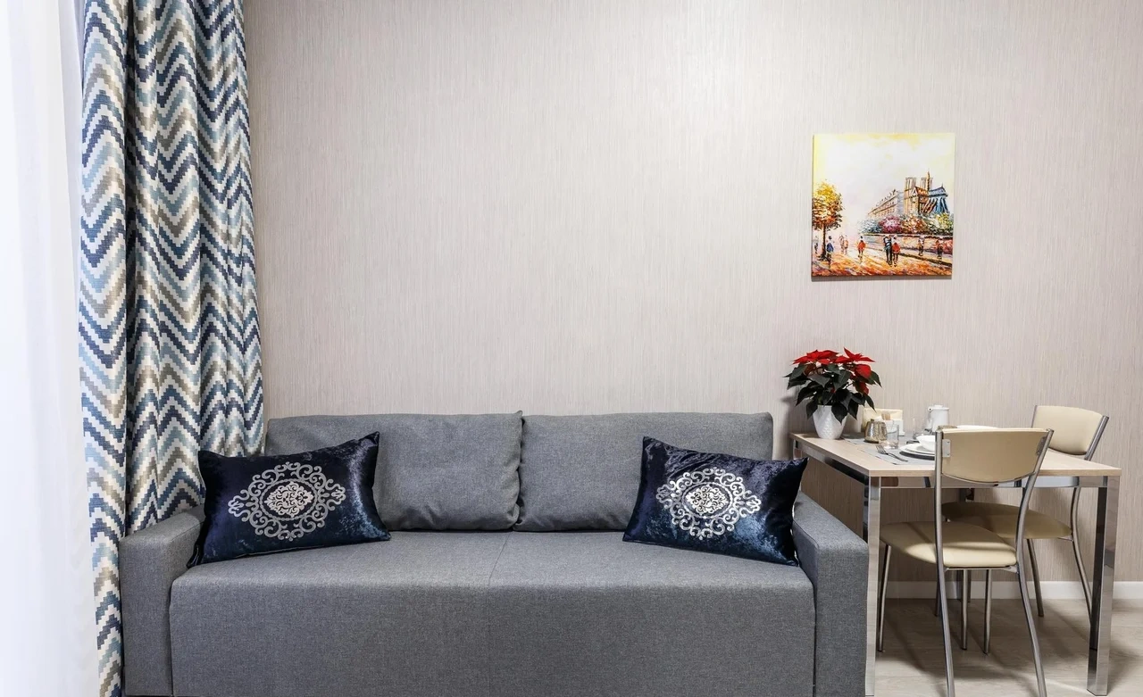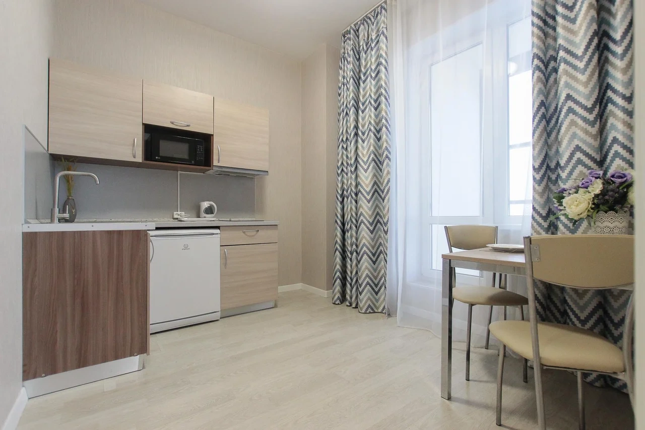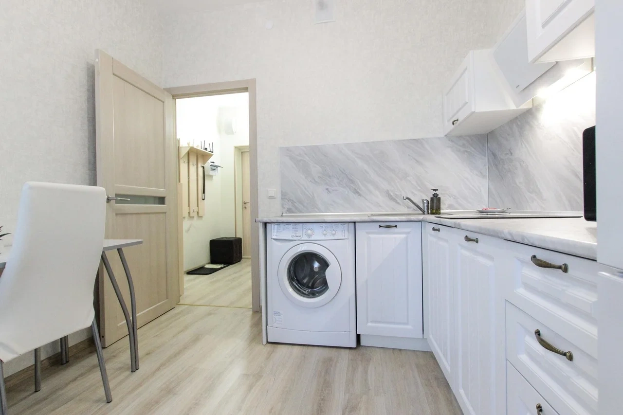 ОБ АПАРТАМЕНТЕ: - Двуспальная кровать 160*200 - Свежее и приятное постельное белье - Шторы blackout для крепкого сна в дневное время и в период белых ночей. - Безлимитный WI-FI. - Телевизор. - Стиральная машинка. - Сушилка. - Утюг с доской. - Фен. - Кухонный гарнитур с варочной поверхностью, холодильником, микроволновкой, чайником, набором посуды для готовки и сервировки. - Удобная обеденная зона. - Чай/кофе, сахар. - Комплект свежих полотенец, одноразовые тапочки, зубные наборы, гигиенические принадлежности.