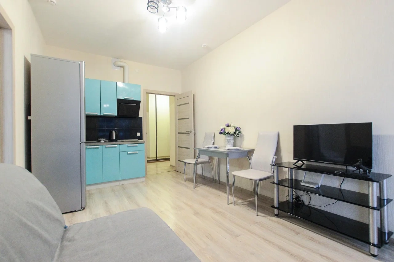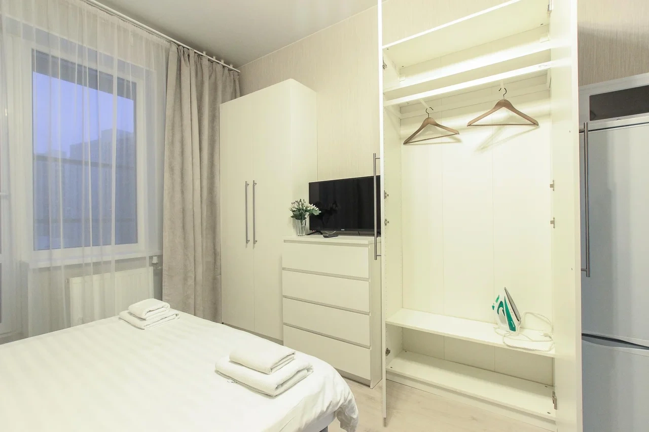 Новые апартаменты в ЖК «Салют» в 10 мин. на такси от аэропорта «Пулково» и в 13мин. пешком от м.Звёздная ОБ АПАРТАМЕНТЕ: - Двуспальная кровать 160*200 - Свежее и приятное постельное белье - Шторы blackout для крепкого сна в дневное время и в период белых ночей. - Безлимитный WI-FI. - Телевизор. - Стиральная машинка. - Сушилка. - Утюг с доской. - Фен. - Кухонный гарнитур с варочной поверхностью, холодильником, микроволновкой, чайником, набором посуды для готовки и сервировки. - Удобная обеденная зона. - Чай/кофе, сахар. - Комплект свежих полотенец, одноразовые тапочки, зубные наборы, гигиенические принадлежности.