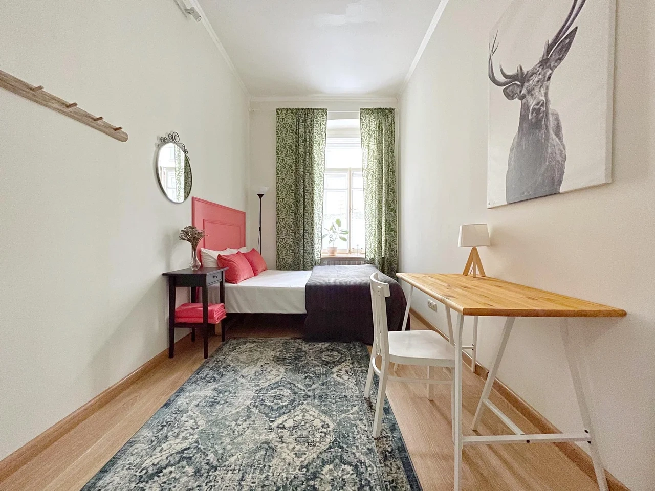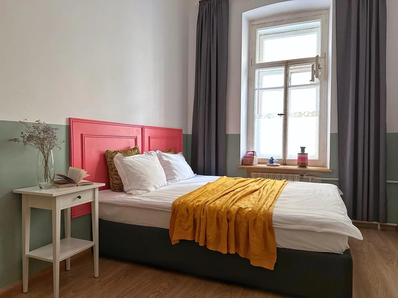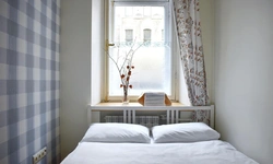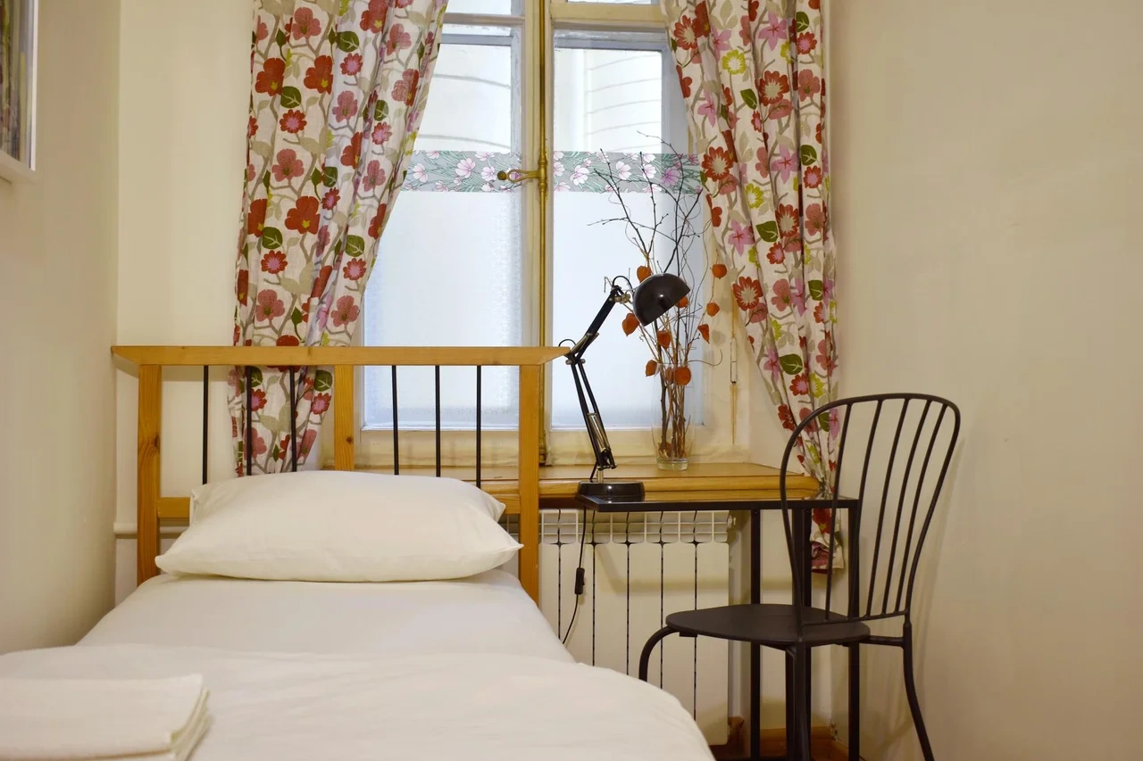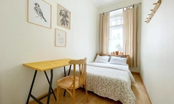 Уютный номер отличается воздушным дизайном и функциональностью. В номере есть двуспальная кровать, стол, стул, кровать. Номер оборудован зеркалом и вешалкой с плечиками для одежды. Освещение включает: основной свет и настольную лампу. Гостям предоставляется бесплатный WI-FI, тапочки, постельное белье и полотенца. Душ и туалет в общем доступе. Огромное окно делает номер очень воздушным и светлым.