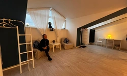 Просторный семейный номер с тремя двуспальными кроватями и красивым видом на крыши города, кофейным и рабочим столиками, креслом, модульной секцией для одежды. В номере мансардное и одно видовое окно. В отеле общие ванные комнаты с санузлами и просторная кухонная зона со всей необходимой посудой и техникой.