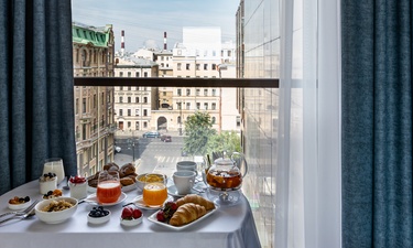 Ежедневно в ресторане отеля проходят завтраки в формате «шведский стол». Также гости могут заказать завтрак в номер по меню a la carte. В выходные и праздничные дни во время завтрака гостей угощают игристым без ограничений.