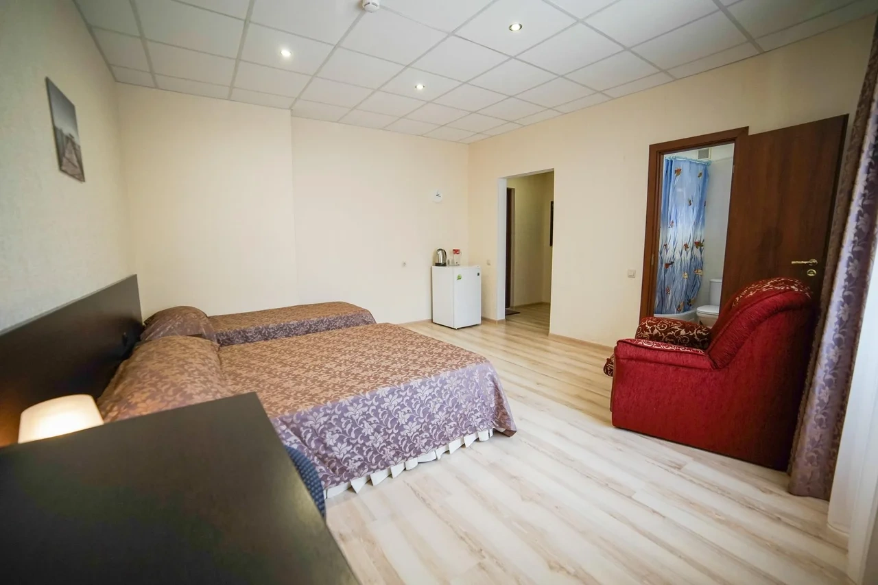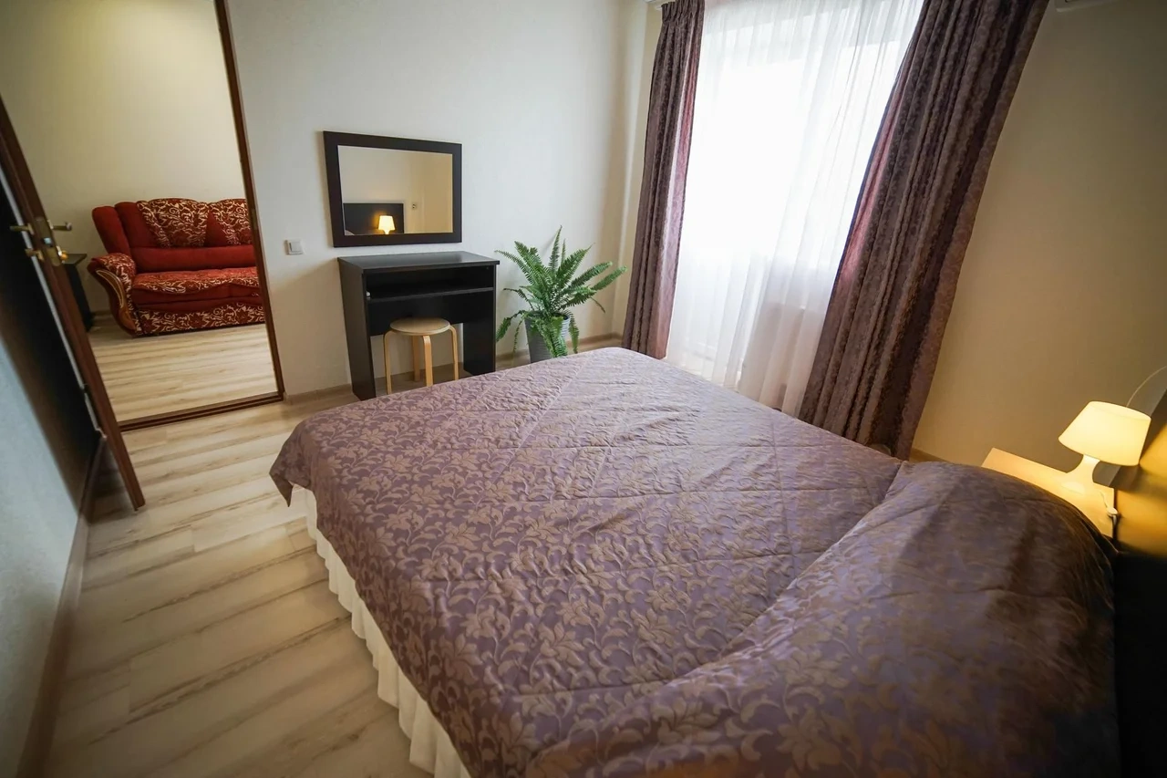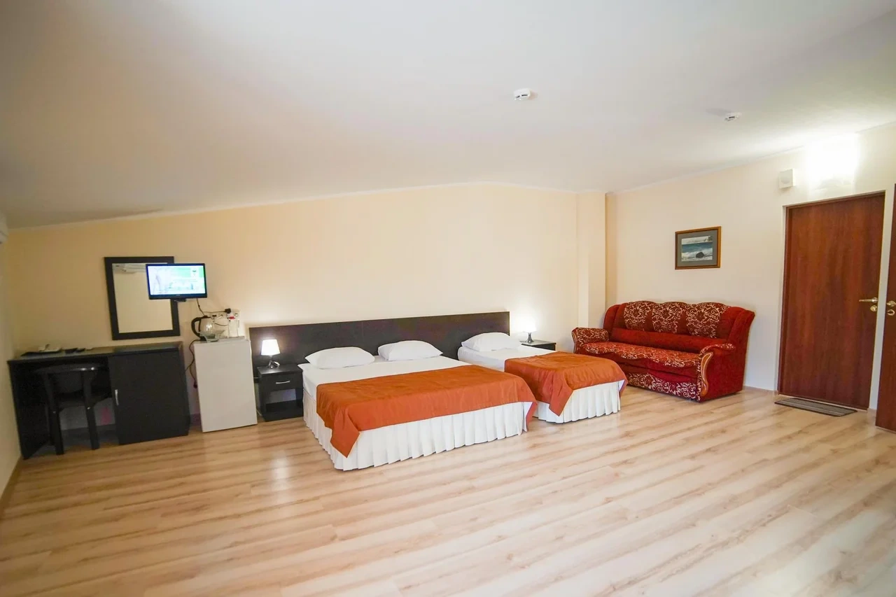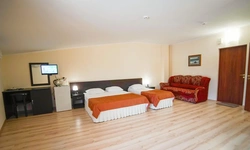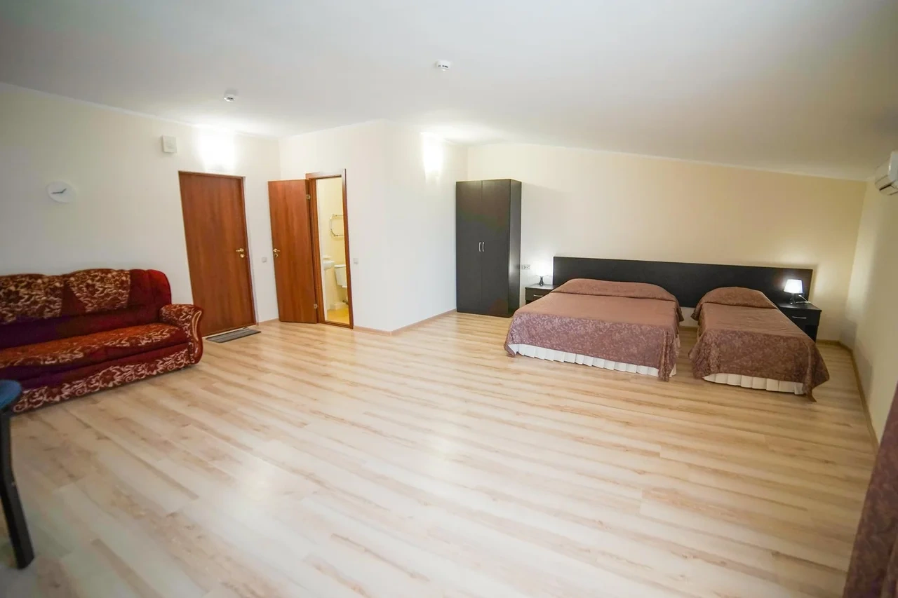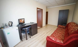 Однокомнатный номер увеличенной площади с двуспальной, односпальной кроватью и диваном. Современный лаконичный дизайн интерьера не перегружен деталями, тем самым оставляя достаточно пространства для комфортного размещения. Возможно размещение в номере до 5 человек (с дополнительной оплатой).