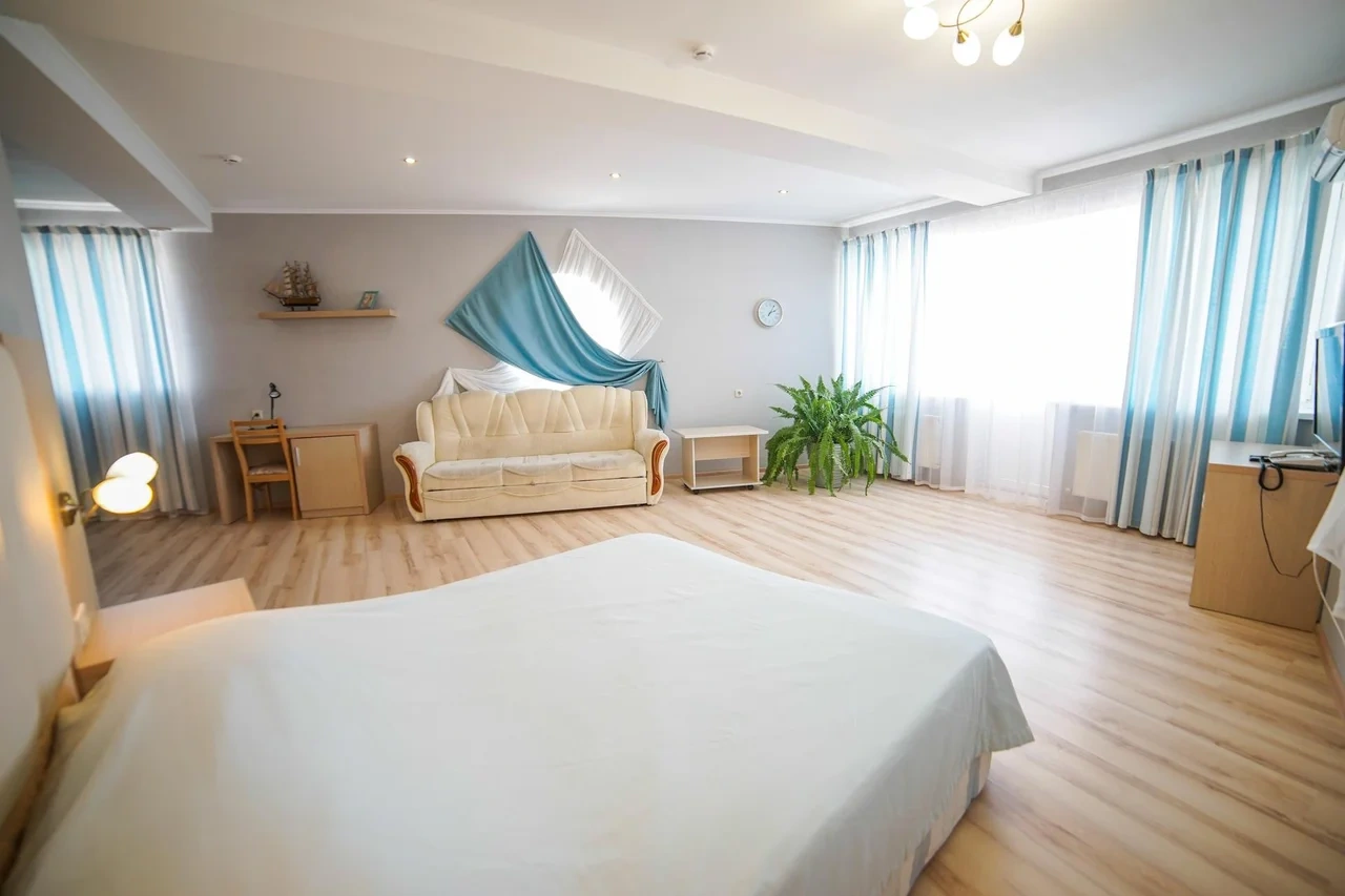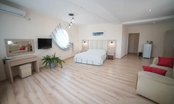 Просторный номер с прекрасным видом на морское побережье. Большие окна делают помещение достаточно светлым, а легкий и ненавязчивый морской интерьер создает непередаваемое ощущение уюта. В декоре преобладают серо-голубые оттенки, придающие номеру изысканность и элегантность.