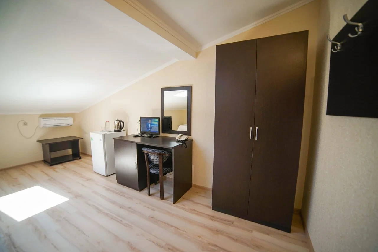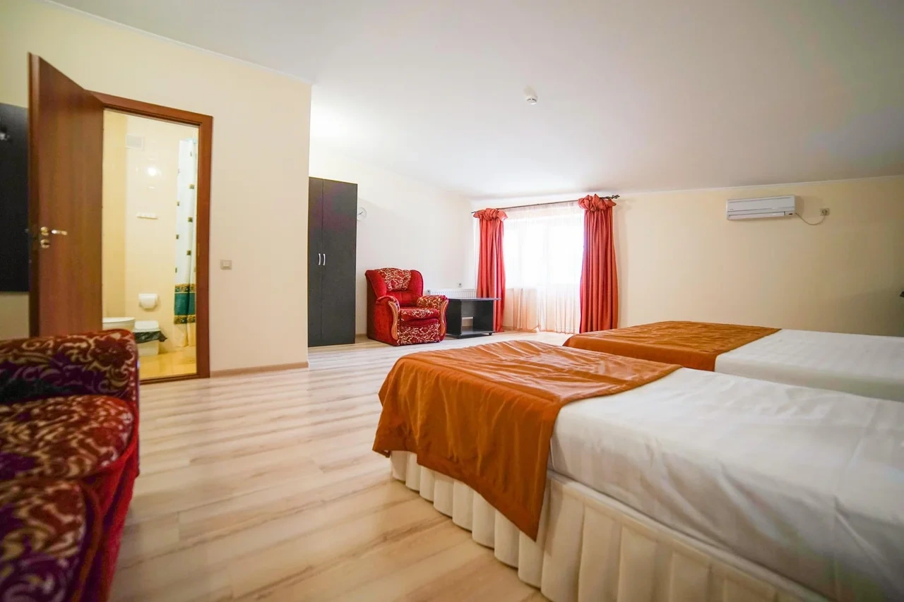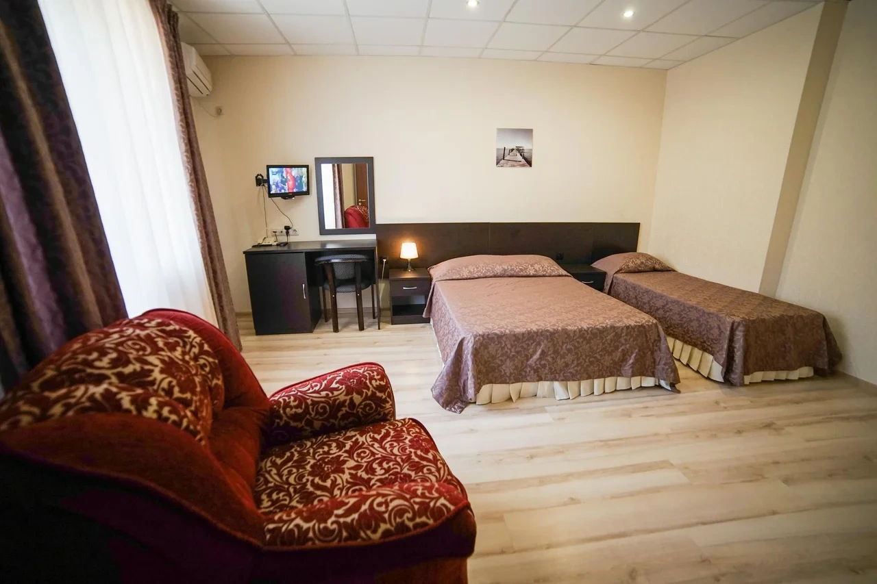 Уютный номер площадью 23-25 кв.м., выполненный в классическом стиле, оборудован двуспальной и односпальной кроватью, удобным рабочим столом, телевизором с плоским экраном, сплит-системой, холодильником, телефоном. Имеются номера с и без балкона. В ванной комнате: душ, раковина.