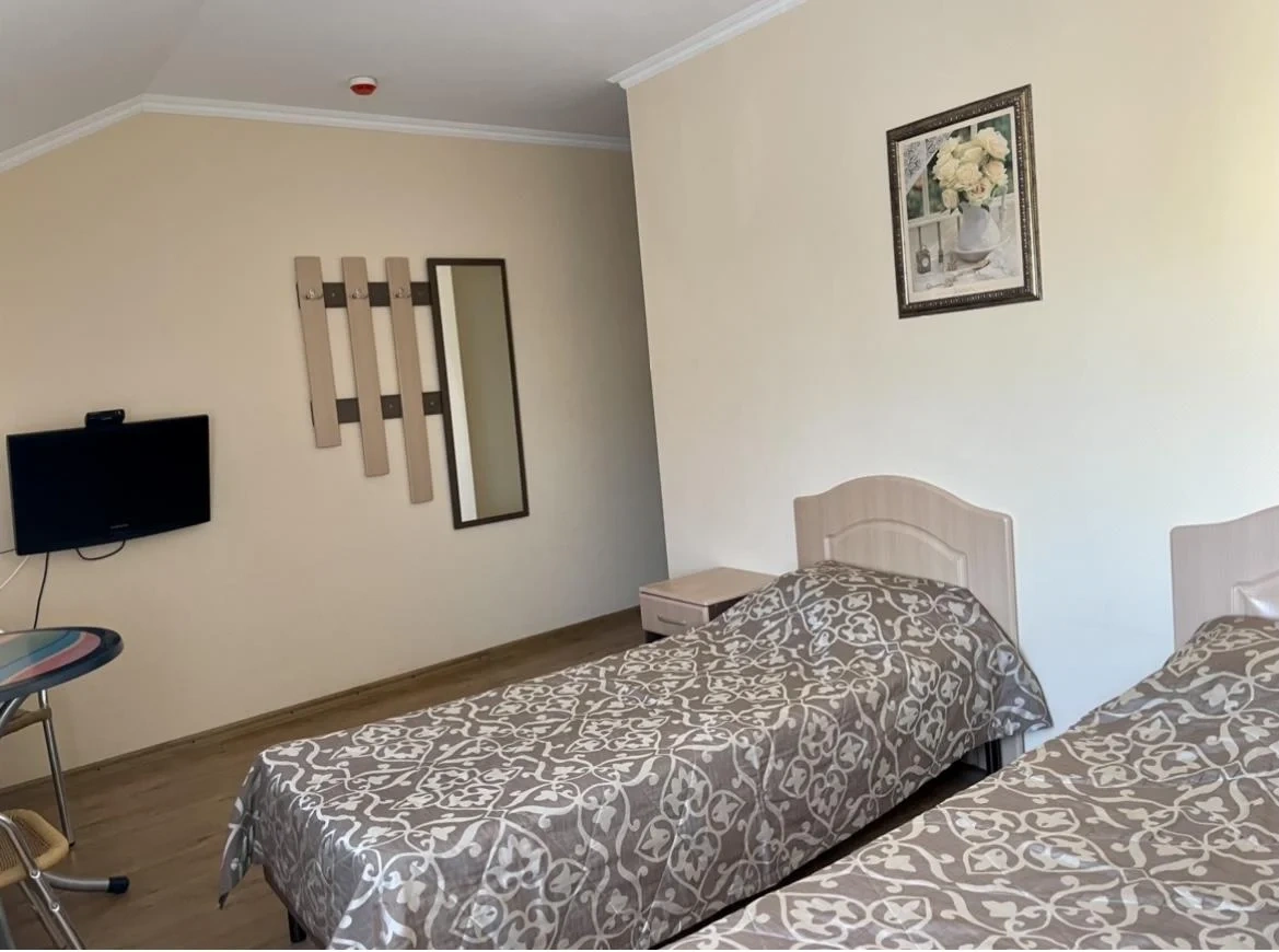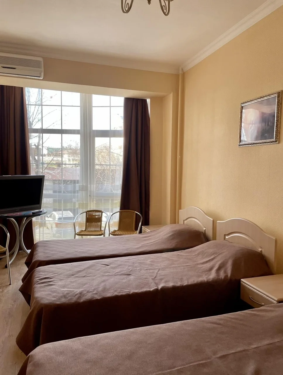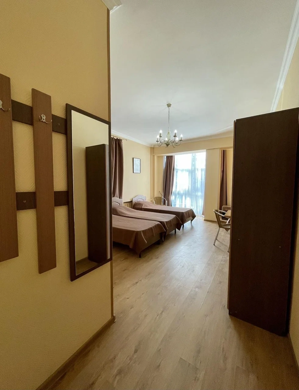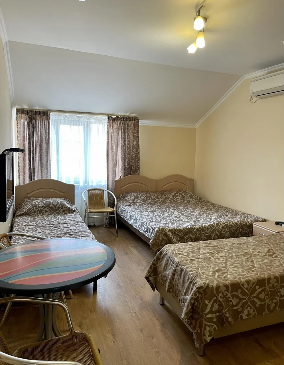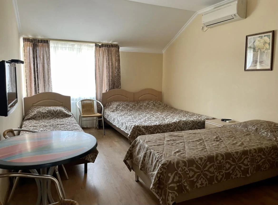 двуспальная и односпальные кровати, шкаф для одежды, тумбочки, стол, стулья, зеркало, вешалка, кондиционер, телевизор, холодильник на этаже, гладильная доска с утюгом на этаже, собственный санузел с душем, туалетная бумага, wi-fi (входит в стоимость)