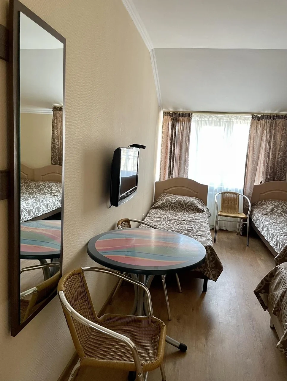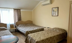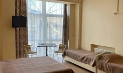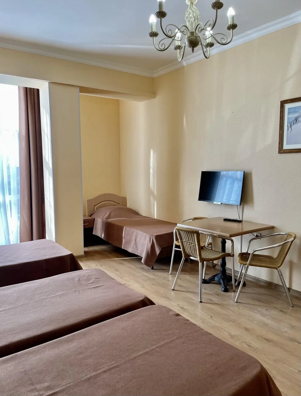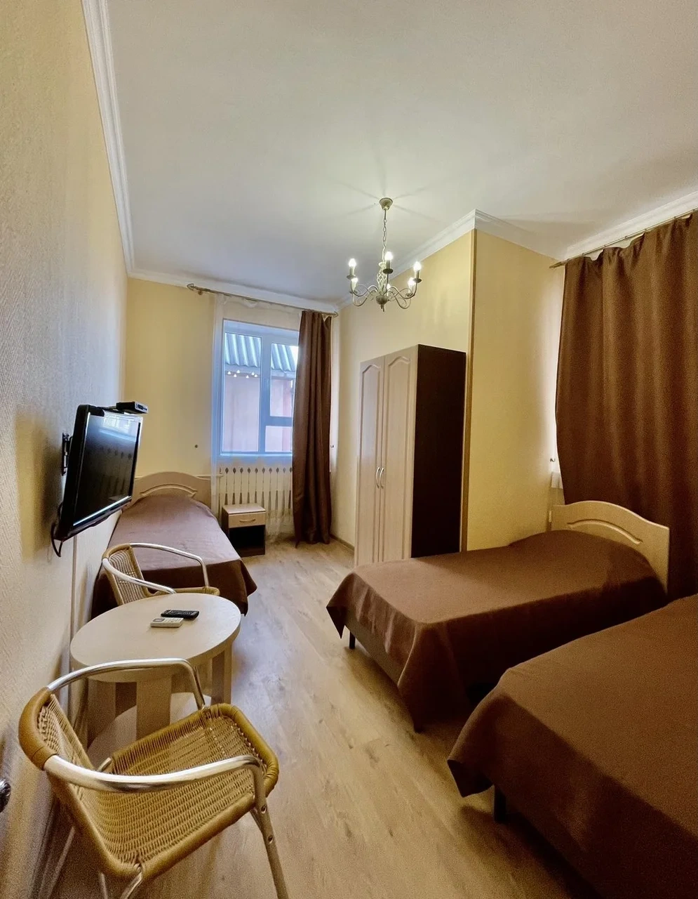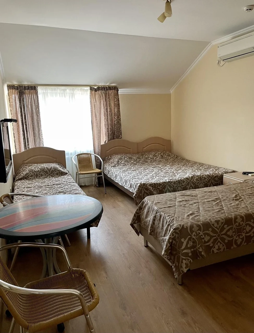 двуспальная и односпальные кровати, шкаф для одежды, тумбочки, стол, стулья, зеркало, вешалка, кондиционер, телевизор, холодильник на этаже, гладильная доска с утюгом на этаже, собственный санузел с душем, туалетная бумага, wi-fi (входит в стоимость)