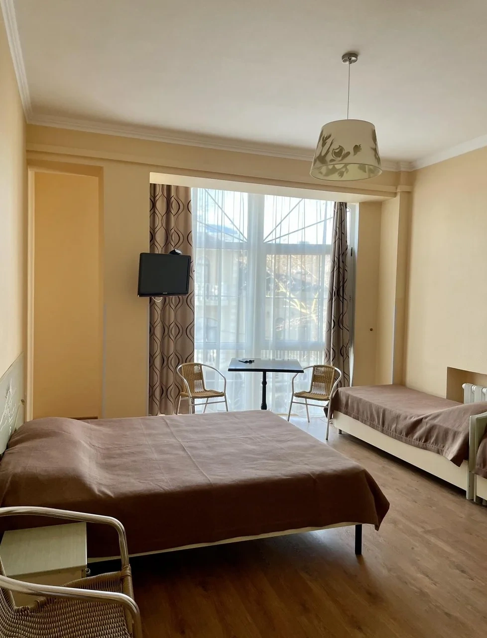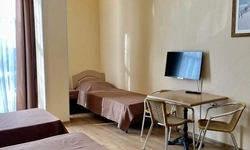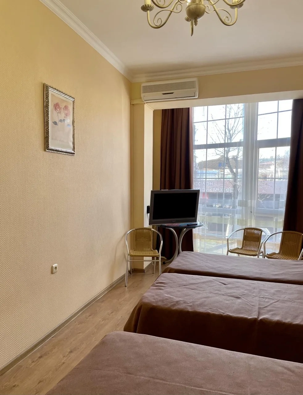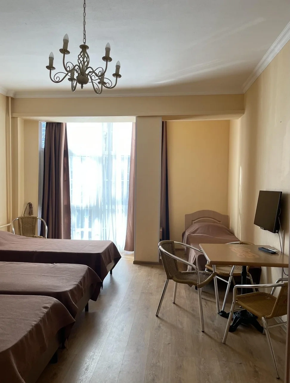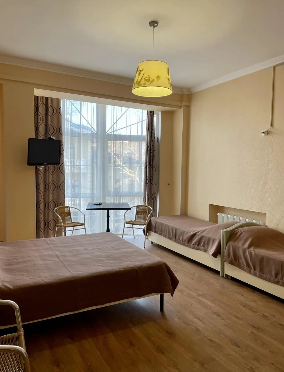 двуспальная и односпальные кровати, шкаф для одежды, тумбочки, стол, стулья, зеркало, вешалка, кондиционер, телевизор, холодильник на этаже, гладильная доска с утюгом на этаже, собственный санузел с душем, туалетная бумага, wi-fi (входит в стоимость)