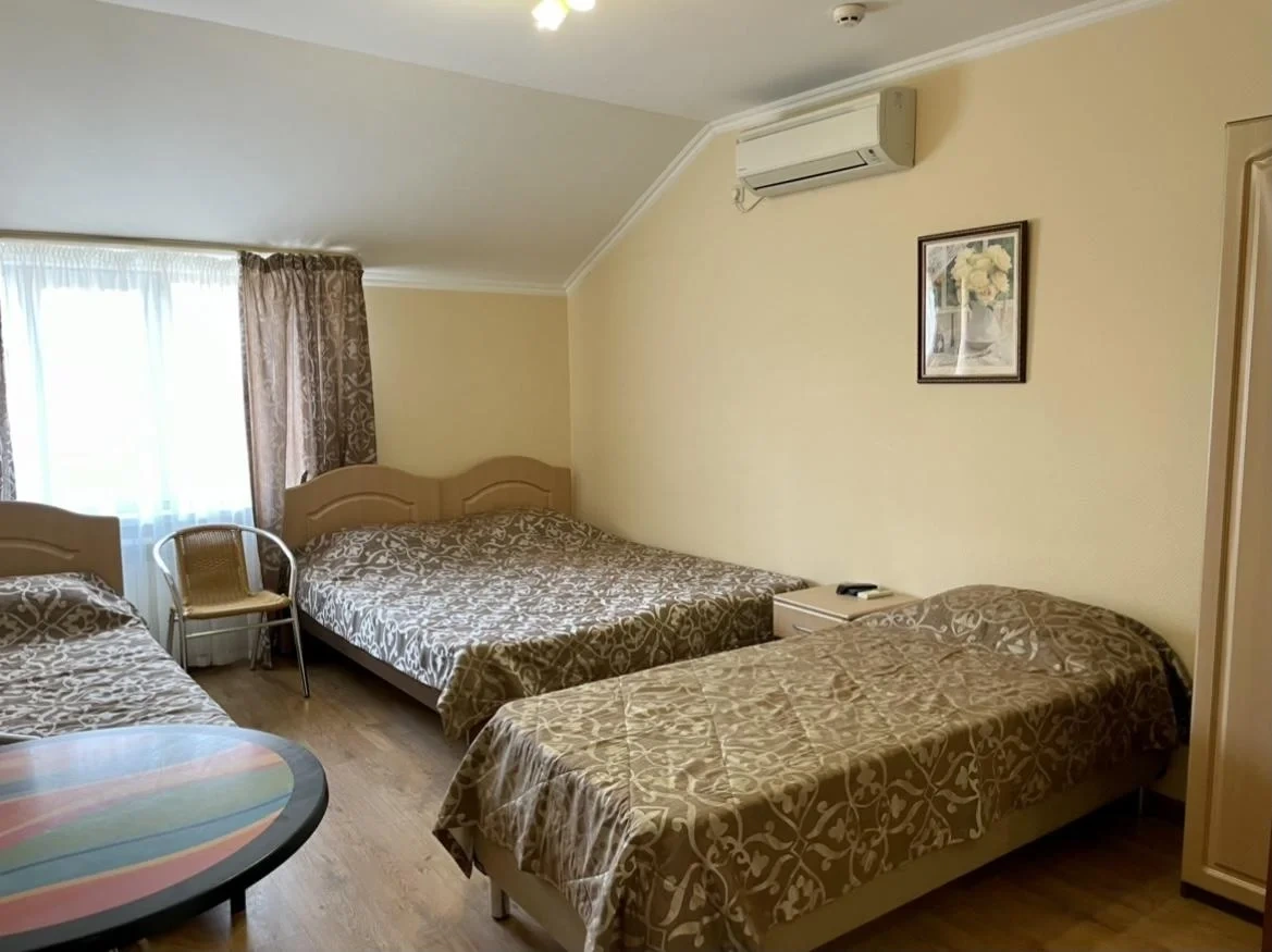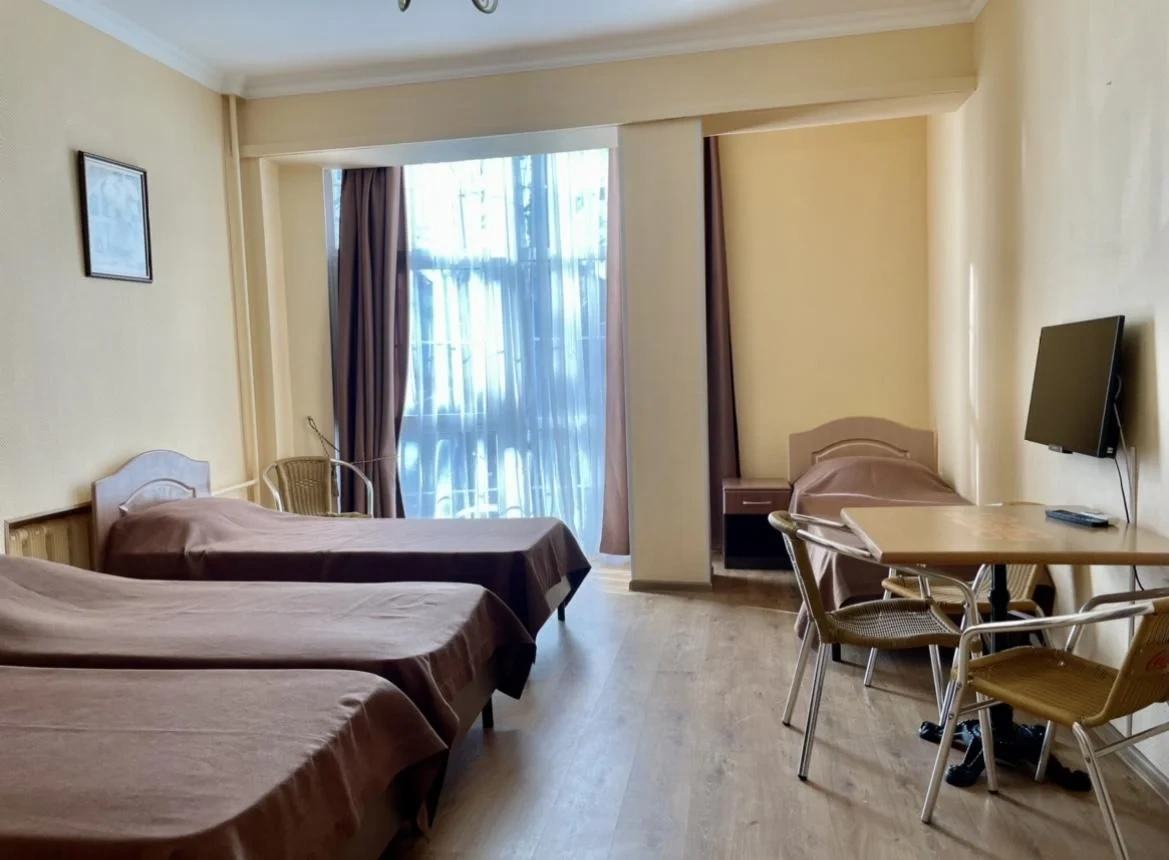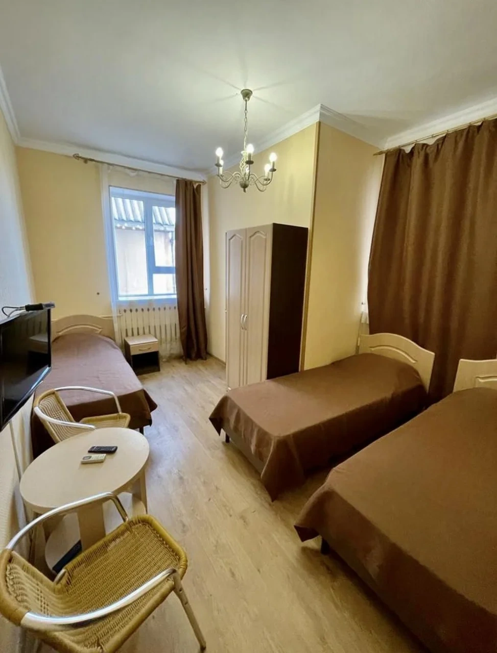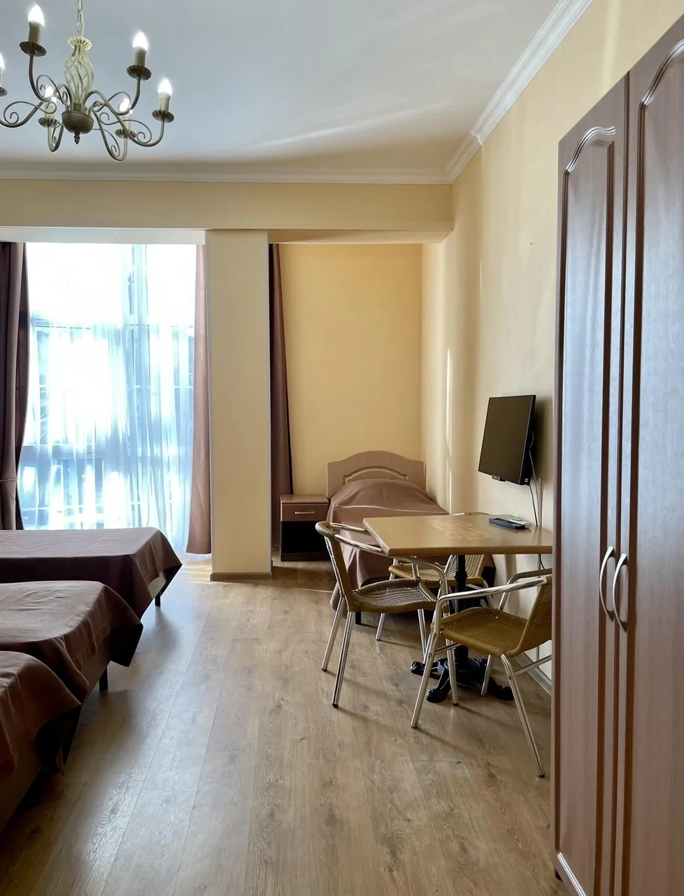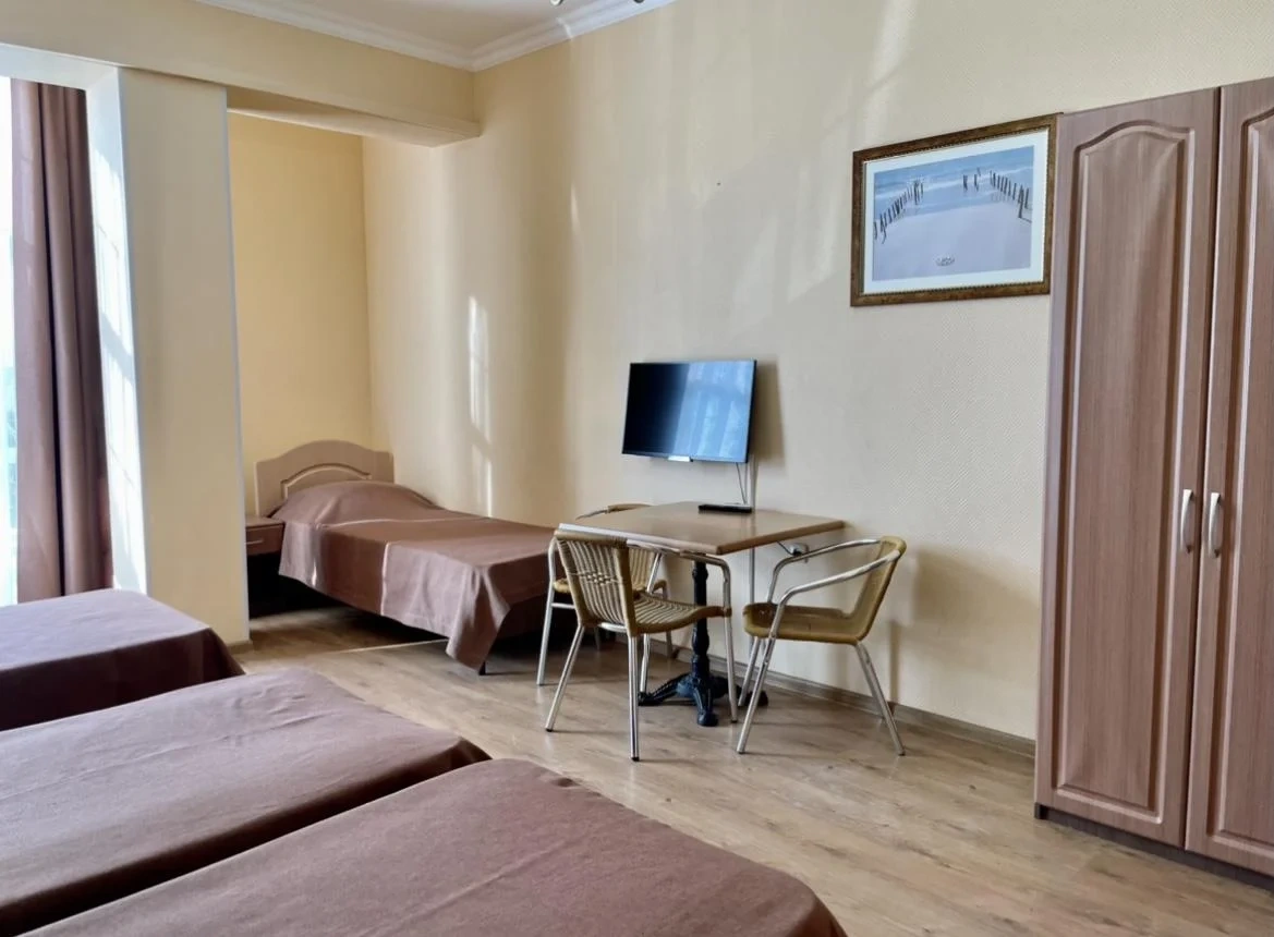 двуспальная и односпальные кровати, шкаф для одежды, тумбочки, стол, стулья, зеркало, вешалка, кондиционер, телевизор, холодильник на этаже, гладильная доска с утюгом на этаже, собственный санузел с душем, туалетная бумага, wi-fi (входит в стоимость)