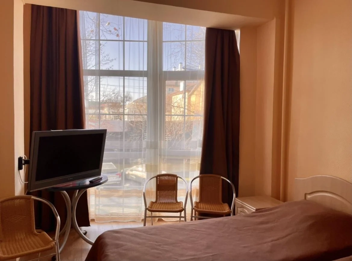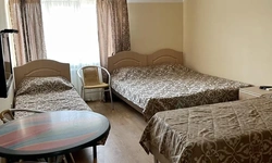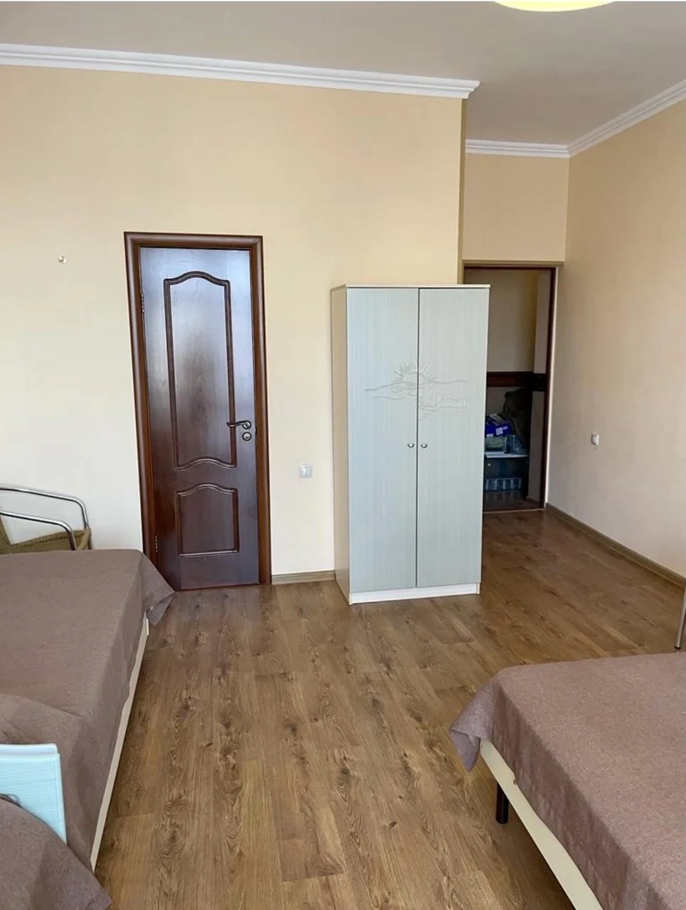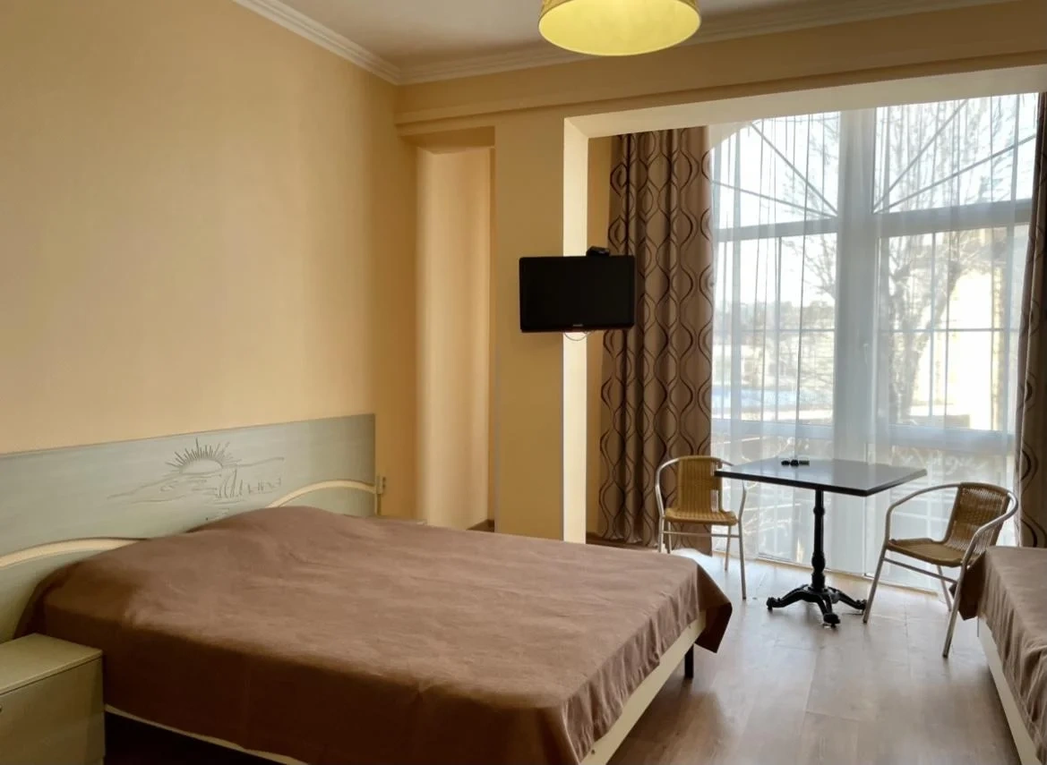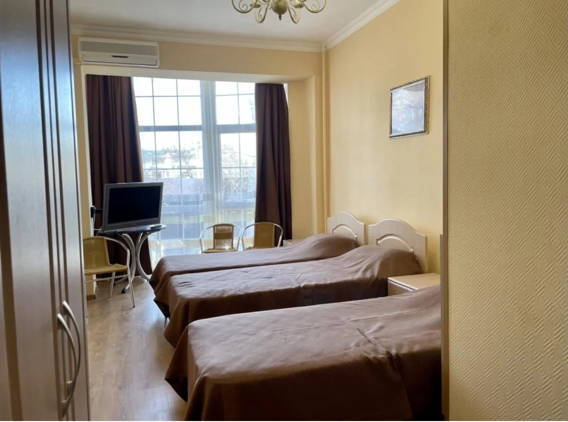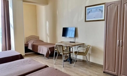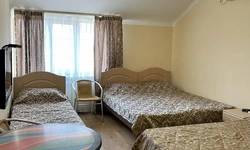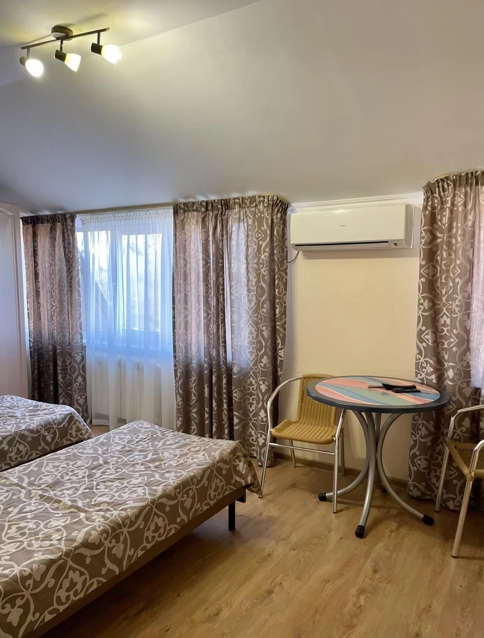 двуспальная и односпальные кровати, шкаф для одежды, тумбочки, стол, стулья, зеркало, вешалка, кондиционер, телевизор, холодильник на этаже, гладильная доска с утюгом на этаже, собственный санузел с душем, туалетная бумага, wi-fi (входит в стоимость)
