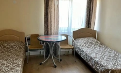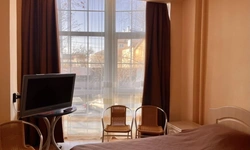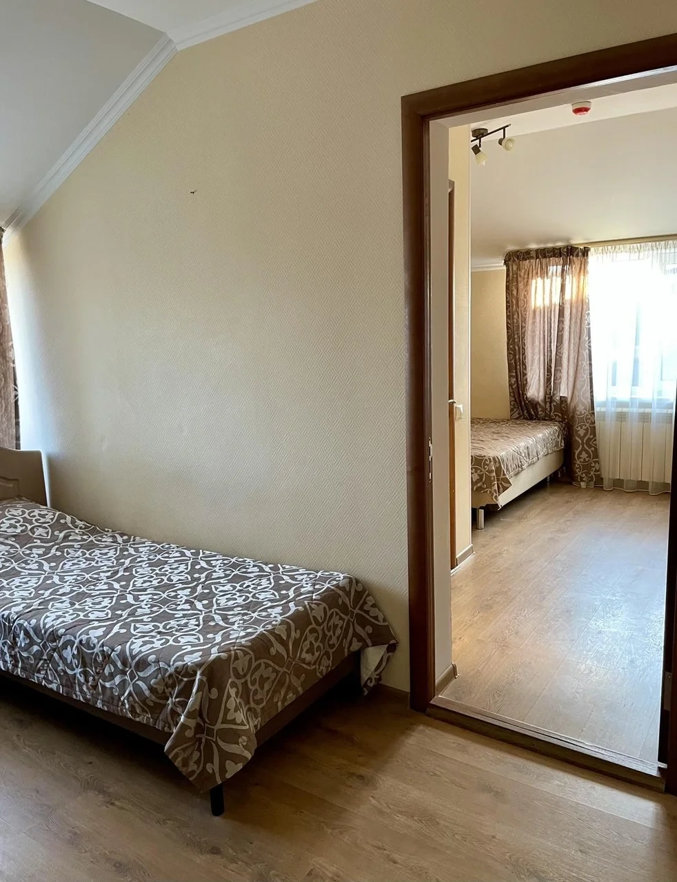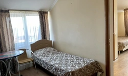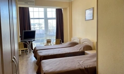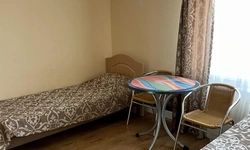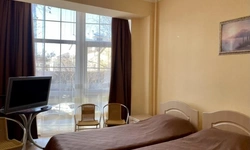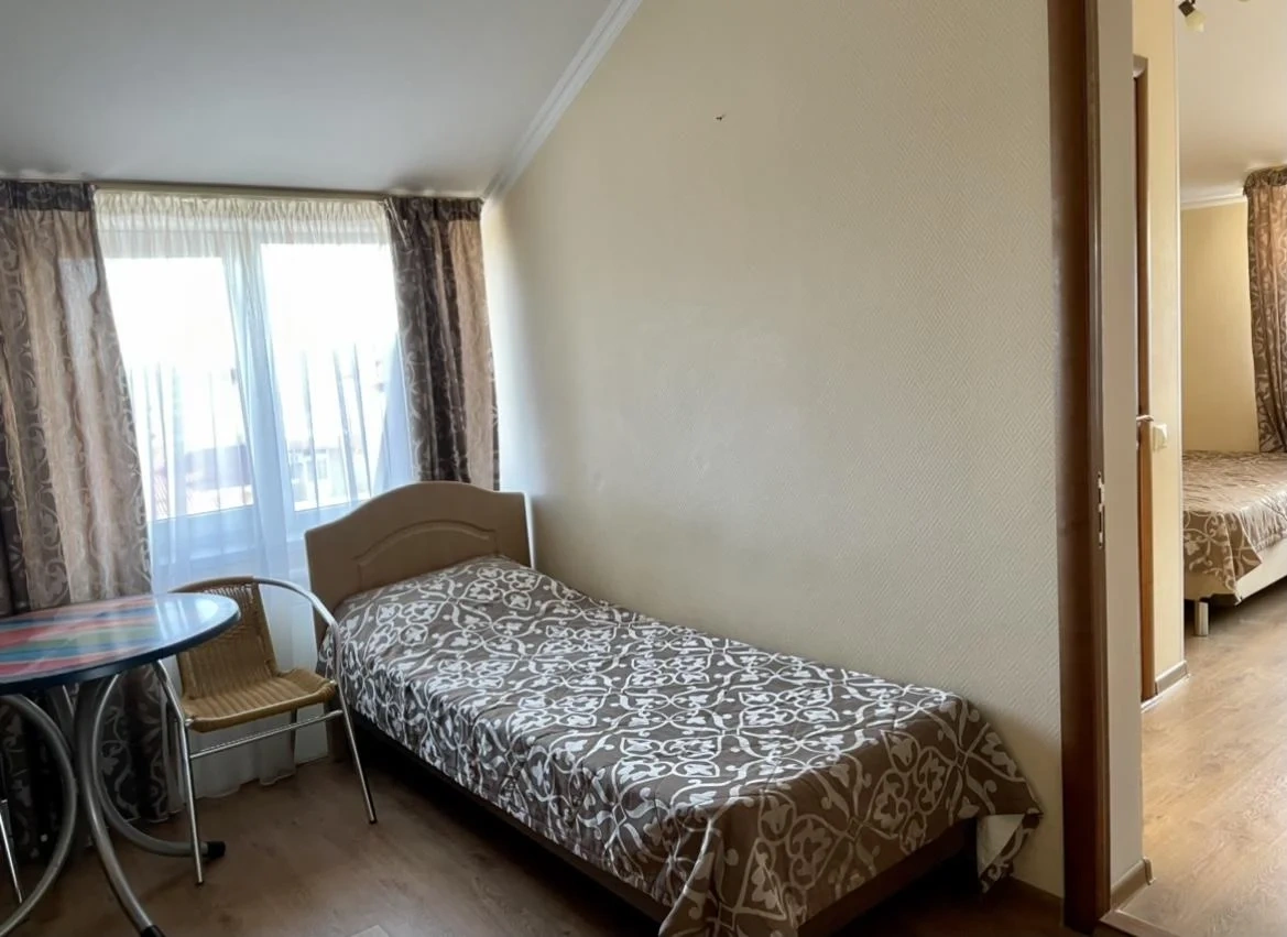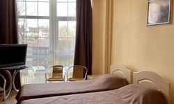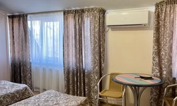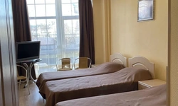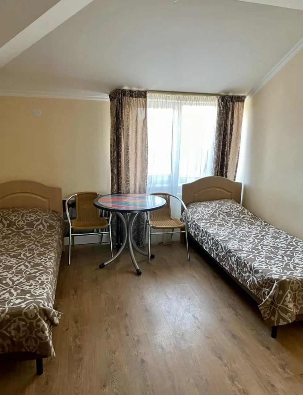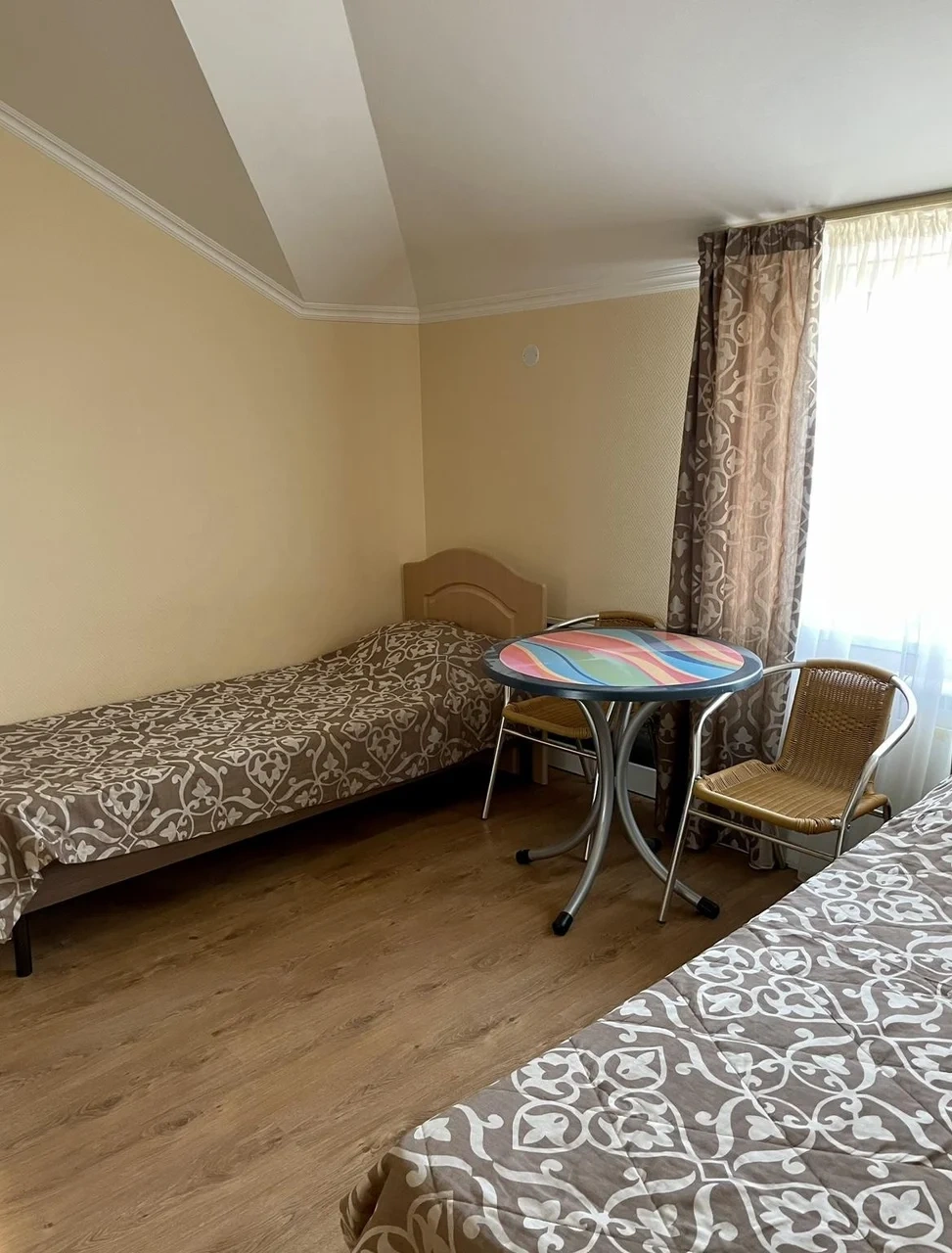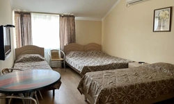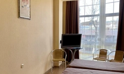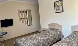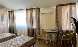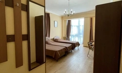 двуспальная и односпальные кровати, шкаф для одежды, тумбочки, стол, стулья, зеркало, вешалка, кондиционер, телевизор, холодильник на этаже, гладильная доска с утюгом на этаже, собственный санузел с душем, туалетная бумага, wi-fi (входит в стоимость)