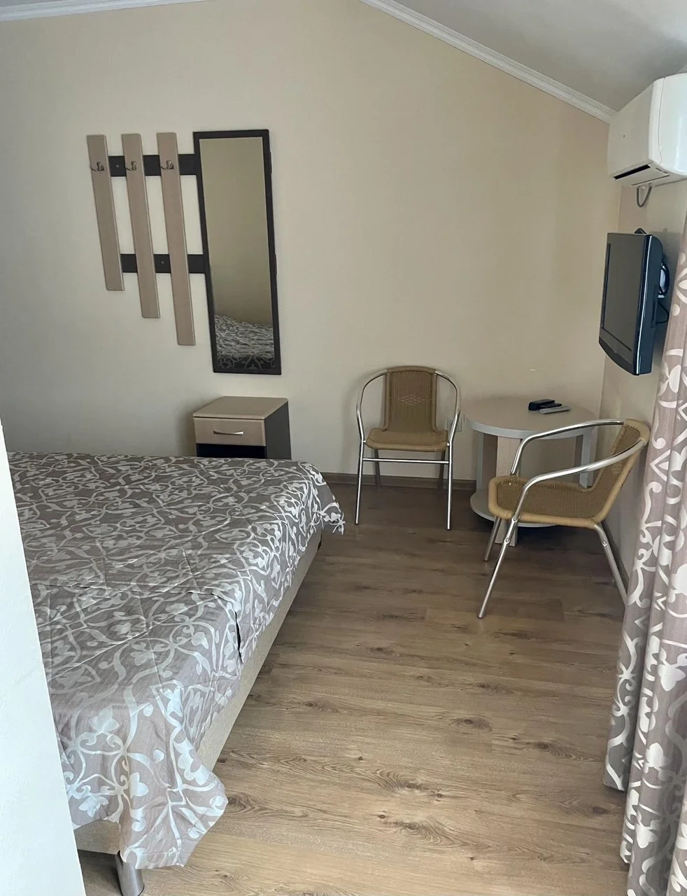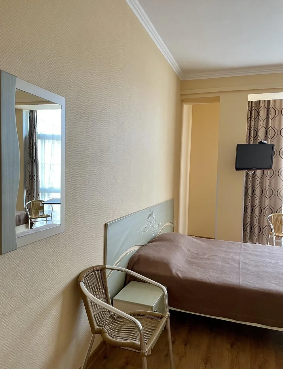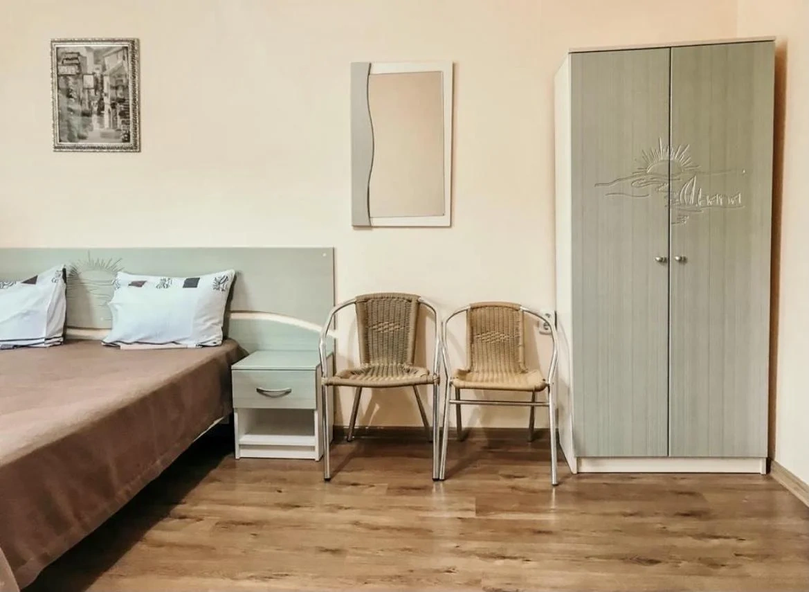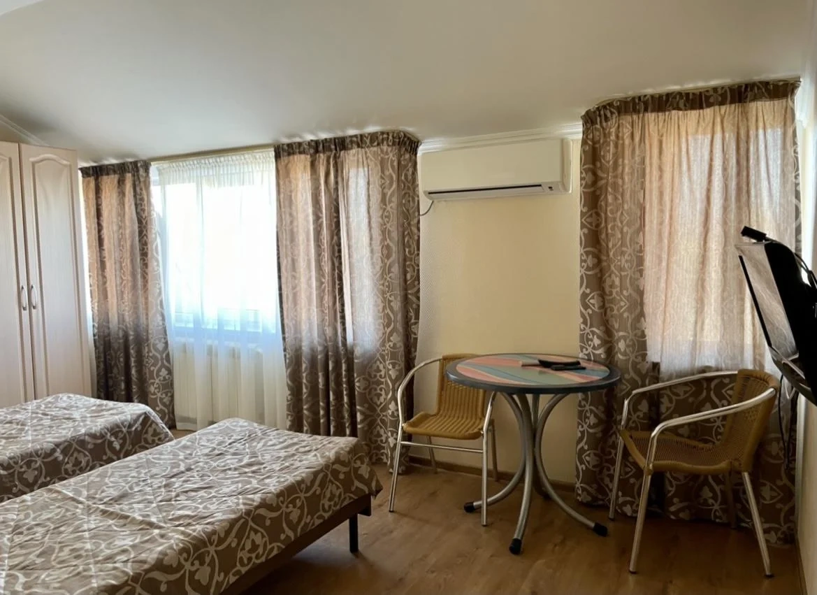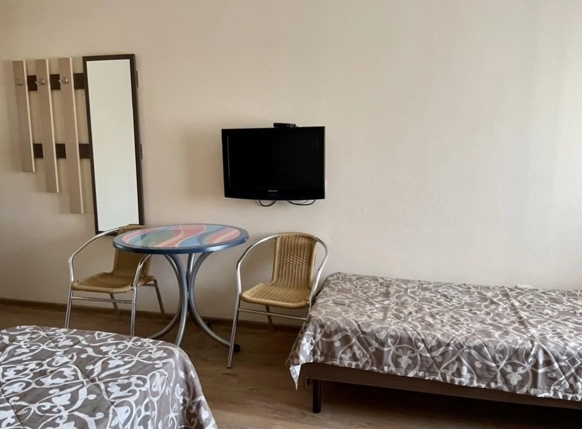 двуспальная и односпальная кровати, шкаф для одежды, тумбочки, стол, стулья, зеркало, вешалка, кондиционер, телевизор, холодильник на этаже, гладильная доска с утюгом на этаже, собственный санузел с душем, туалетная бумага, wi-fi (входит в стоимость)
