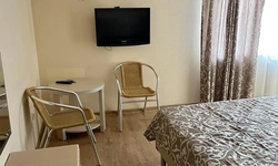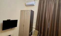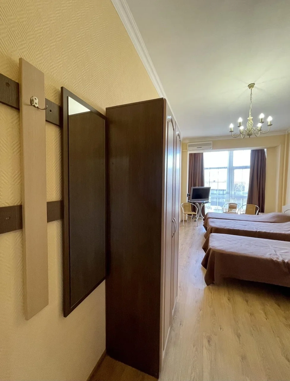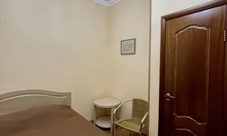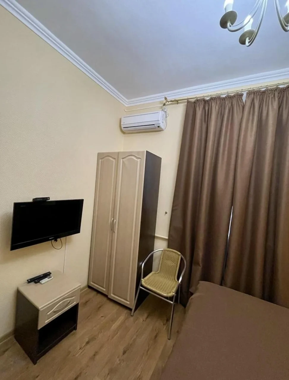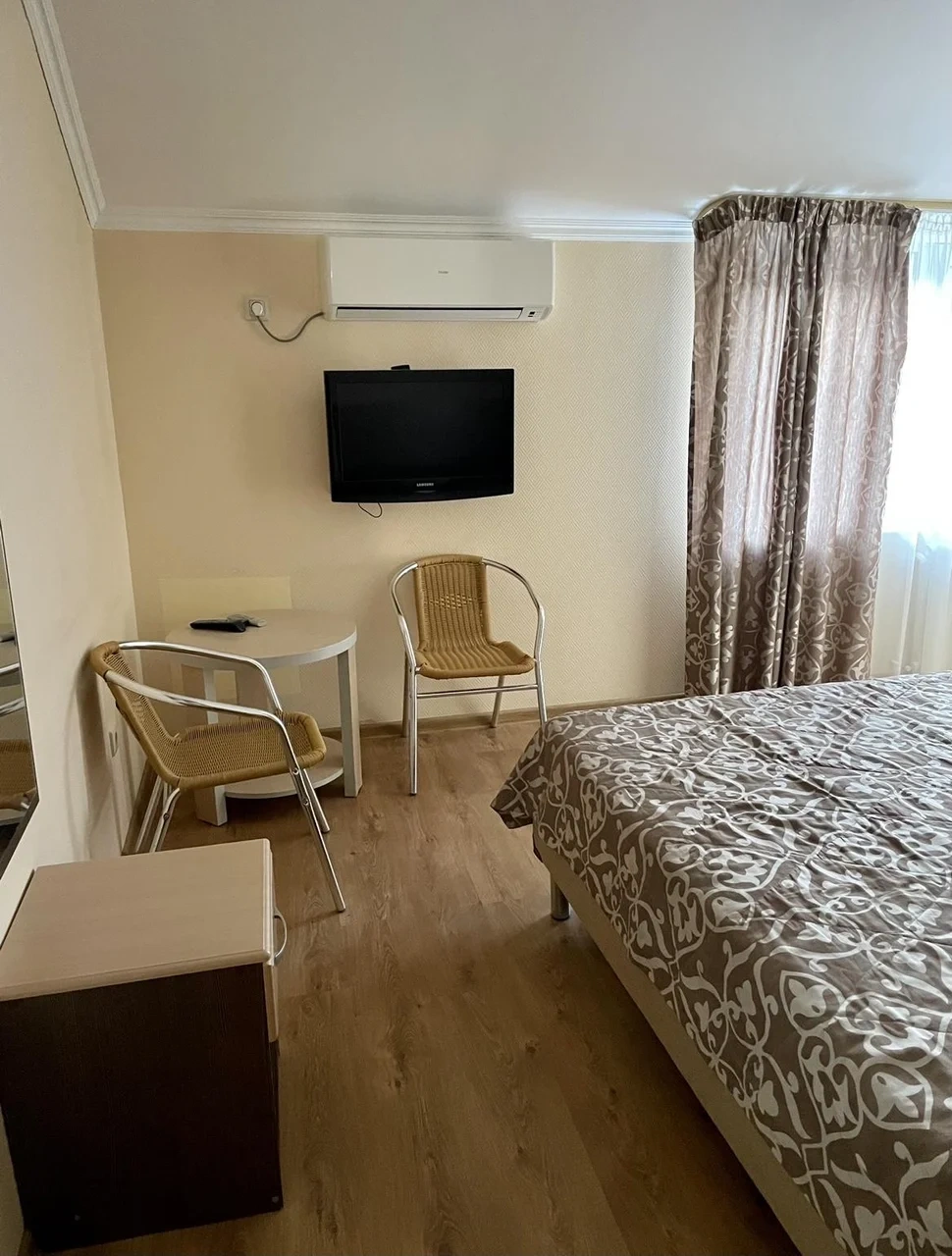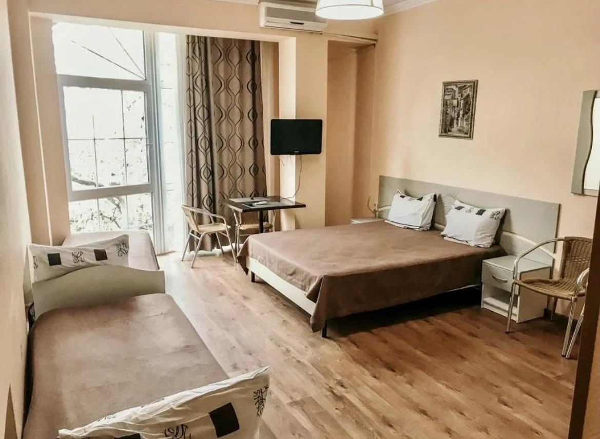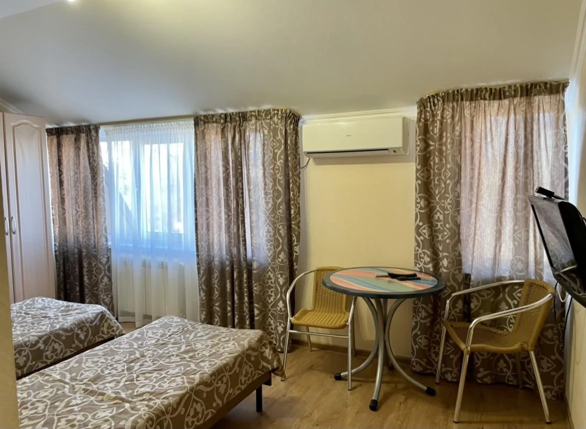 двуспальная и односпальная кровати, шкаф для одежды, тумбочки, стол, стулья, зеркало, вешалка, кондиционер, телевизор, холодильник на этаже, гладильная доска с утюгом на этаже, собственный санузел с душем, туалетная бумага, wi-fi (входит в стоимость)