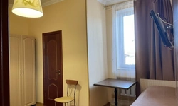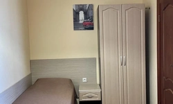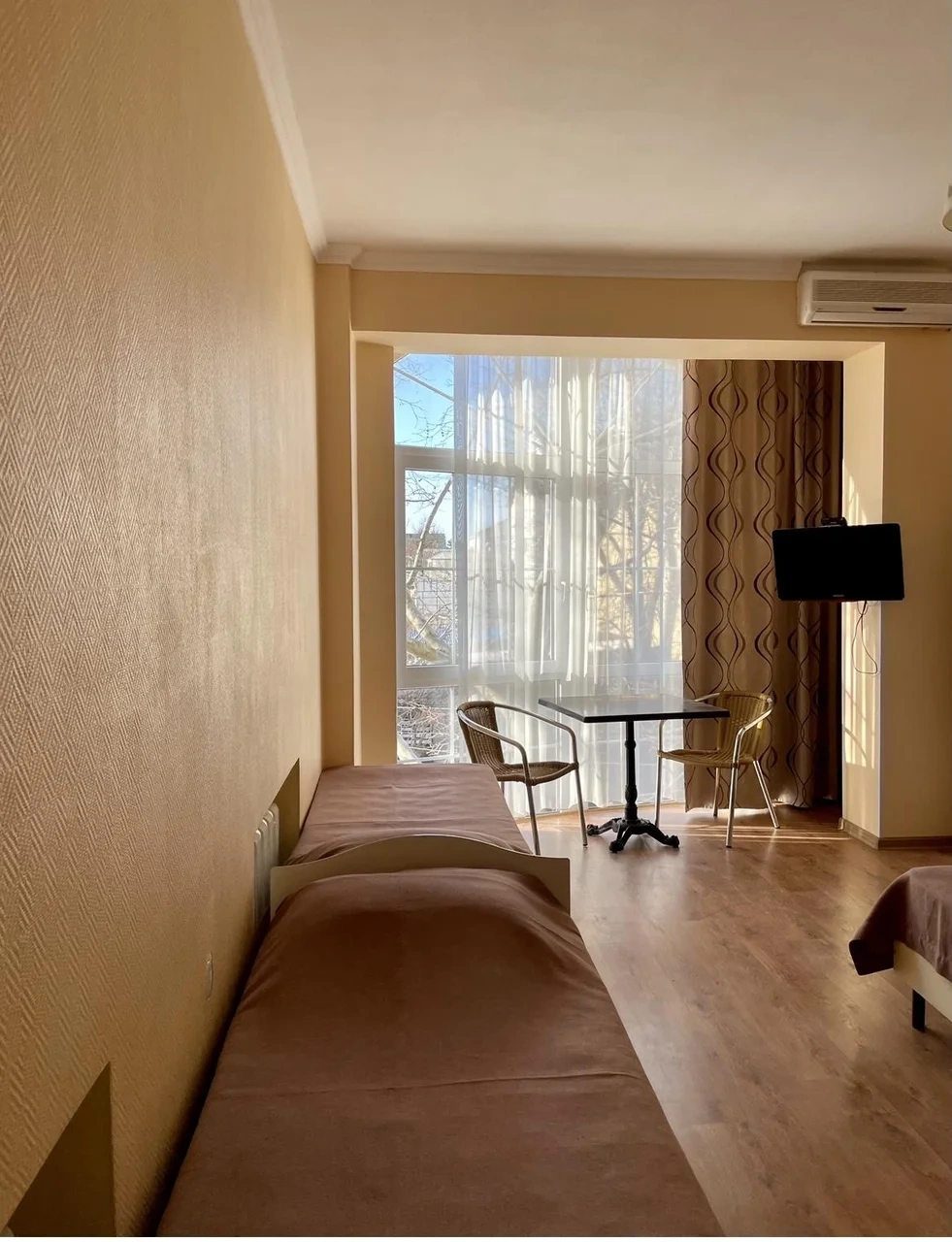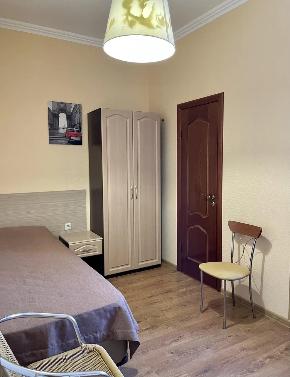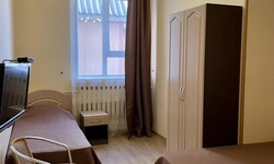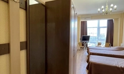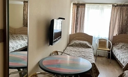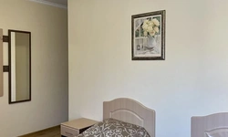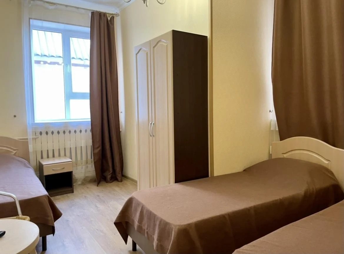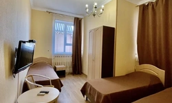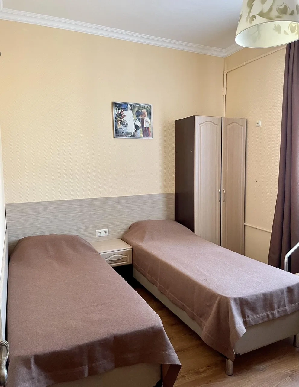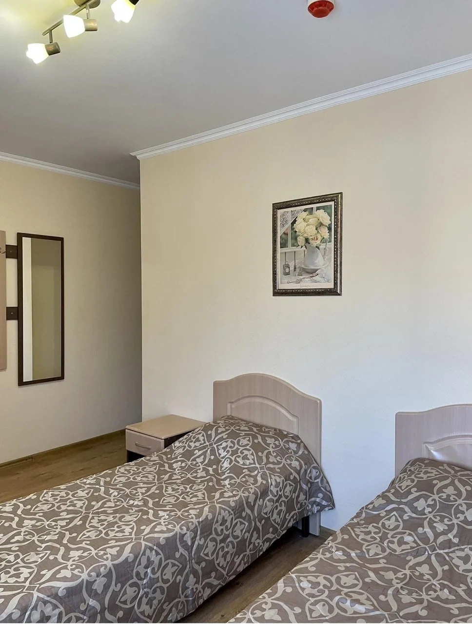 2 односпальные, или двуспальная кровать, шкаф для одежды, тумбочки, стол, стулья, зеркало, вешалка,кондиционер, телевизор, холодильник на этаже, гладильная доска с утюгом на этаже, собственный санузел с душем, туалетная бумага, wi-fi (входит в стоимость)