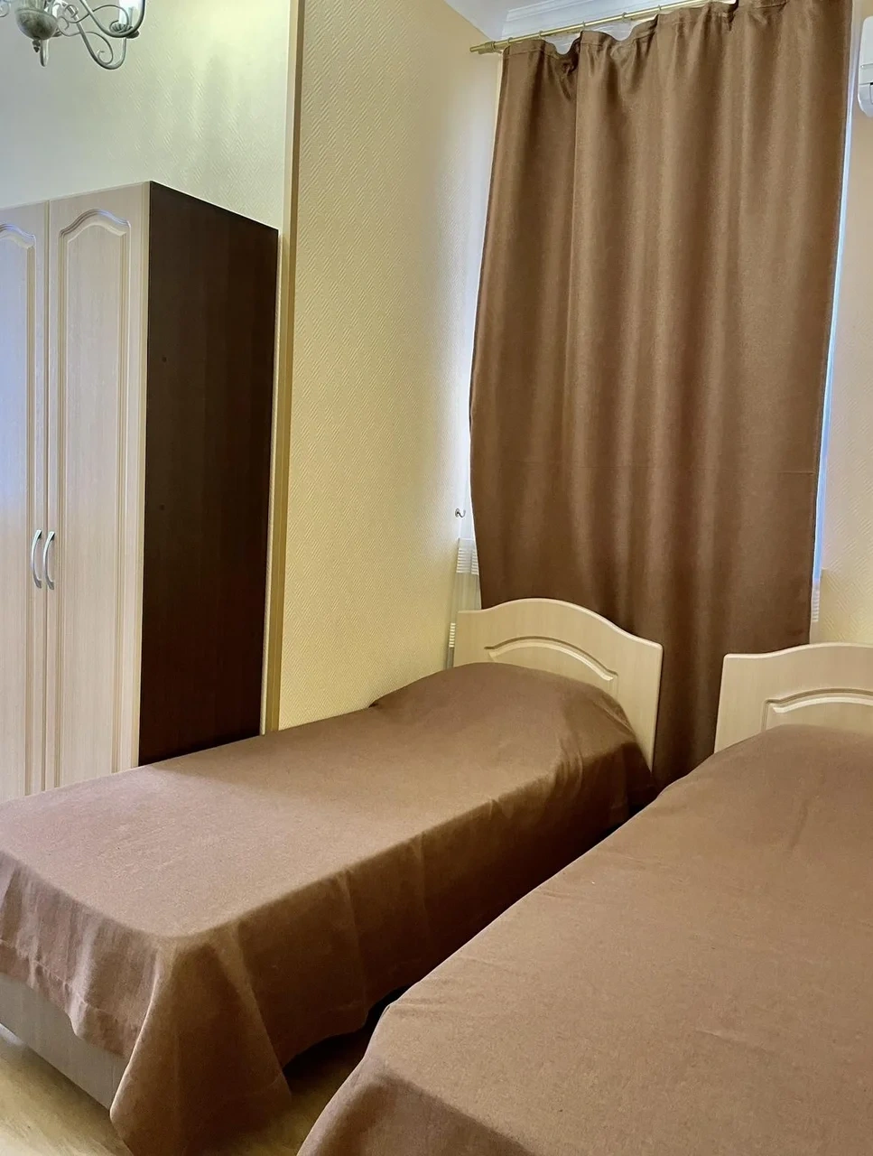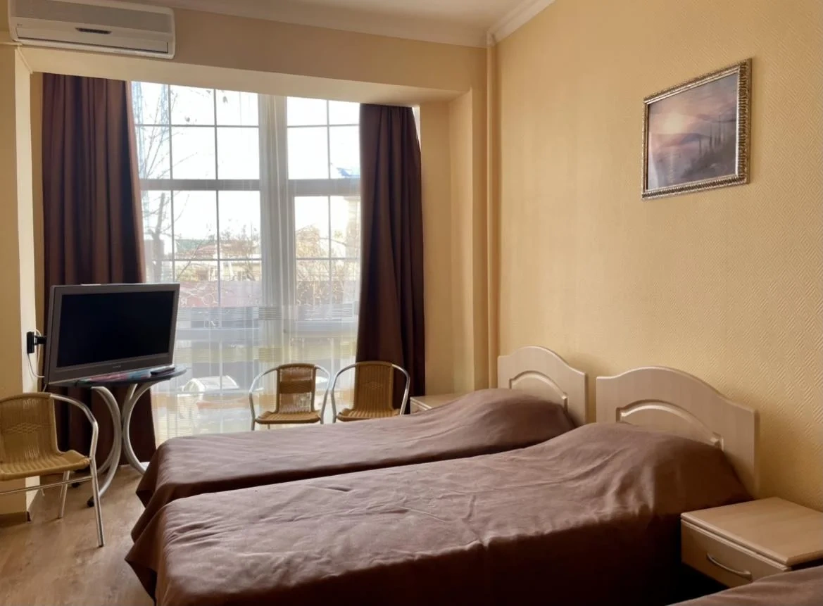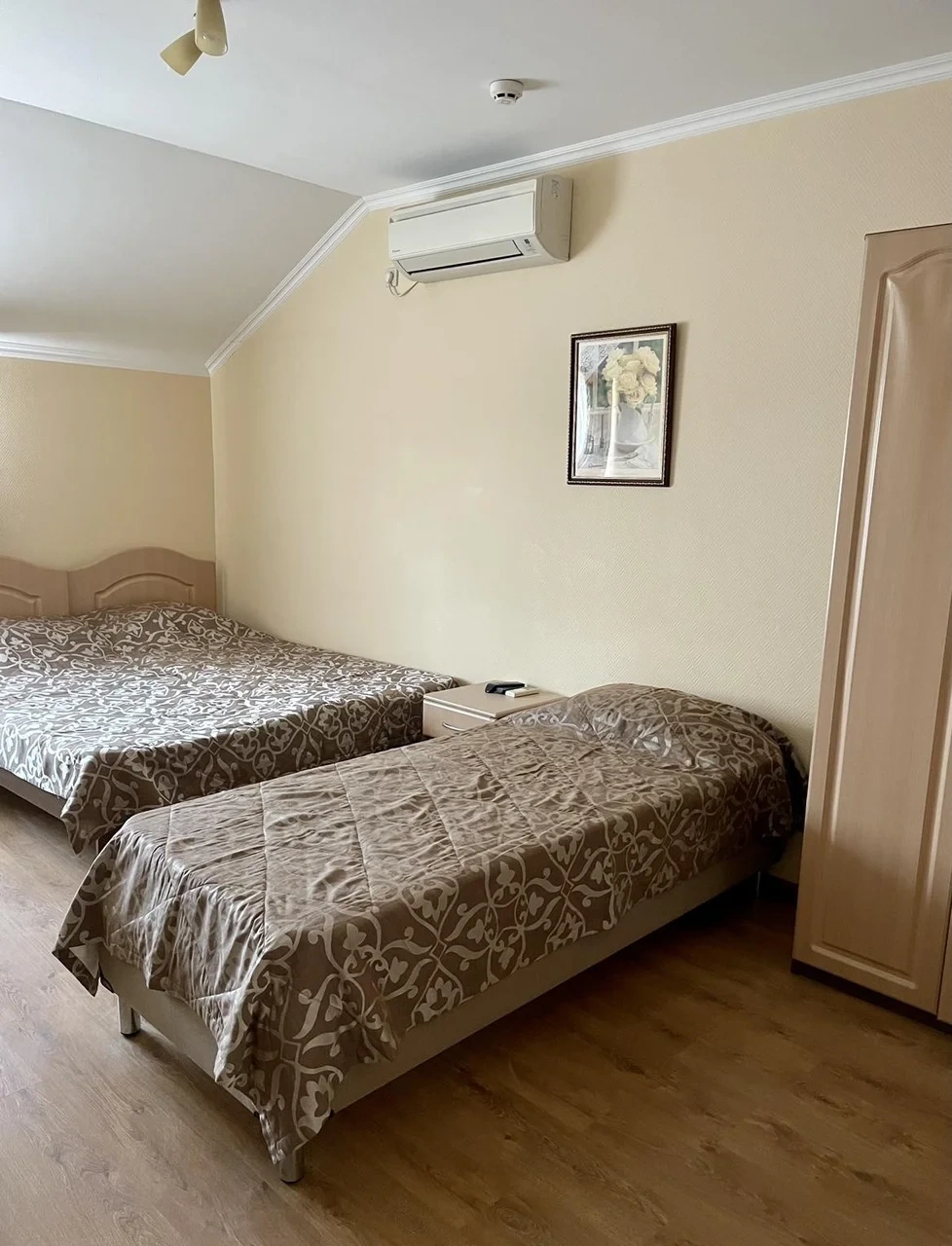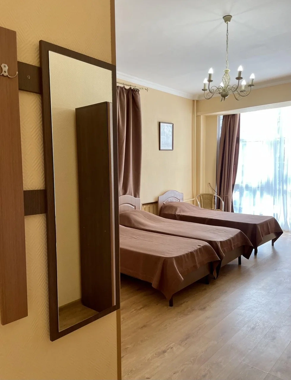 2 односпальные, или двуспальная кровать, шкаф для одежды, тумбочки, стол, стулья, зеркало, вешалка, кондиционер, телевизор, холодильник на этаже, гладильная доска с утюгом на этаже, собственный санузел с душем, туалетная бумага, wi-fi (входит в стоимость) еврораскладушка