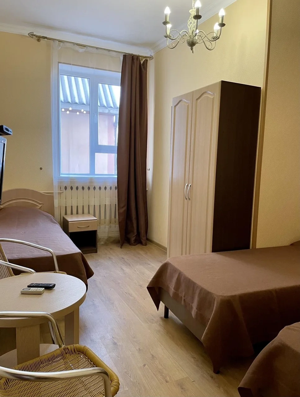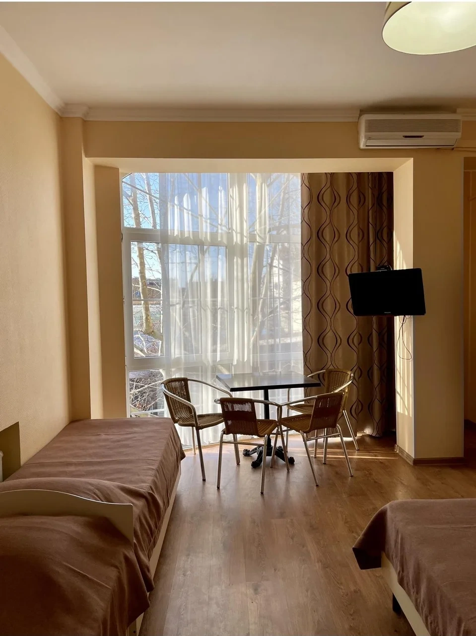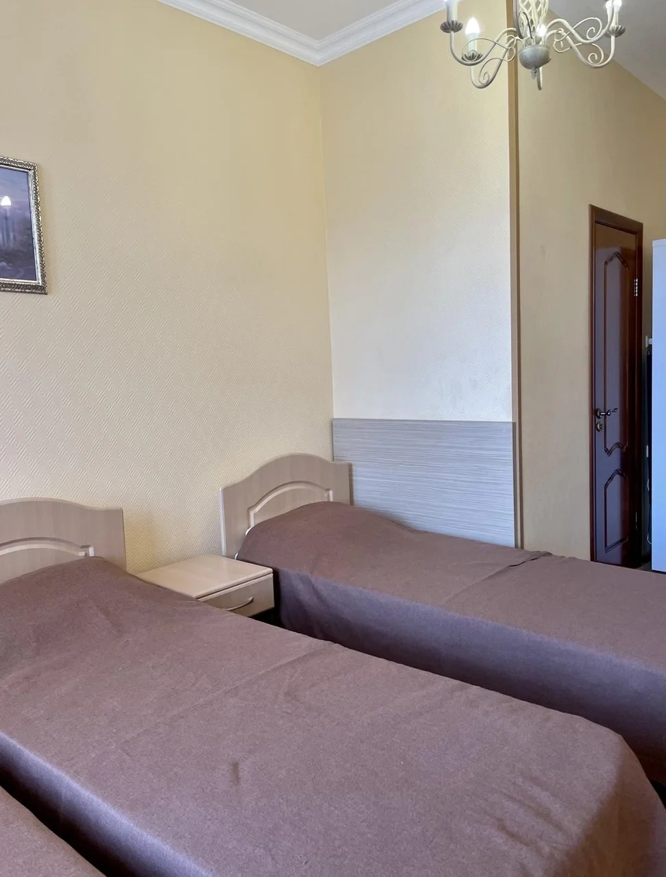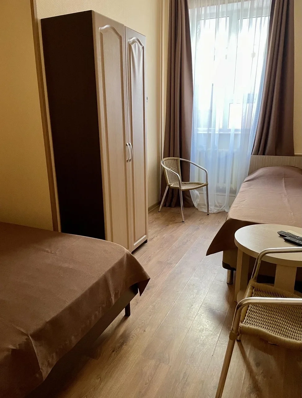 2 односпальные, или двуспальная кровать, шкаф для одежды, тумбочки, стол, стулья, зеркало, вешалка, кондиционер, телевизор, холодильник на этаже, гладильная доска с утюгом на этаже, собственный санузел с душем, туалетная бумага, wi-fi (входит в стоимость) еврораскладушка