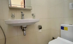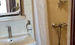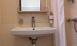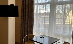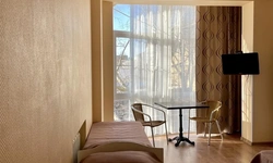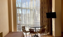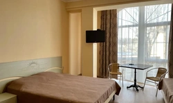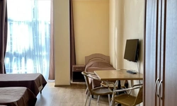 двуспальная и односпальные кровати, шкаф для одежды, тумбочки, стол, стулья, зеркало, вешалка, кондиционер, телевизор, холодильник на этаже, гладильная доска с утюгом на этаже, собственный санузел с душем, туалетная бумага, wi-fi (входит в стоимость), еврораскладушка