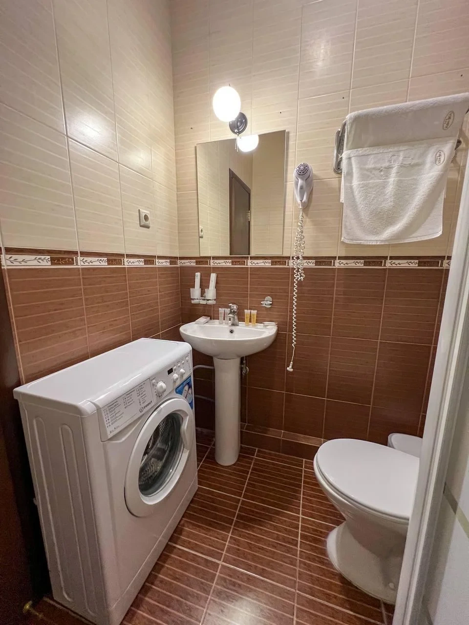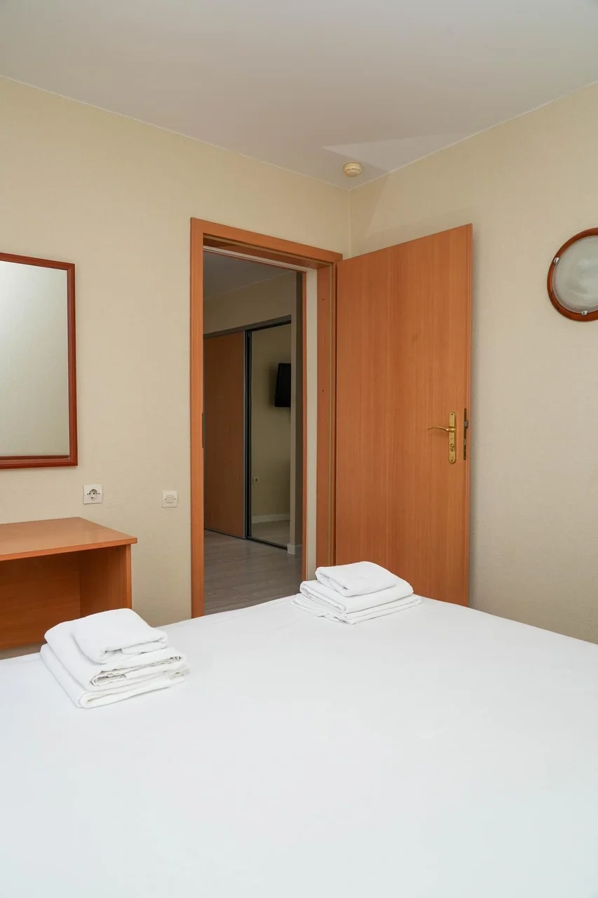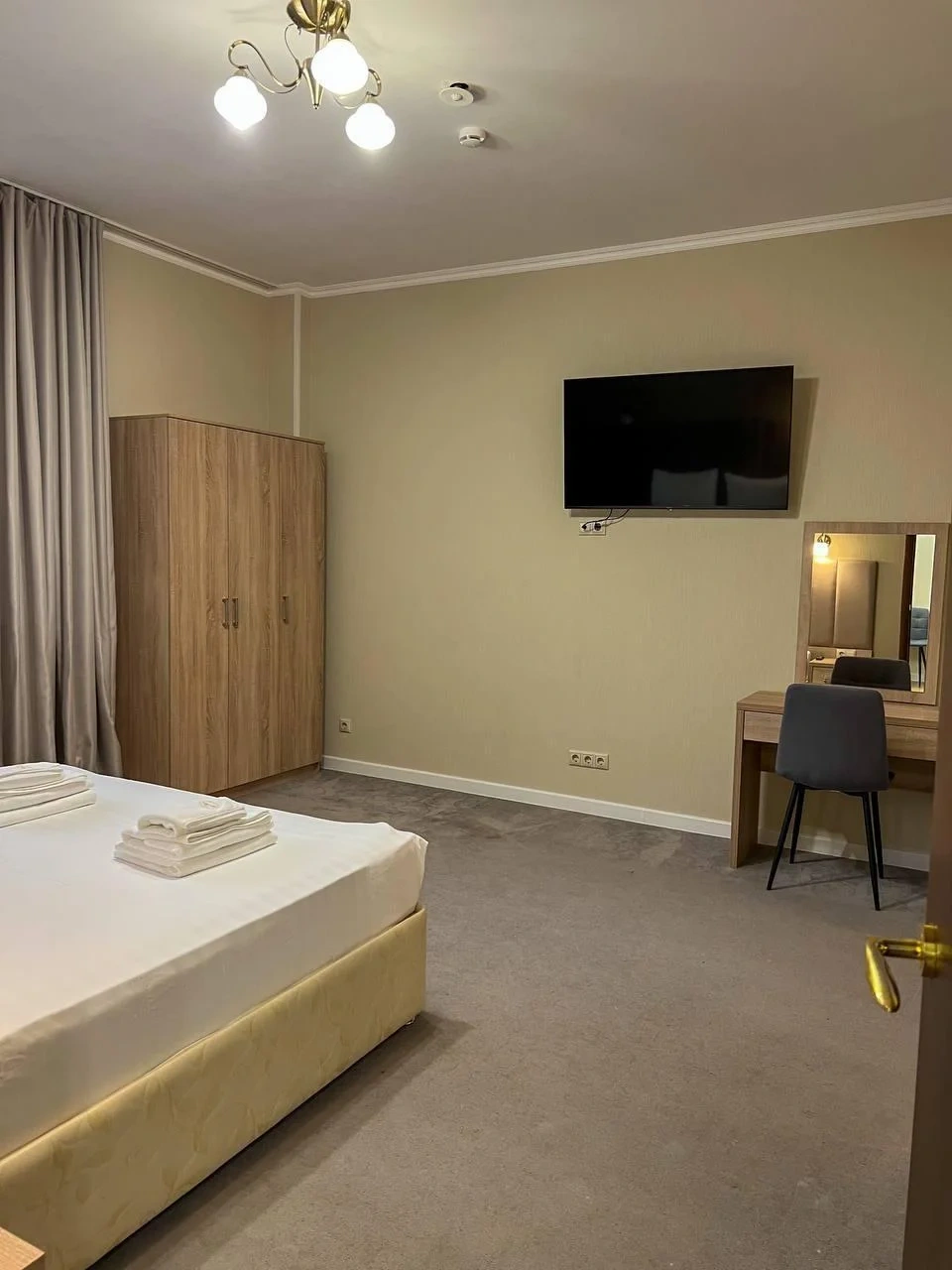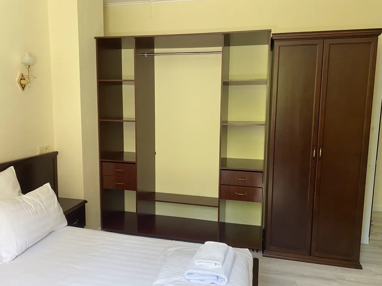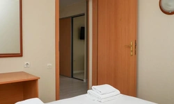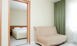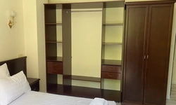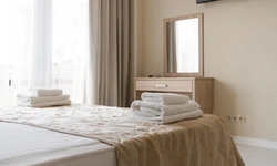 Гостиная: кухня - одноместный диван, стол, стулья, сплит-система, холодильник, микроволновая печь, чайная станция, вода, электроплита, посуда. 1 спальня: двуспальная кровать, две прикроватные тумбочки, столик с зеркалом, шкаф для одежды, телевизор, сплит-система, балкон. 2 спальня: двуспальная кровать, две прикроватные тумбочки, столик с зеркалом, шкаф для одежды, телевизор, сплит-система, балкон. Санузел: душевая кабина, стиральная машина, фен, полотенце, мыло/шампунь. Коридор: шкаф, гладильная доска, утюг, тапочки, халаты. Балкон: сушилка для белья, стулья и столик. Общая площадь номера 60 кв.м.