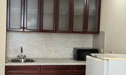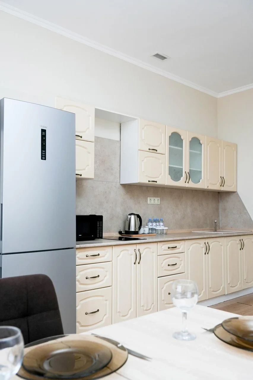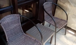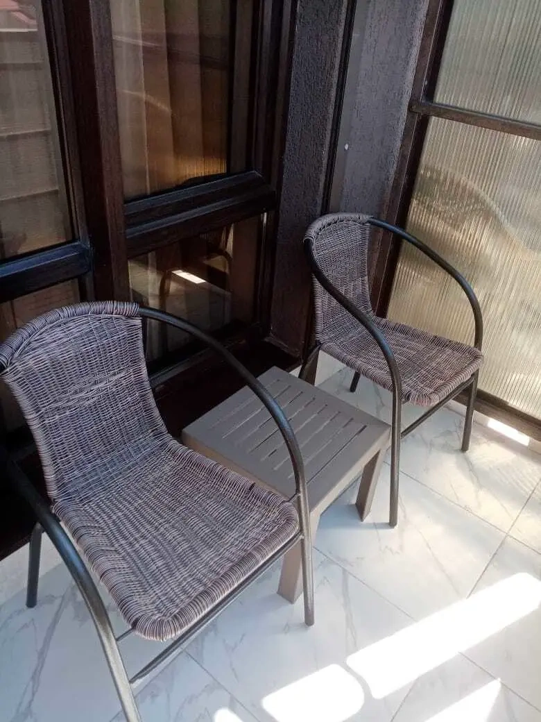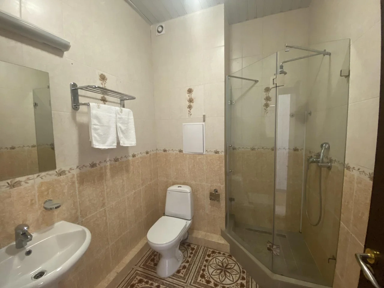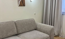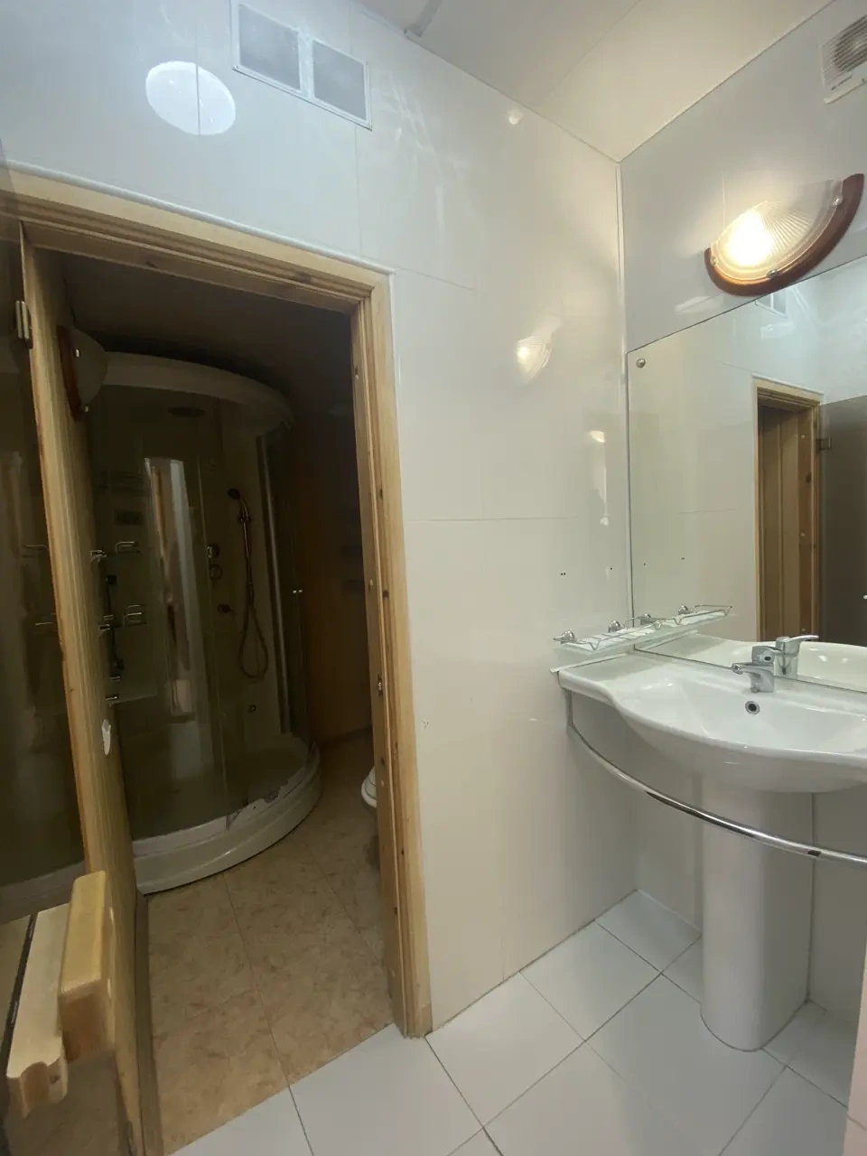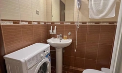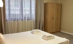 Гостиная: кухня - одноместный диван, стол, стулья, сплит-система, холодильник, микроволновая печь, чайная станция, вода, электроплита, посуда. 1 спальня: двуспальная кровать, две прикроватные тумбочки, столик с зеркалом, шкаф для одежды, телевизор, сплит-система, балкон. 2 спальня: двуспальная кровать, две прикроватные тумбочки, столик с зеркалом, шкаф для одежды, телевизор, сплит-система, балкон. Санузел: душевая кабина, стиральная машина, фен, полотенце, мыло/шампунь. Коридор: шкаф, гладильная доска, утюг, тапочки, халаты. Балкон: сушилка для белья, стулья и столик. Общая площадь номера 60 кв.м.