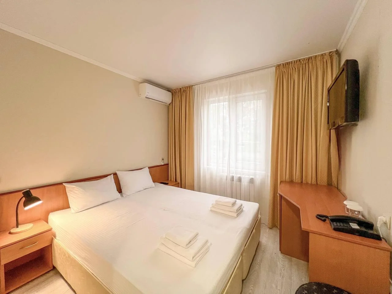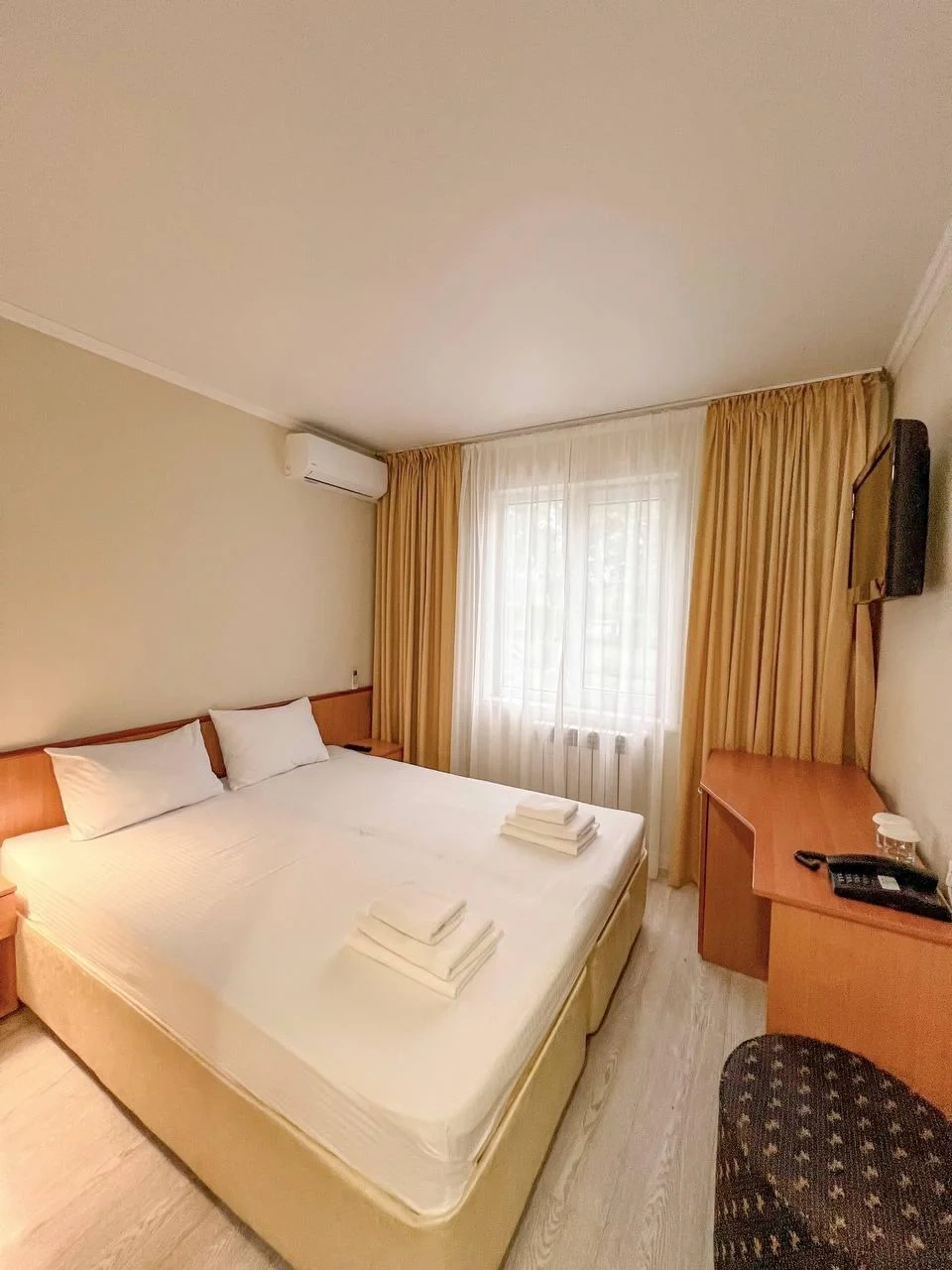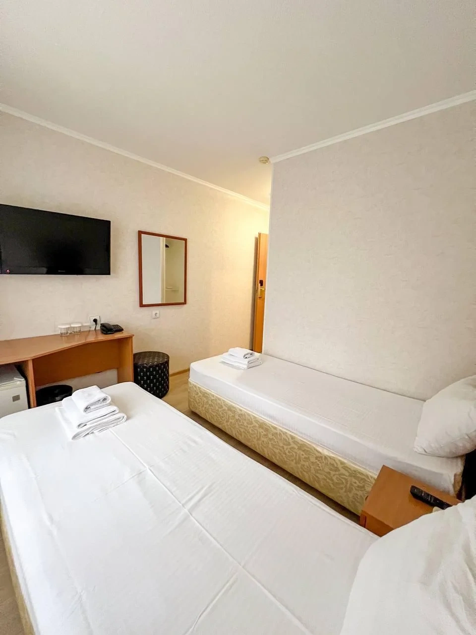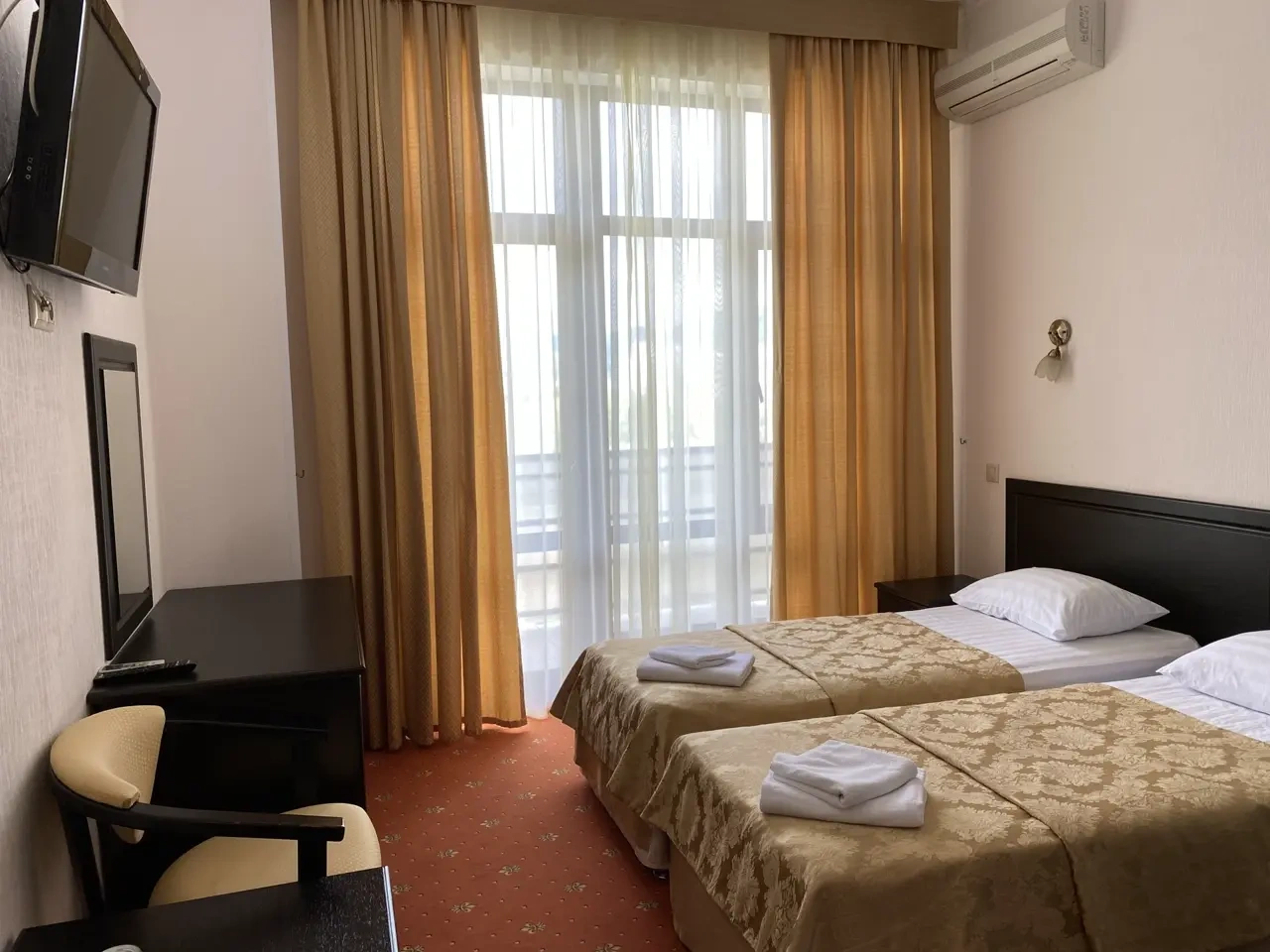 В номере: двуспальная или 2 раздельные кровати, 2 прикроватные тумбочки, столик с зеркалом, сплит-система, телефон, телевизор, мини бар, санузел, полотенца, мыло/шампунь. Общая площадь номера 12 кв.м.