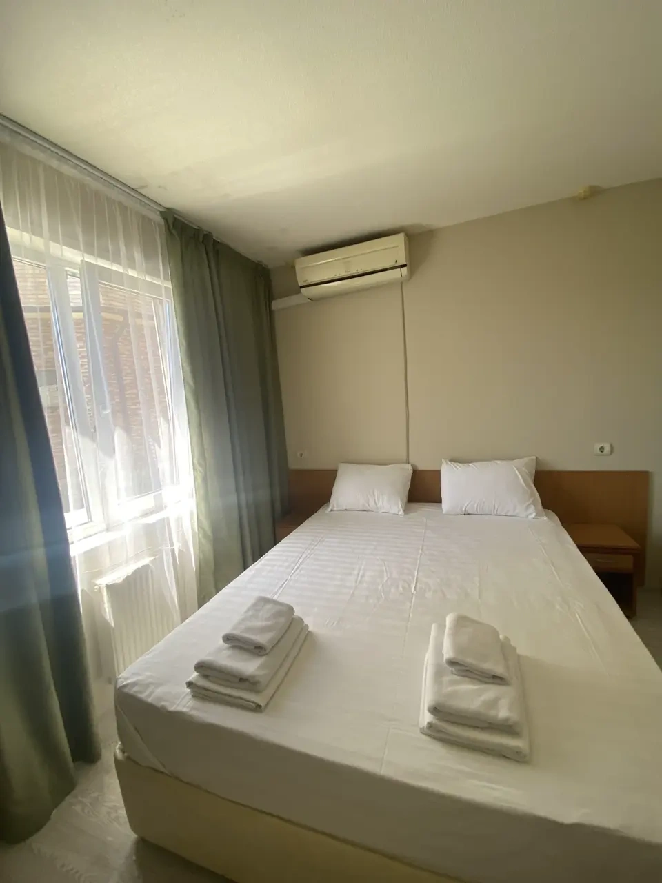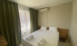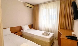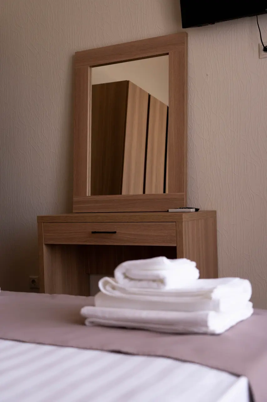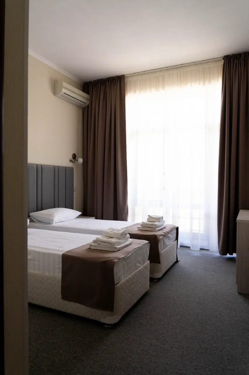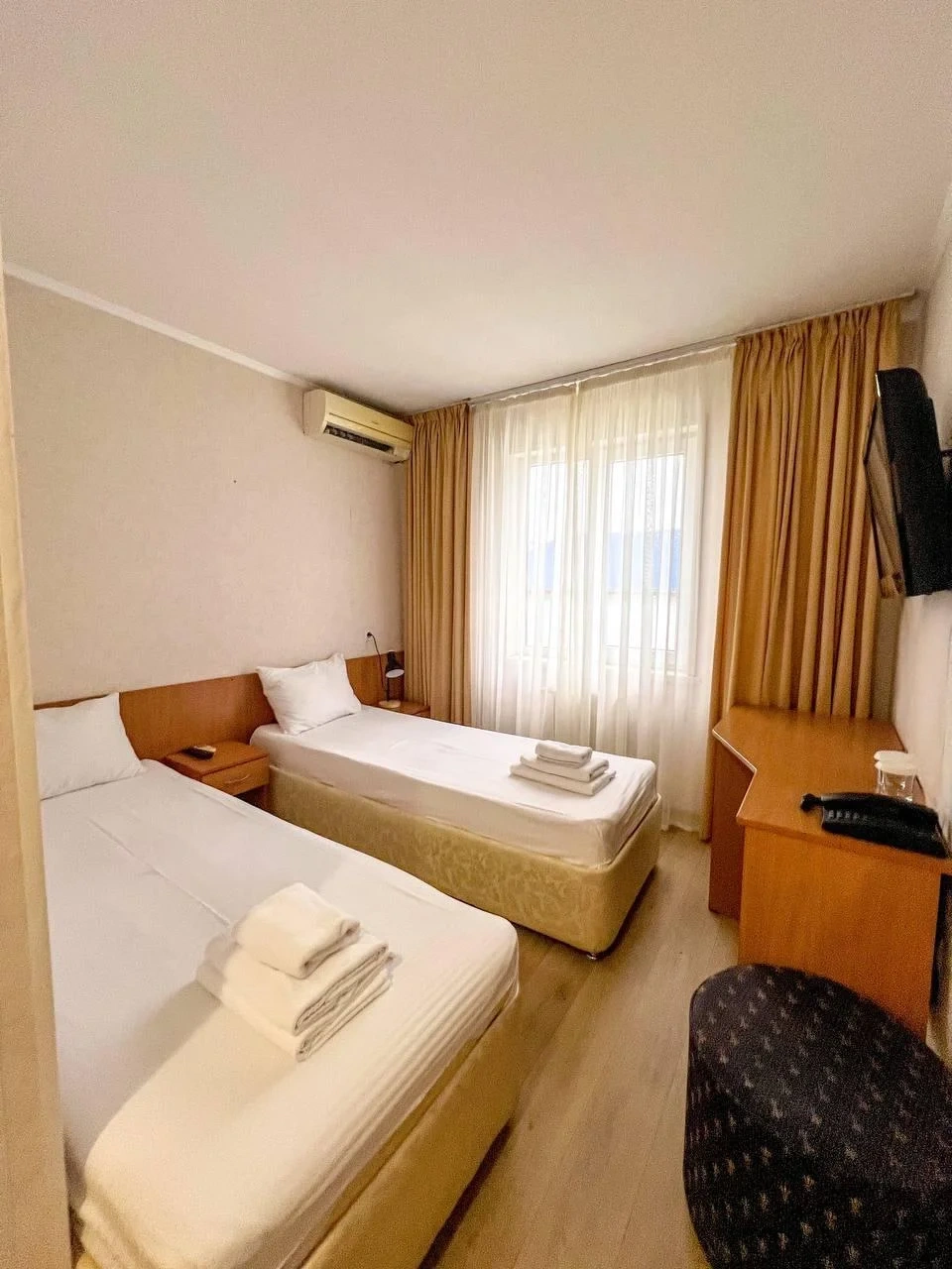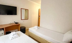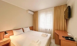 В номере: двуспальная или 2 раздельные кровати, 2 прикроватные тумбочки, столик с зеркалом, сплит-система, телефон, телевизор, мини бар, санузел, полотенца, мыло/шампунь. Общая площадь номера 12 кв.м.