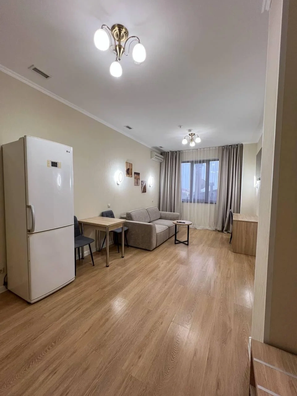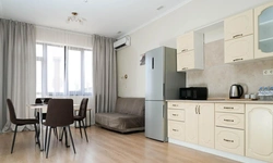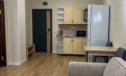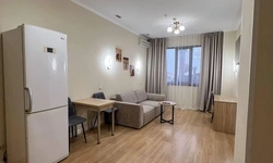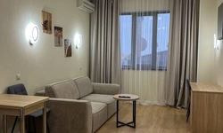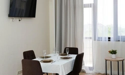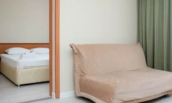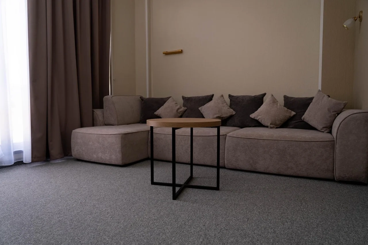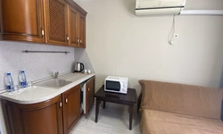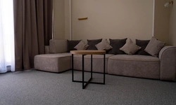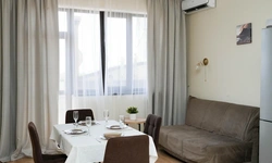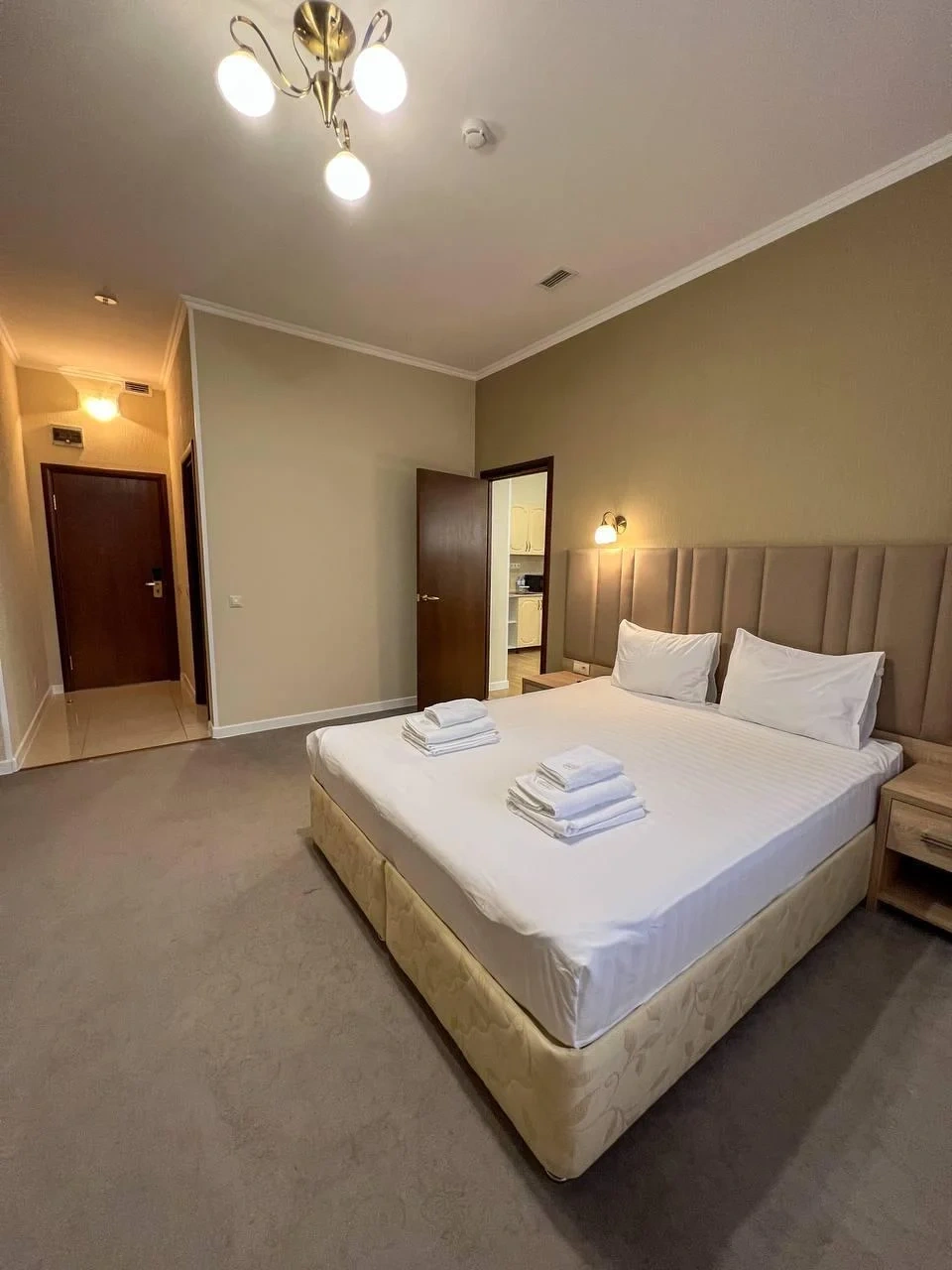 Гостиная: кухня - 2-х местный диван кровать, столик, стулья, микроволновая печь, электрическая плита, сплит-система, холодильник, чайная станция, вода, телефон. Спальня: двуспальная кровать, две прикроватные тумбочки, телефон, столик с зеркалом, шкаф для одежды, сплит-система, тапочки, халаты, гладильная доска, утюг. Санузел: душевая кабина, фен, стиральная машинка, полотенца, мыло/шампунь. Общая площадь номера 40 кв.м.