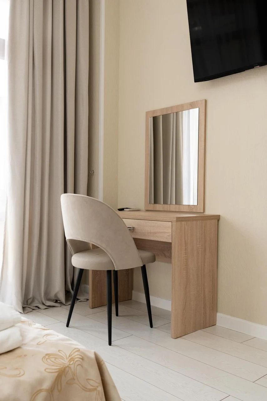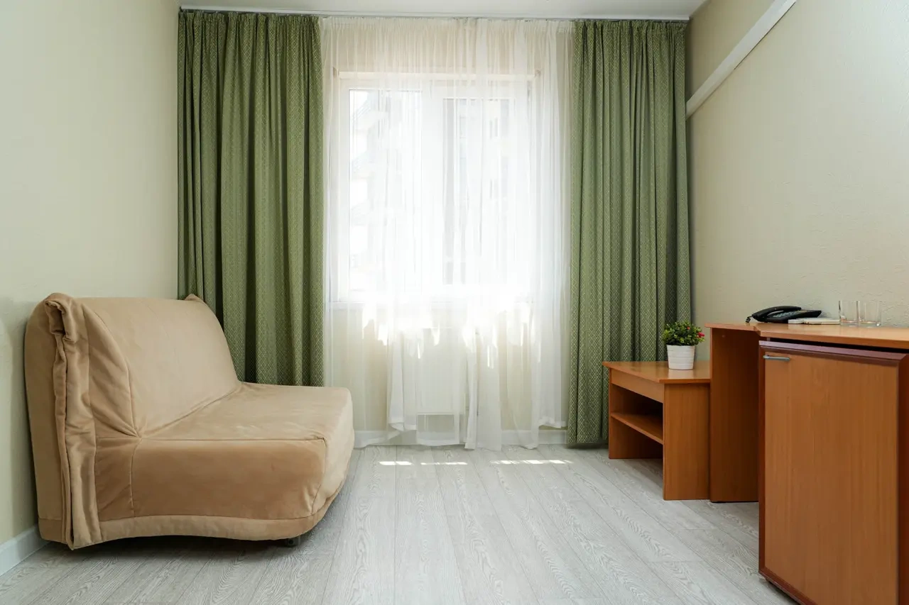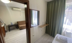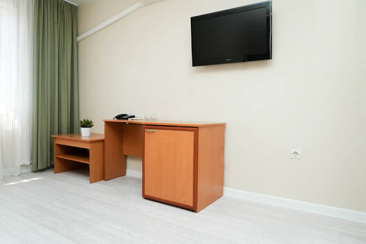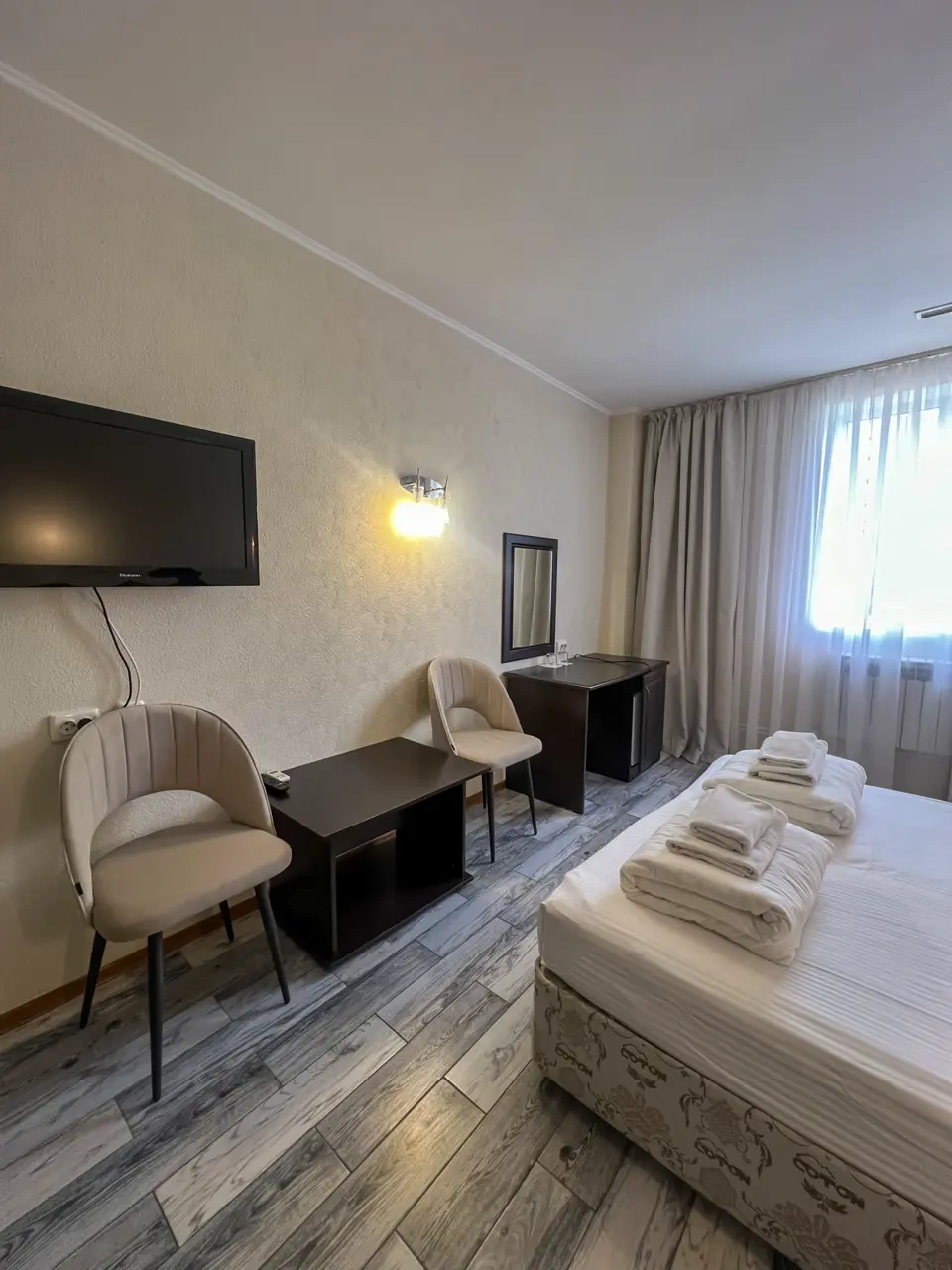 В номере: двуспальная или 2 раздельные кровати, 2 прикроватные тумбочки, столик с зеркалом, шкаф для одежды, сплит-система, телефон, телевизор, мини бар, фен, санузел, полотенце, мыло/шампунь. Предусмотрено дополнительное место (одноместный раскладной диван). Общая площадь номера 25 кв.м.